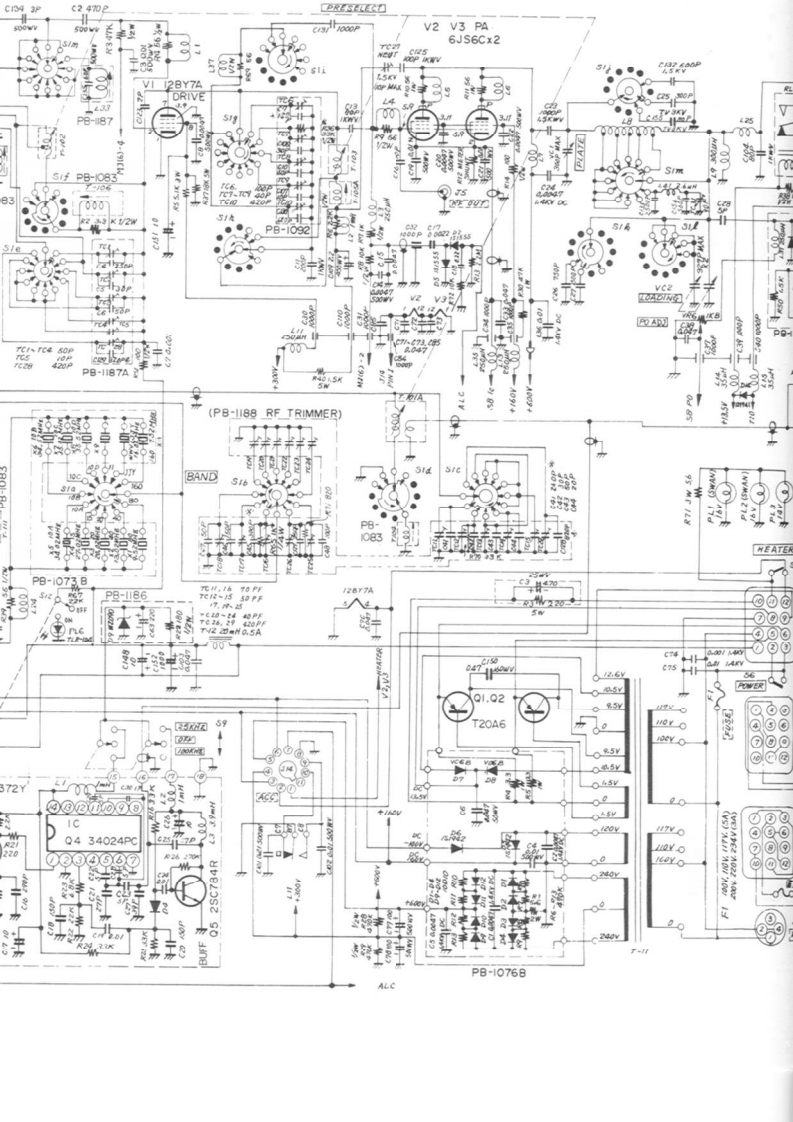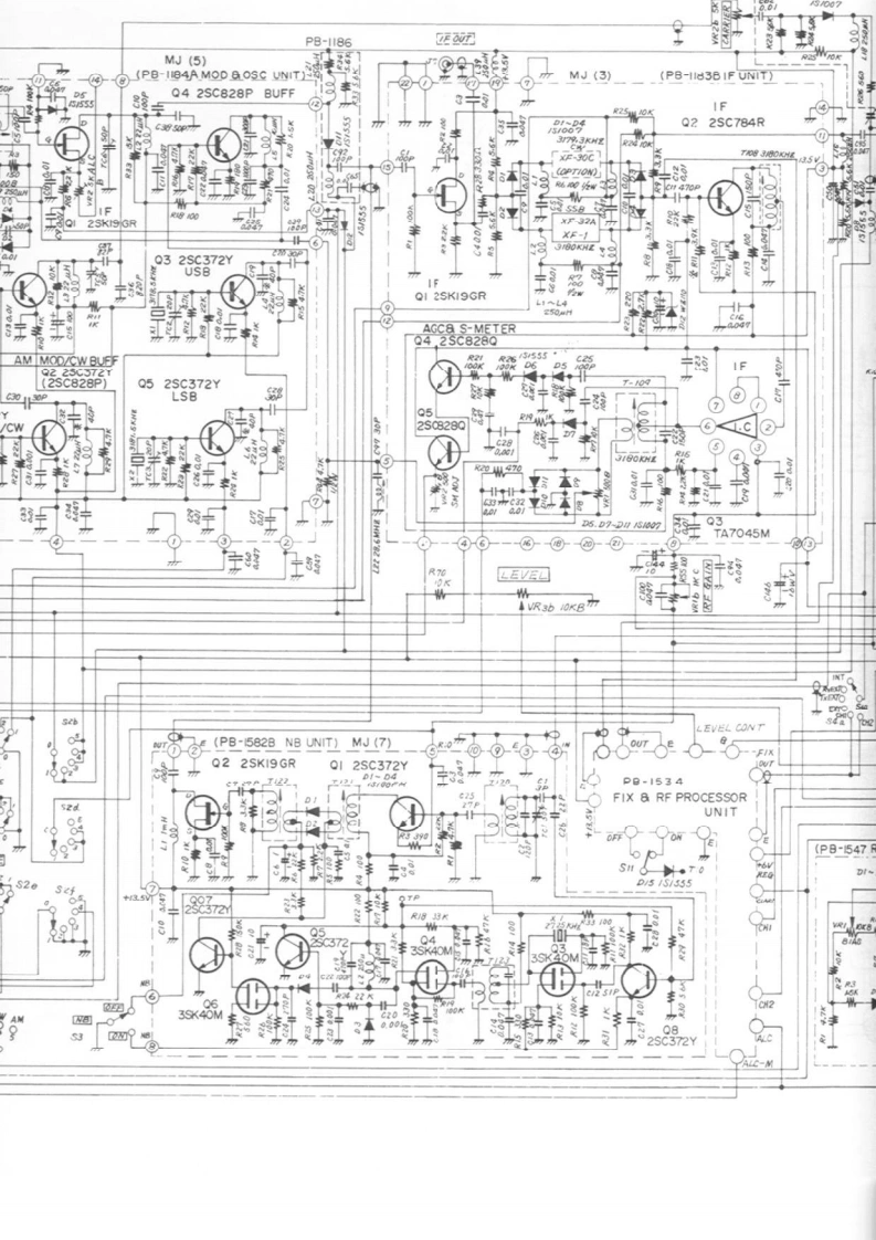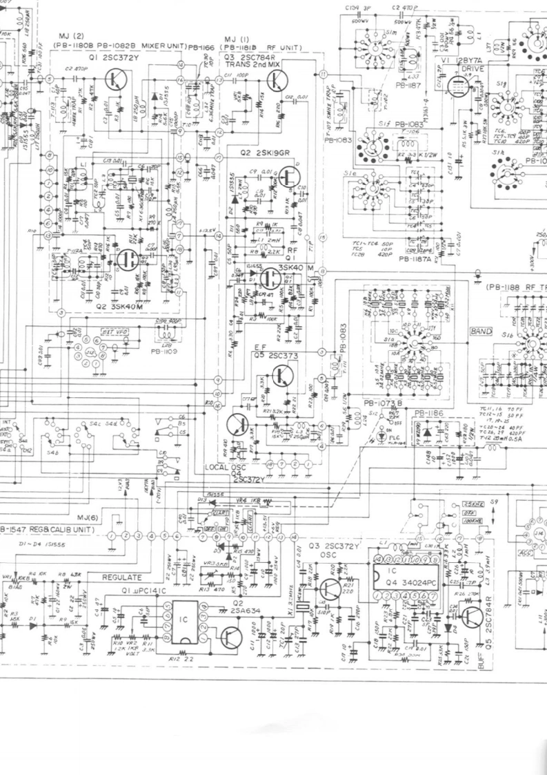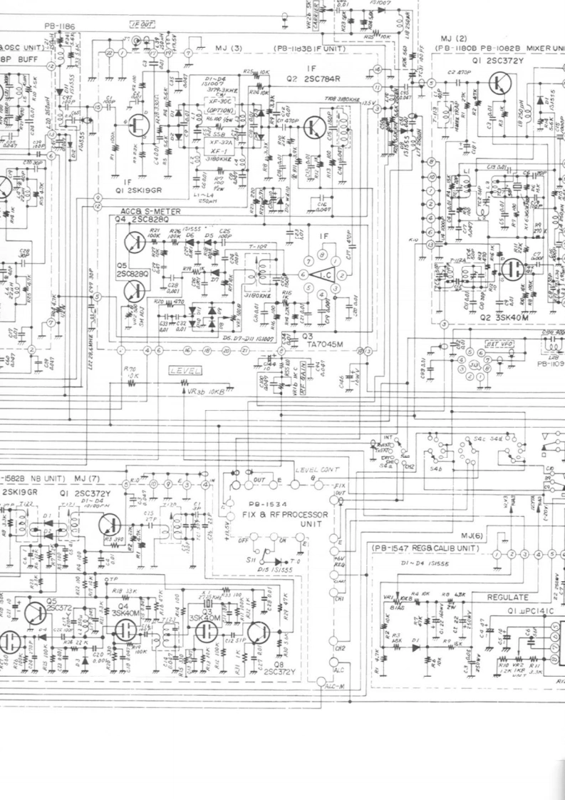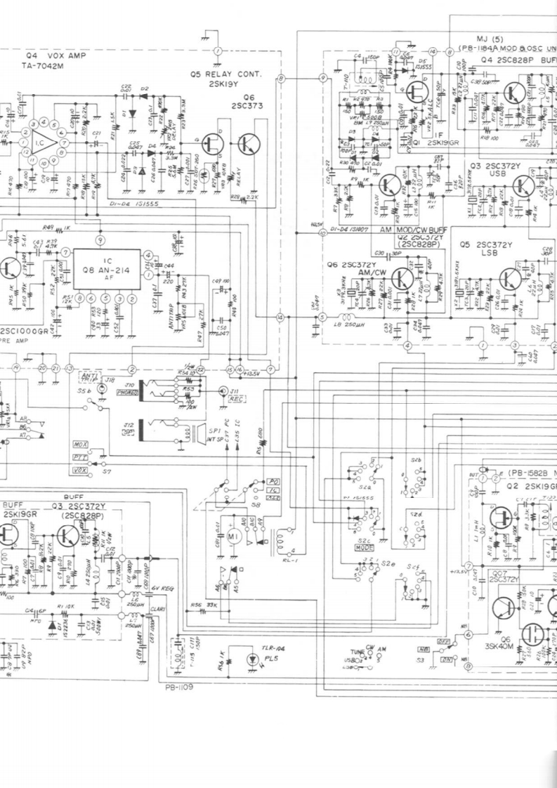 (PB-1315 AF UNIT)MJ(4)J4 EAICHOI MIC AMPQ2 MIC AMP 03 E.FQ4 VOX AMP32SKI9GR2SC372Y2SC372YTA-7042M(2SC828P)(2sC828PO5 RELA2SKT3 MIC0-04515550>49TONE(2SC828Q】ICQ8AN-2143中440Q9 2SC1000GRPRE AMPGIDE TONE9JAF INQDa-IR?M0☒57NOTESVFO OSCBUFFQ3 2SC372YAIL RESISTORS ARE IN I/4WQI 2SKI9GR 02 2SKISGR(2SC828P)UNLESS OTHERWISE NOTED2.ALL CAPACITORS ARE IN UFUNLESS OTHRWISE NOTED.3 ALL ELECTROLYTIC CAPACITORSAREI6WVUNLESS OTHRWISE NOTED.4 X VALUE IS NOMINAL56FT-IOIECIRCUIT DIAGRAM(PB-I056)