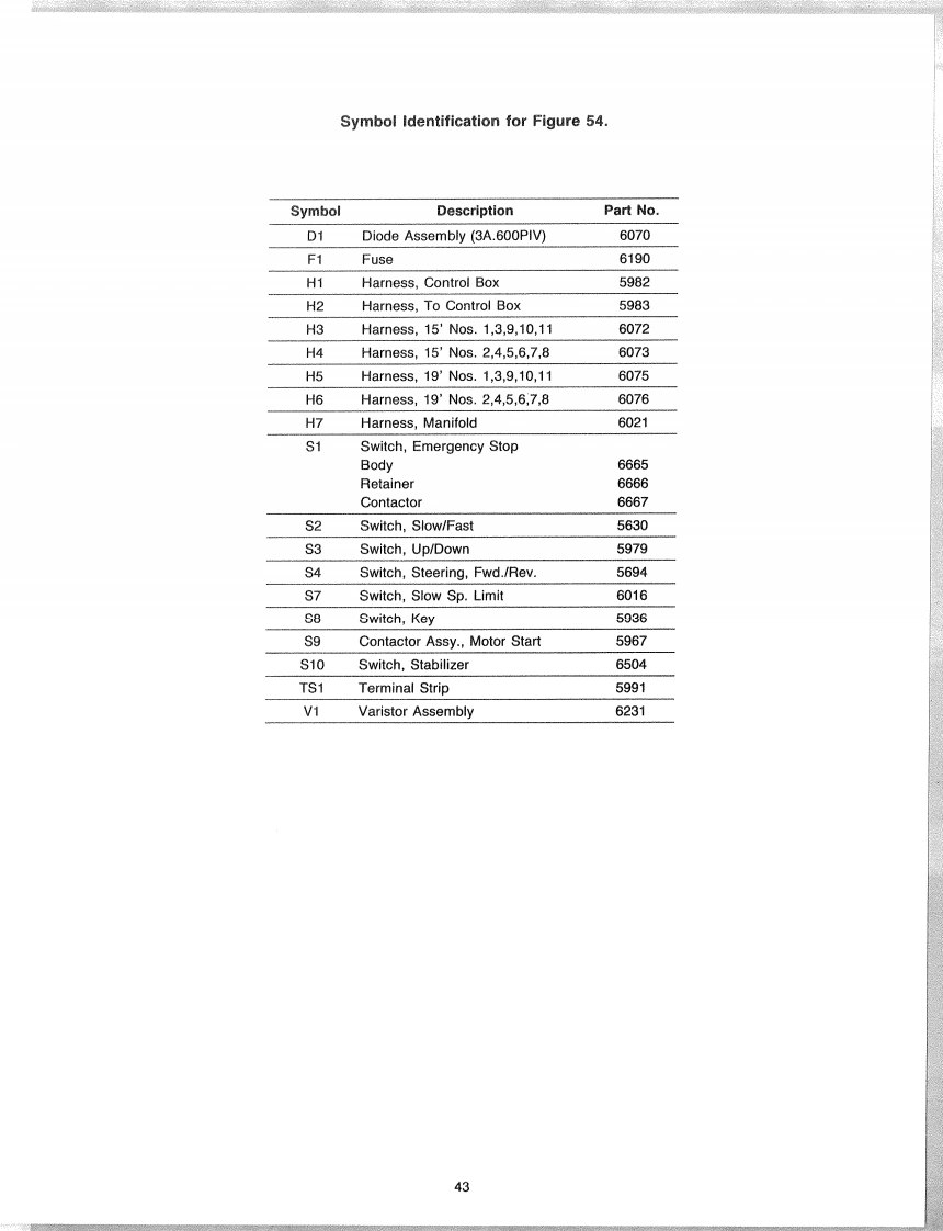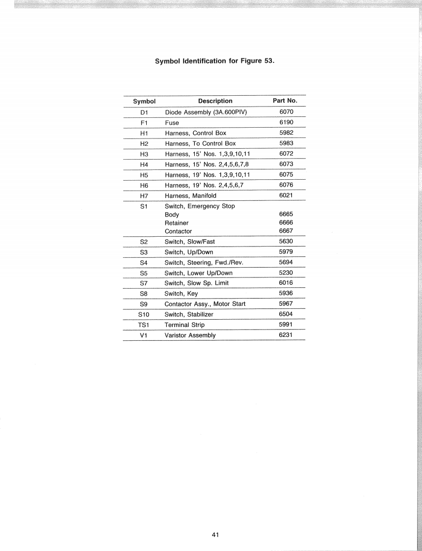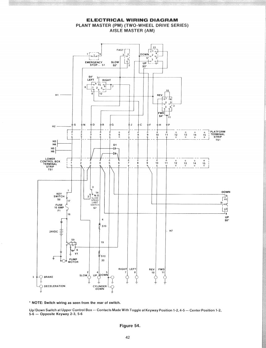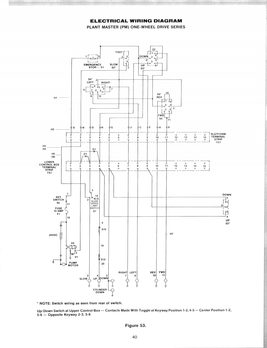 ELECTRICAL WIRING DIAGRAMBATTERY MANUAL PLANT MASTER SERIESDOWN5PLATFORMCONTROLS5.02/4CYLINDERDOWN SOL日g:888g日8gKEYSWITCH38STABILIZER SWITCHESDOWN「。5551CONTACTORS9UPSOLENOIDFigure 52.NOTE:Switch wiring as seen from rear of switch.SymbolDescriptionPart No.F1Fuse 10 AMP6190S5Switch,Up/Down5230S8Key Switch5936S9Contactor5967S10Stabilizer Switch6504TS1Terminal Strip599139
