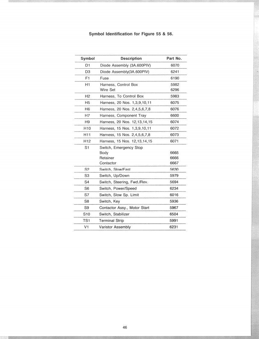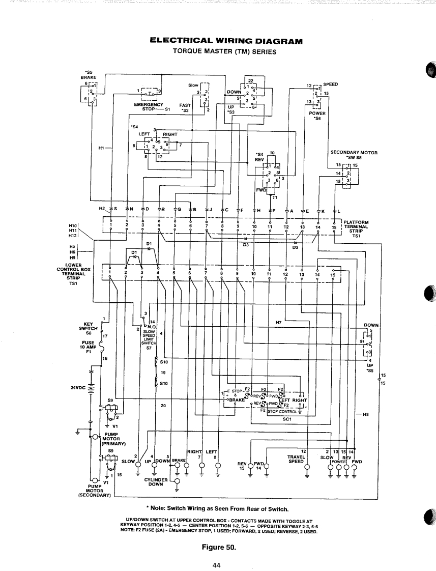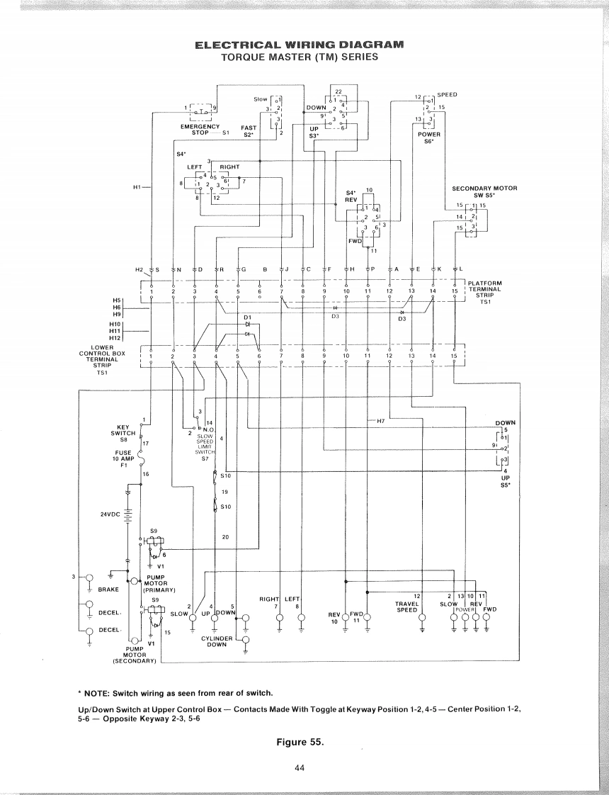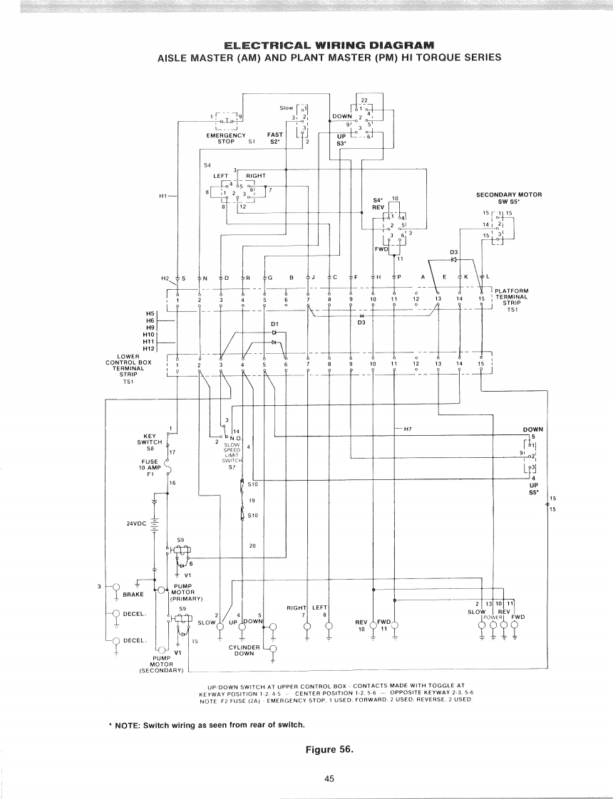 ELECTRICAL WIRING DIAGRAMBATTERY MANUAL PLANT MASTER SERIESDOWN5PLATFORMCONTROLS5.02/4CYLINDERDOWN SOL日g:888g日8gKEYSWITCH38STABILIZER SWITCHESDOWN「。5551CONTACTORS9UPSOLENOIDFigure 52.NOTE:Switch wiring as seen from rear of switch.SymbolDescriptionPart No.F1Fuse 10 AMP6190S5Switch,Up/Down5230S8Key Switch5936S9Contactor5967S10Stabilizer Switch6504TS1Terminal Strip599139
