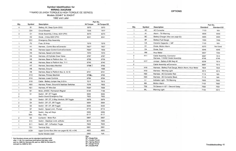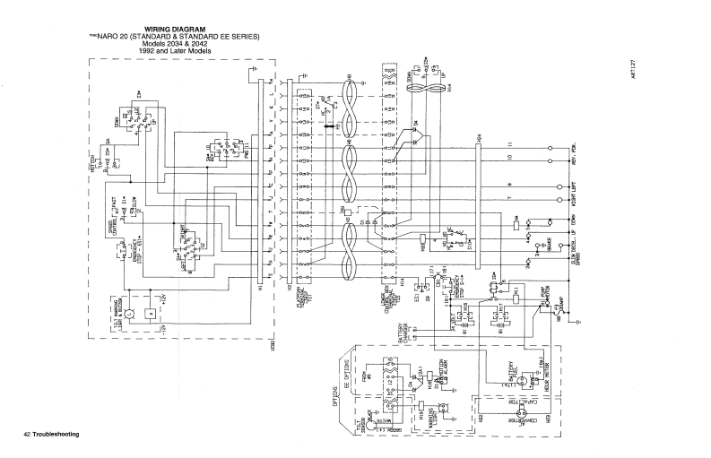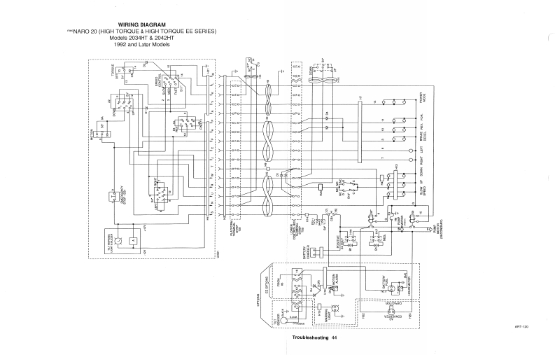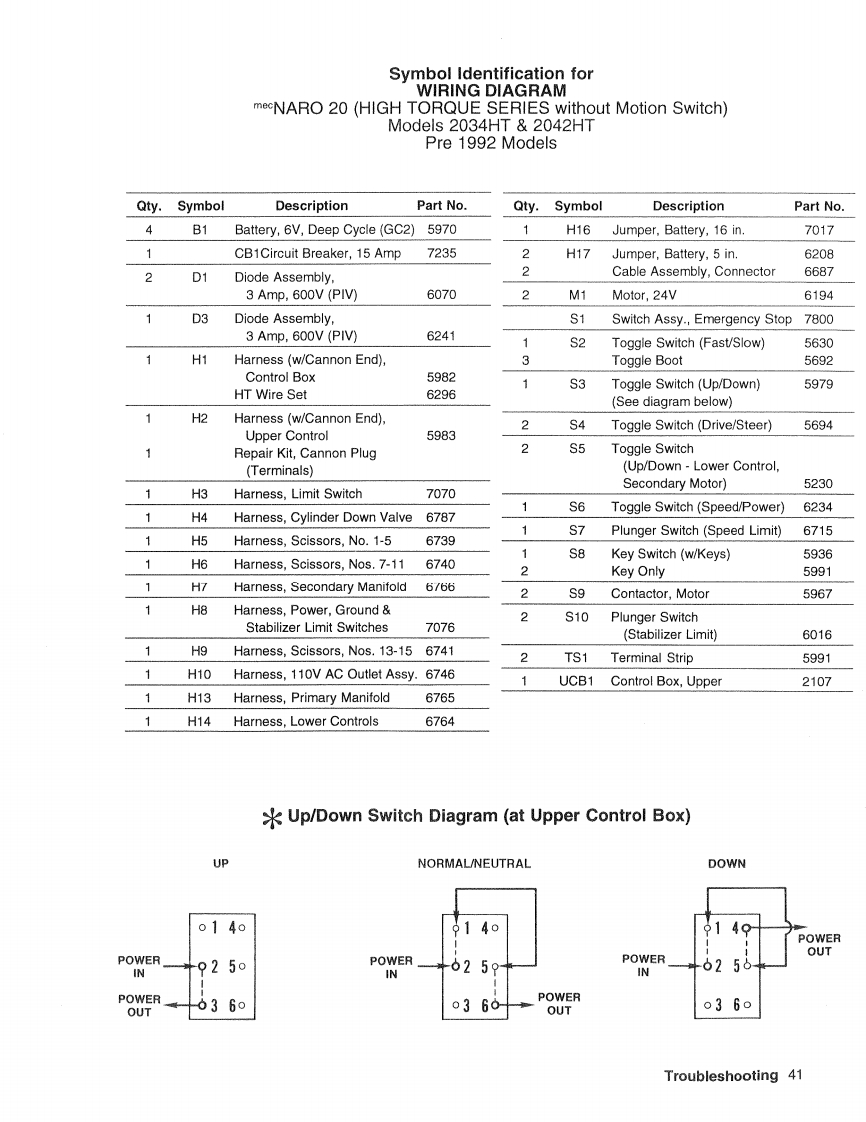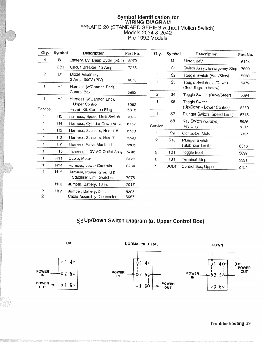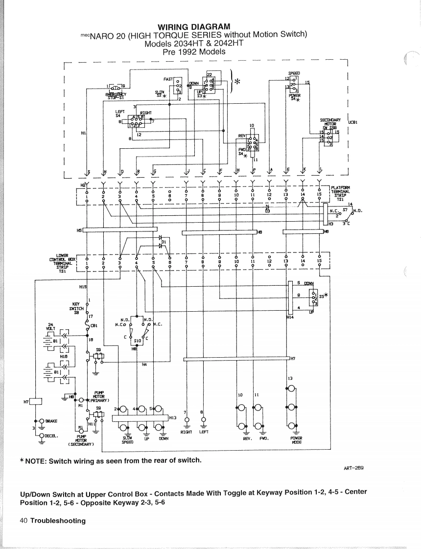 WIRING DIAGRAMmeeNARO 20(STANDARD SERIES without Motion Switch)Models2034&2042Pre 1992 ModelsFAST16o9型*2吕1294920"67.06599205H15KEY7N.兰N.Cod限an.ART-268NOTE:Switch wiring as seen from the rear of switch.Up/Down Switch at Upper Control Box-Contacts Made With Toggle at Keyway Position 1-2,4-5-CenterPosition 1-2,5-6-Opposite Keyway 2-3,5-638 Troubleshooting