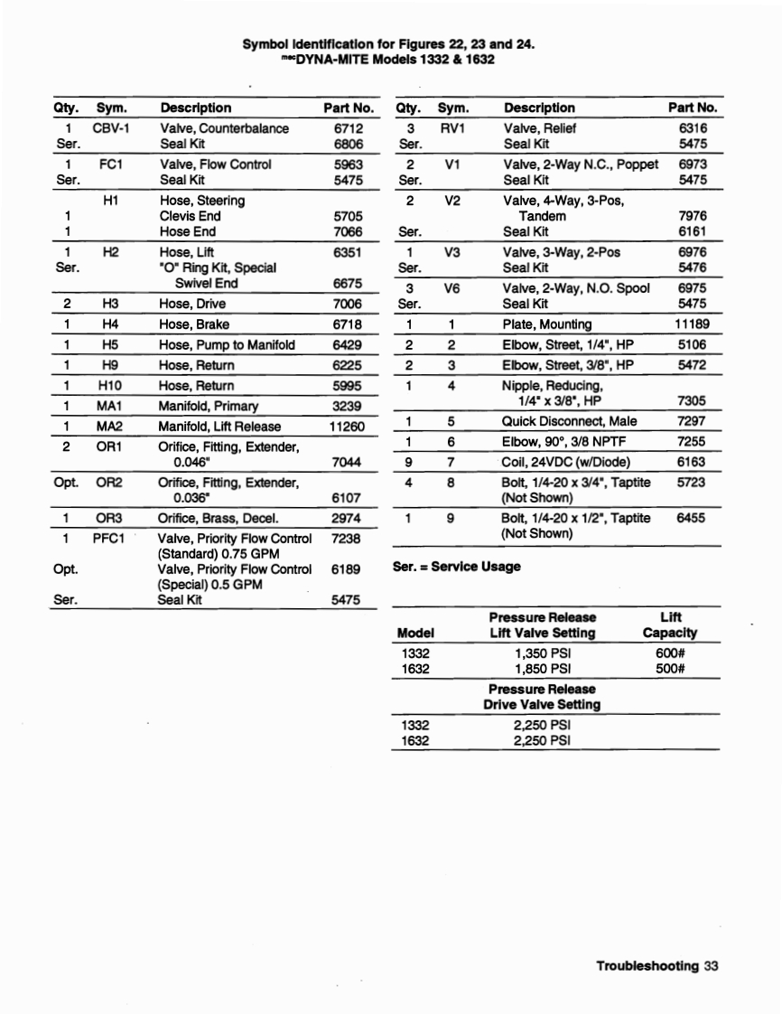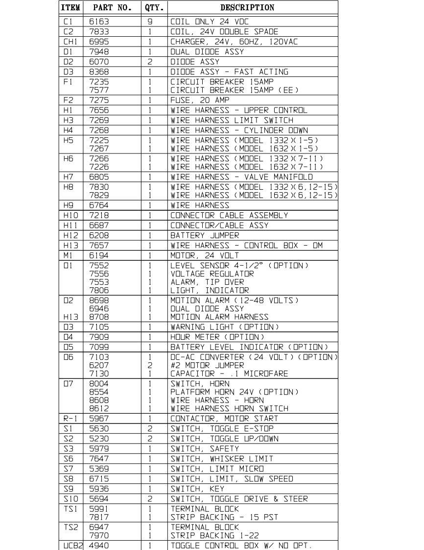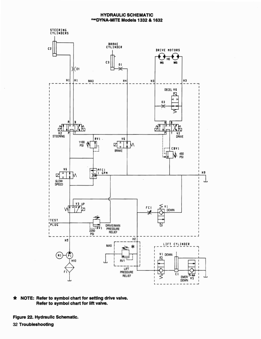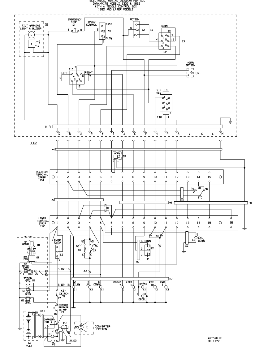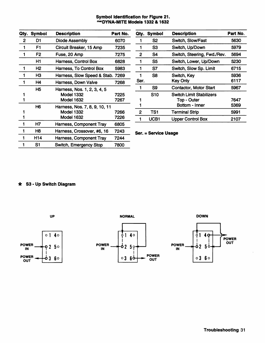 ELECTRICAL WIRING DIAGRAMm*DYNA-MITE Models 1332 1632FASTAcoCIRCUIT17[三L·电电N.O.N.OH14N.C.N.C.H7BRAKEDECELERATION*NOTE:Switch wiring as seen from the rear of switch.Up/Down Switch at Upper Control Box-Contacts Made With Toggle at Keyway Position 1-2,4-5-Center Position 1-2,5-6-Opposite Keyway 2-3,5-6Figure 21.Electrical Wiring Diagram.30 Troubleshooting