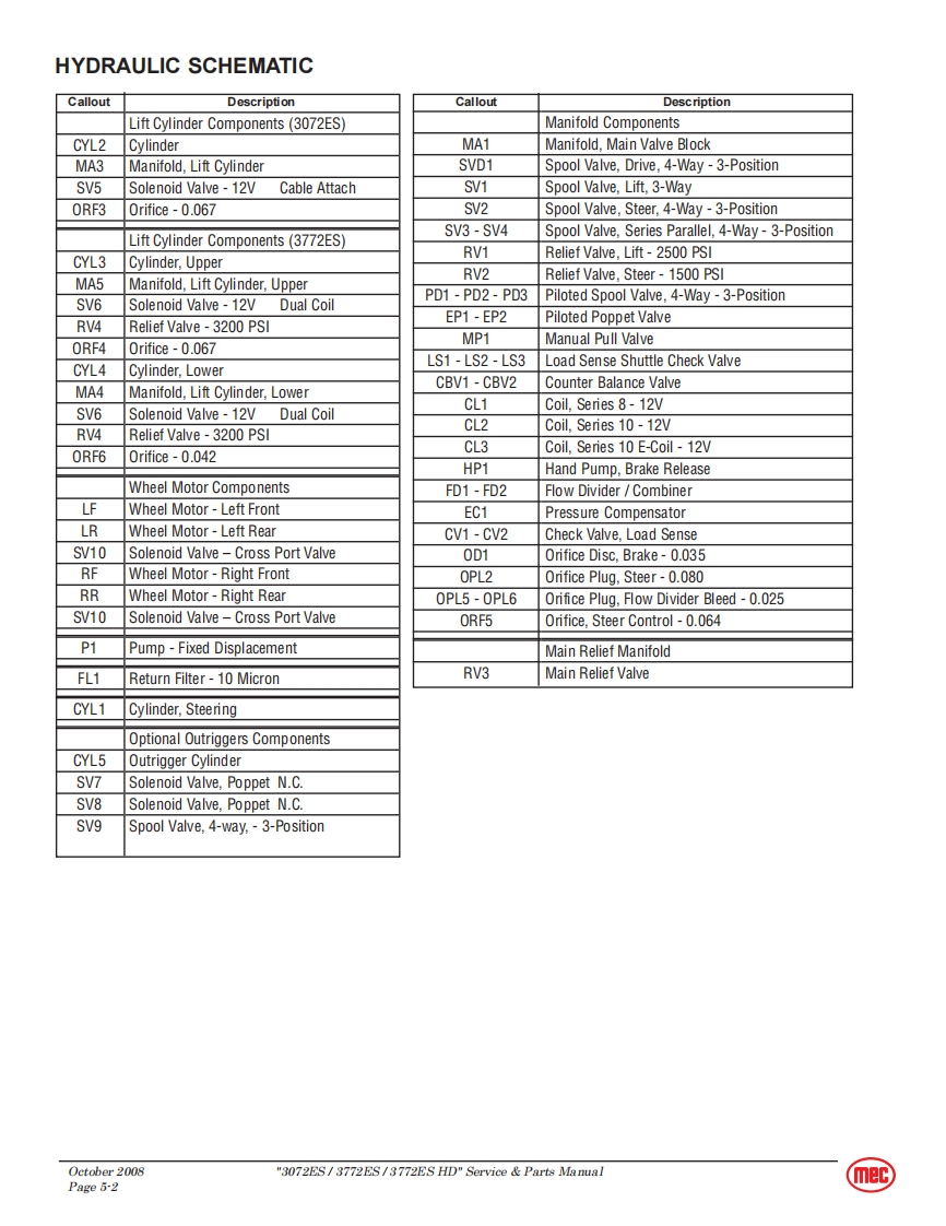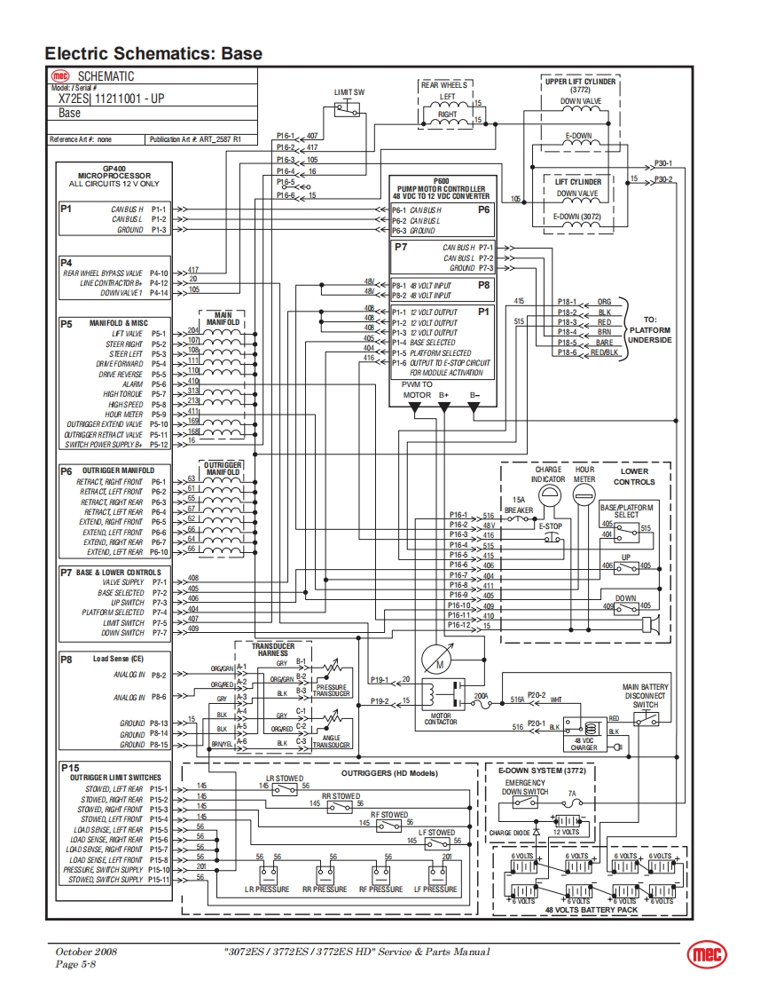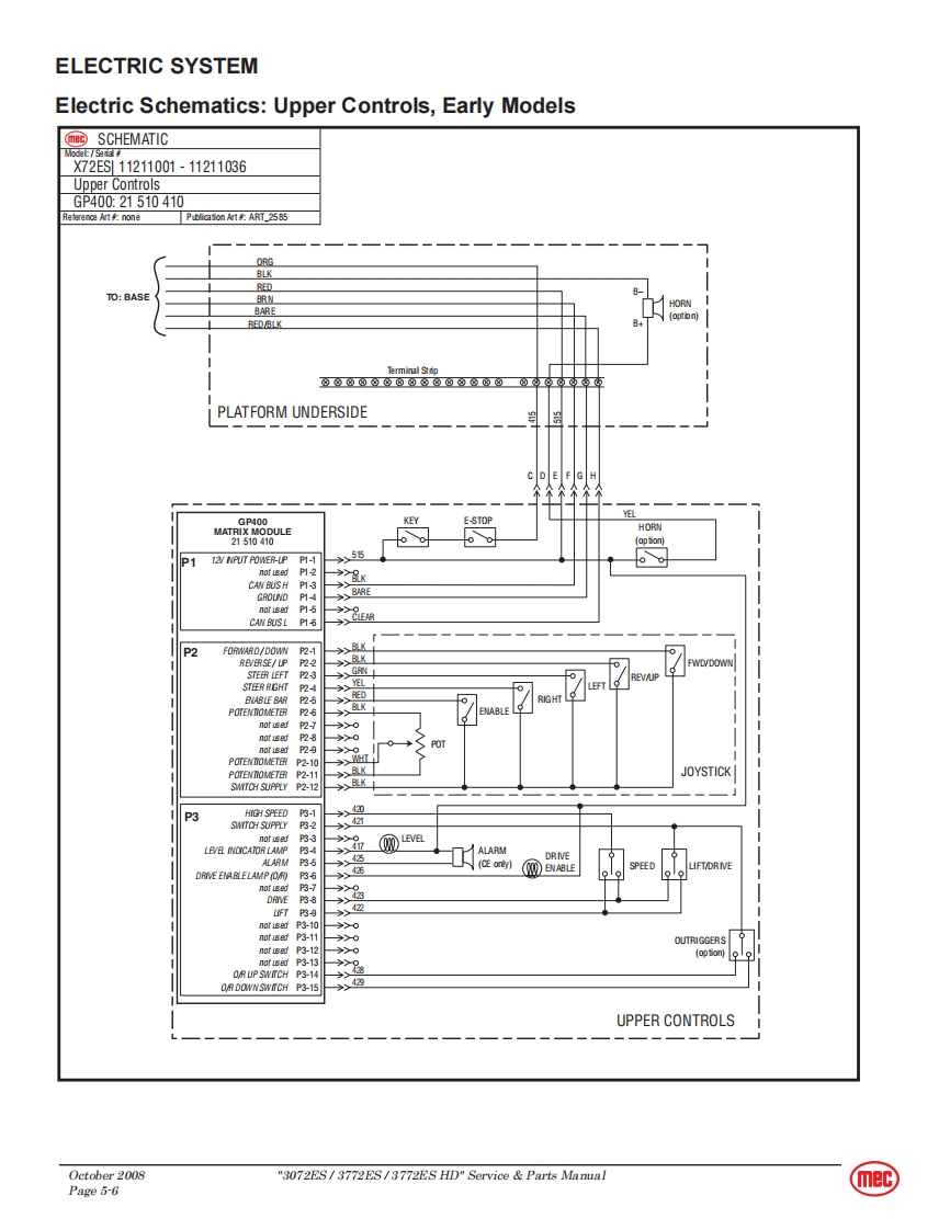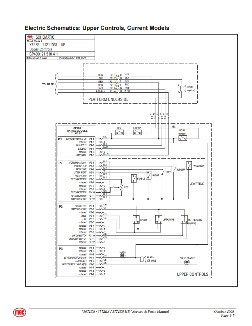 SERVICEmecSECTION 5SCHEMATICSHydraulic Schematic...............5-2Main Hydraulic Manifold.........5-4Main Relief Hydraulic Manifold.......5-5Optional Outriggers Hydraulic Manifold5-5Electric System5-6Electric Schematics:Upper Controls,Early Models....................5-6Electric Schematics:Upper Controls,Current Models..........................5-7Electric Schematics:Base.5-8P600 Motor Control Module................…5-9GP400 Matrix Module.…5-10Matrix Module Controller................5-11mec"3072ES/3772ES /3772ES HD Service Parts ManualOctober 2008Page 5-1