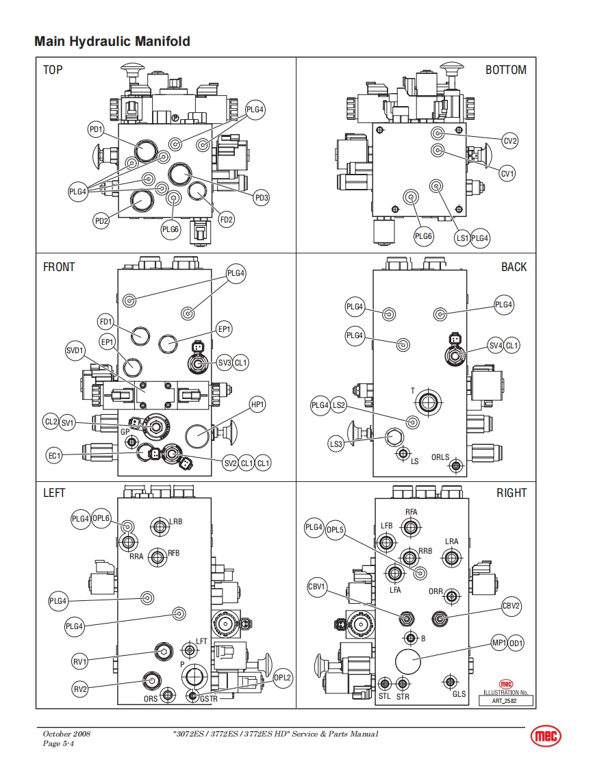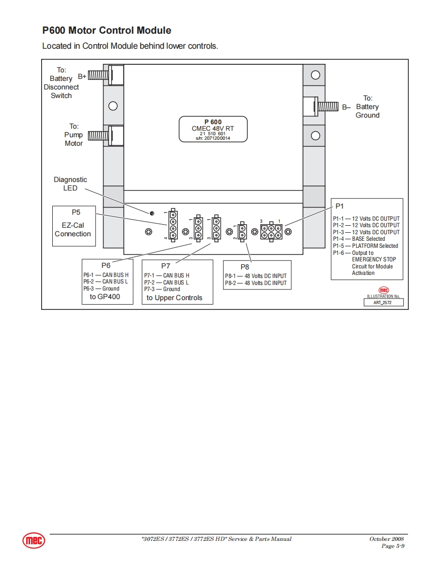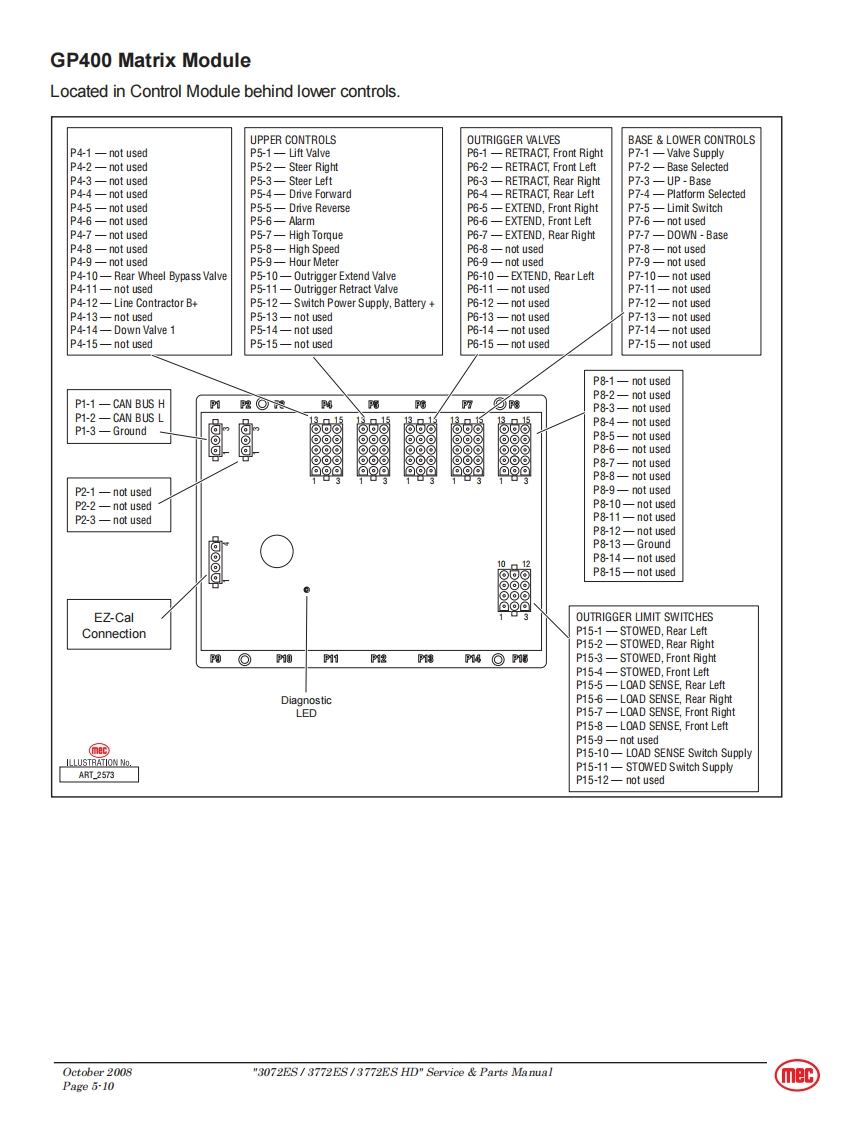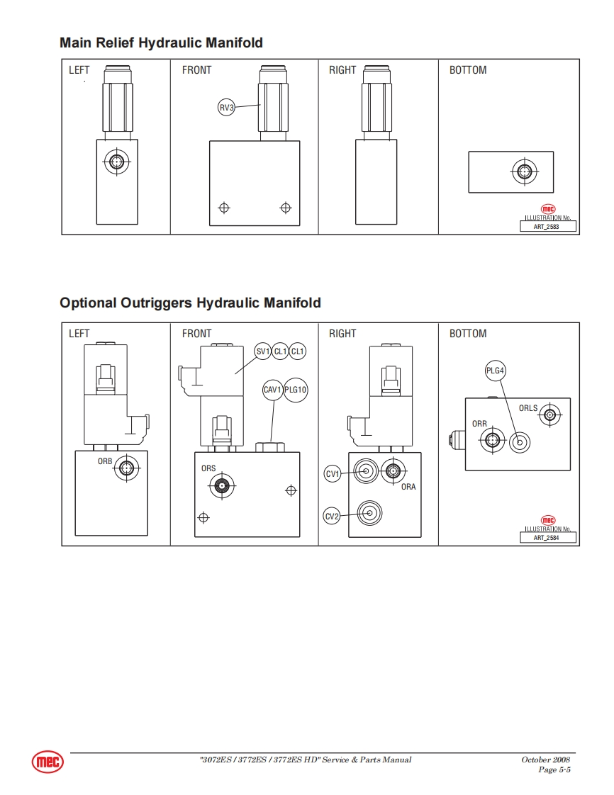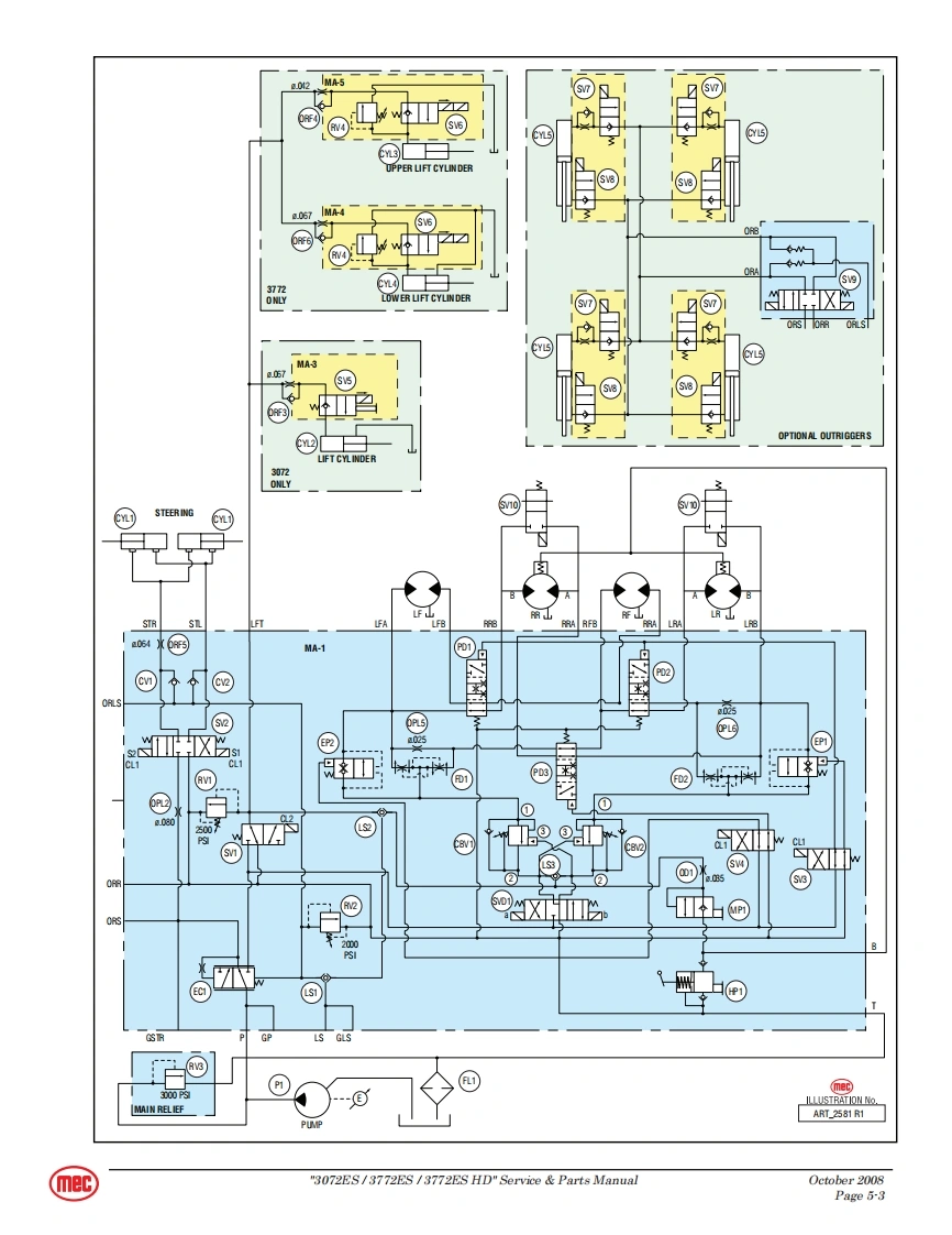 SERVICEmecSECTION 5SCHEMATICSHydraulic Schematic...............5-2Main Hydraulic Manifold.........5-4Main Relief Hydraulic Manifold.......5-5Optional Outriggers Hydraulic Manifold5-5Electric System5-6Electric Schematics:Upper Controls,Early Models....................5-6Electric Schematics:Upper Controls,Current Models..........................5-7Electric Schematics:Base.5-8P600 Motor Control Module................…5-9GP400 Matrix Module.…5-10Matrix Module Controller................5-11mec"3072ES/3772ES /3772ES HD Service Parts ManualOctober 2008Page 5-1