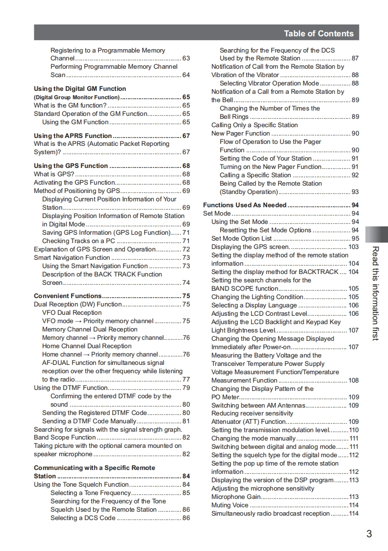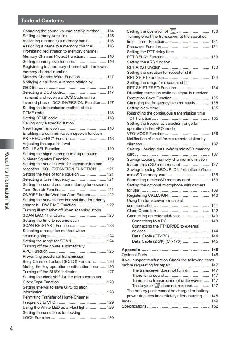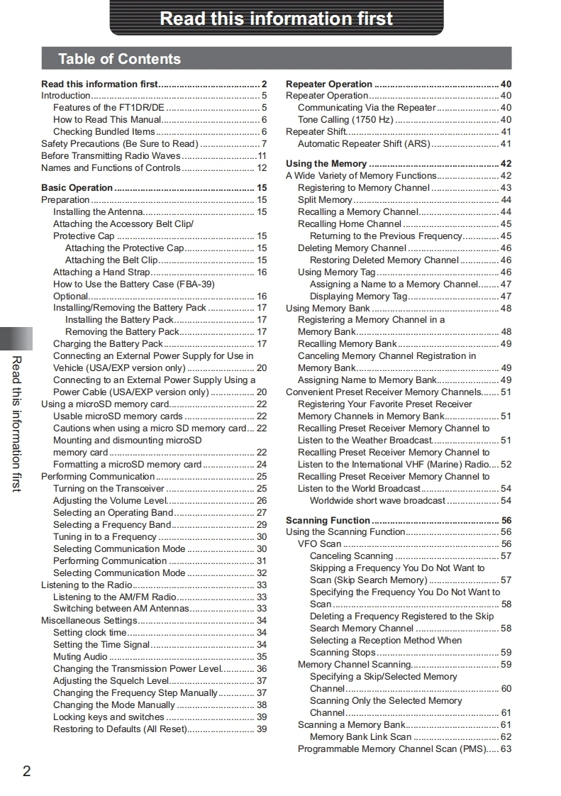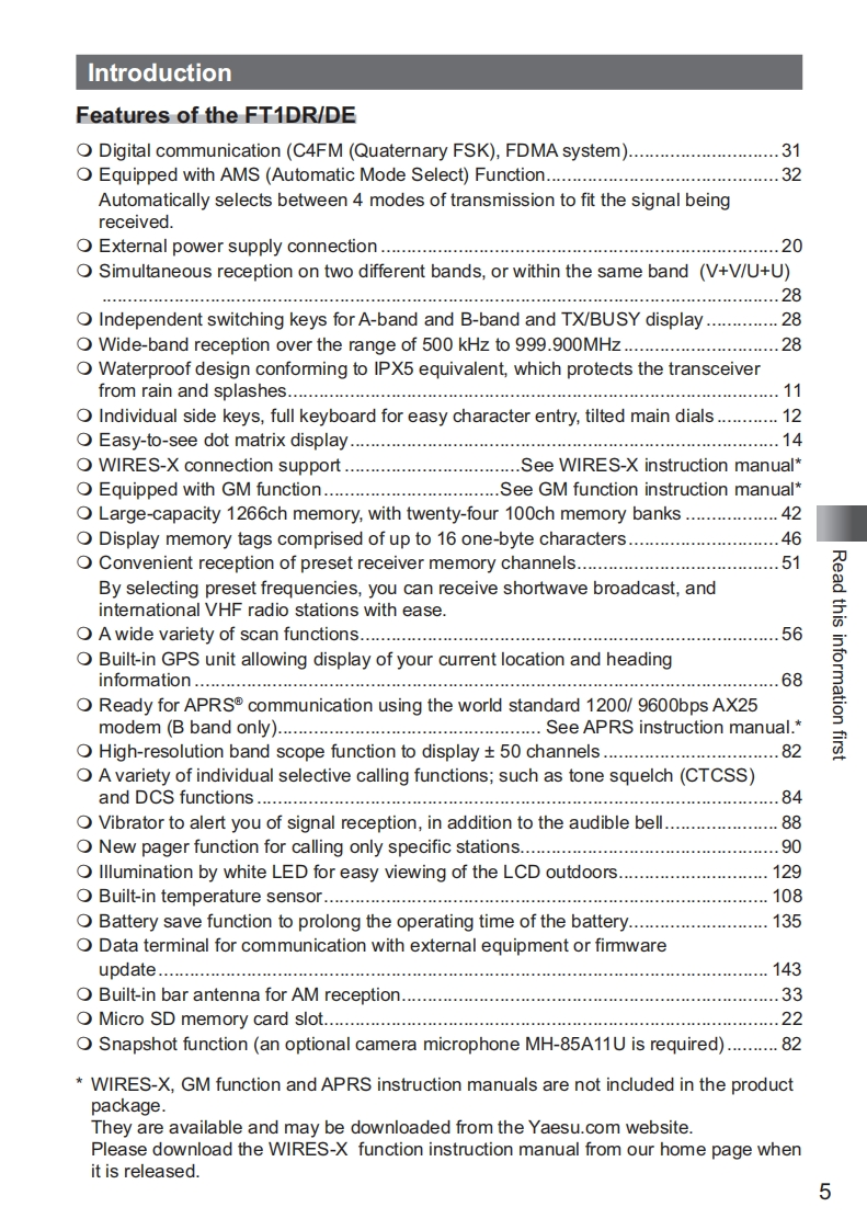 YAESUThe radioFT1DRIDE144/430MHzDIGITAL/ANALOGTRANSCEIVEROperating ManualC4FM FDMARead this information firstBasic OperationRepeater OperationOUsing the MemoryYAESUaFm.446:590oNF0l452。mScanning FunctionYAESU446.59FT1DE146:528FmUsing the Digital GM FunctionA/BFT1DA/BUsing the APRS FunctionUsing the GPS Functionw/MConvenient FunctionsD ENTCommunicating with aSpecific Remote StationFunctions Used As NeededAppendix