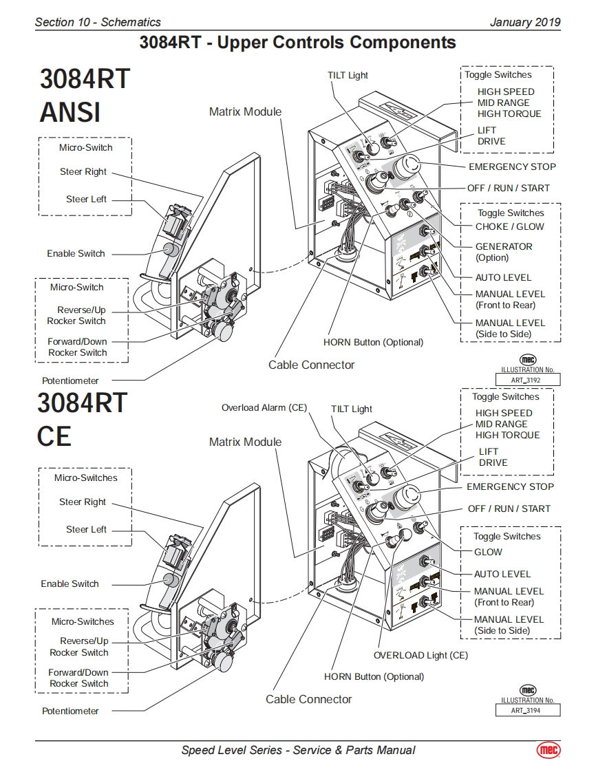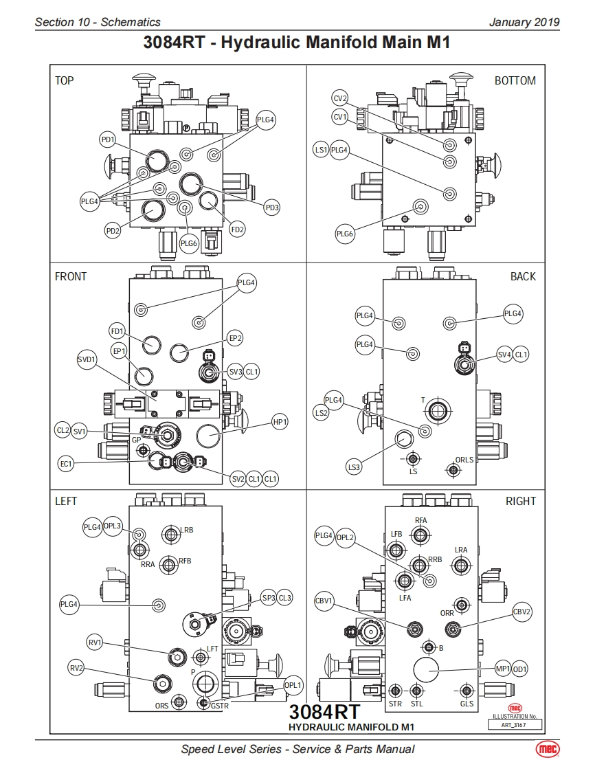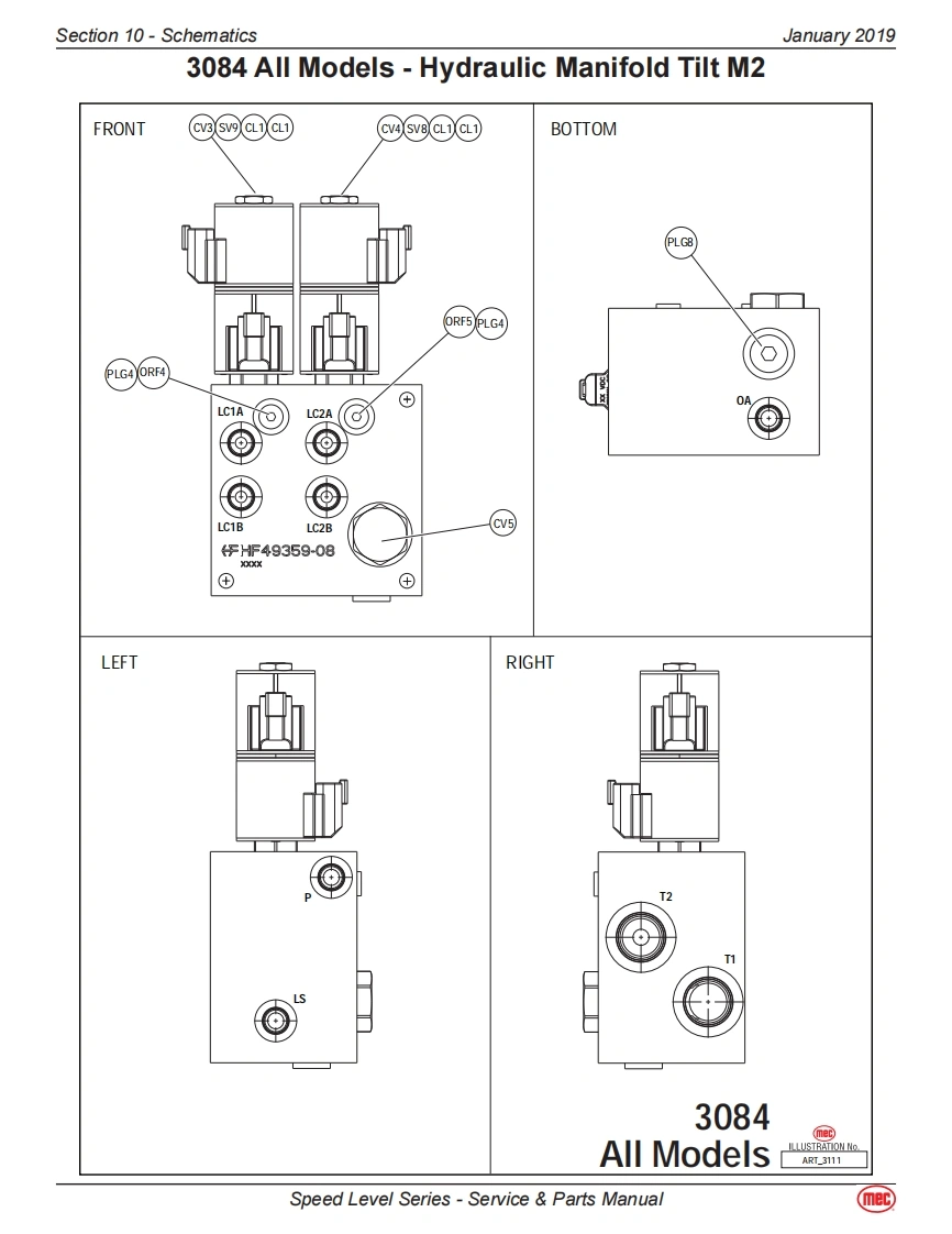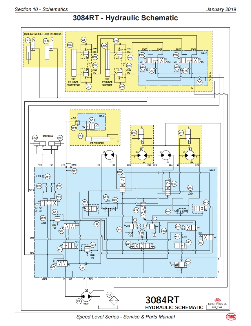 Section 10-SchematicsJanuary 20193084RT-Diesel/Dual Fuel ModelsHydraulic-3084RTThe following table applies to the next 3 pages.CalloutDescriptionCalloutDescriptionMA-1MAIN MANIFOLDSTEERING COMPONENTSCBV1Counter Balance Valve.DriveCYL1Steer Cylinder,RightCBV2Counter Balance Valve,DriveCYL2Steer Cylinder,LeftCL1Coil-Speed/Torque/Steer Valves #8TILT COMPONENTSCL2Coil Lift Valve #10MA-2Combination Valve Manifold-TiltCV1Check Valve.Load Sense Steer LeftCV3Check Valve.Tilt.Side/Side Load SenseCV2Check Valve,Load Sense Steer RightCV4Check Valve,Tilt,Front/Rear Load SenseEC1Priority Flow ControlCV5Check Valve,10 PSI Oscillating axleEP1Piloted Poppet Valve-Torque/SpeedCV6Check Valve,Tilt Cyl,Front/RearEP2Piloted Poppet Valve-Torque/SpeedCV7Check Valve,Tilt Cyl,Front/RearFD1Flow Divider/CombinerCV8Check Valve,Tilt Cyl,Side/SideFD2Flow Divider/CombinerCV9Check Valve,Tilt Cyl,Side/SideHP1Hand Pump,Brake ReleaseCYL4Tilt Cylinder,Front/RearLS1Load Sense Shuttle ValveCYL5Tilt Cylinder,Side/SideLS2Load Sense Shuttle ValveCYL6Axle Lock CylinderLS3Load Sense Shuttle ValveCYL7Axle Lock CylinderMP1Manual Push Brake Release ValveORF4Orifice,0.040,Tilt,Side/Side0D1Orifice Disc,Brakes,0.035ORF5Orifice,0.040,Tilt,Front/RearOPL1Orifice Plug,Steering,0.087RV3Relief Valve,Tilt Cyl Front/Rear,2500 PSIOPL2Orifice Plug,Flow Divider Bleed,0.025RV4Relief Valve,Tilt Cyl Front/Rear,2500 PSIOPL3Orifice Plug,Flow Divider Bleed,0.025RV5Relief Valve,Tilt Cyl Side/Side,2500 PSIORF1Orifice,Steering,0.064RV6Relief Valve,Tilt Cyl Side/Side,2500 PSIORF2Orifice,Lift,0.093SV8Spool Valve,Tilt Front/RearPD1Pilot Valve,Series Parallel,4-Way 3-PositionSV9Spool Valve,Tilt Side/SidePD2Pilot Valve,Series Parallel,4-Way /3-PositionLIFT COMPONENTSPD3Pilot Valve,Series Parallel,4-Way /3-PositionMA-3Lift Cylinder ManifoldPLG4Port PlugCYL3Lift CylinderPLG6Port PlugORF3Orifice,0.067 DescendRV1Relief Valve,Lift,2500 PSISV5Solenoid Valve,12V,Dual CoilRV2Relief Valve,Steering,2000 PSIWheel MotorsSP1Proportional ValveLFWheel Motor-Left FrontSV1Spool Valve,Lift.3-WayLRWheel Motor w/Brake-Left RearSV2Spool Valve.Steer,4-Way /3-PositionRFWheel Motor-Right FrontSV3Spool Valve,Series Parallel,4-Way/3-PositionRRWheel Motor w/Brake-Right RearSV4Spool Valve.Series Parallel.4-Way/3-PositionSV6Spool Valve-Right Wheel Motor BypassSVD1Spool Valve,Drive,4-Way /3-PositionSV7Spool Valve-Left Wheel Motor BypassRESERVOIRFL1Filter,10 Micron,Fluid ReturnP1Pump,Hydraulic FluidSpeed Level Series-Service Parts Manual(mec)