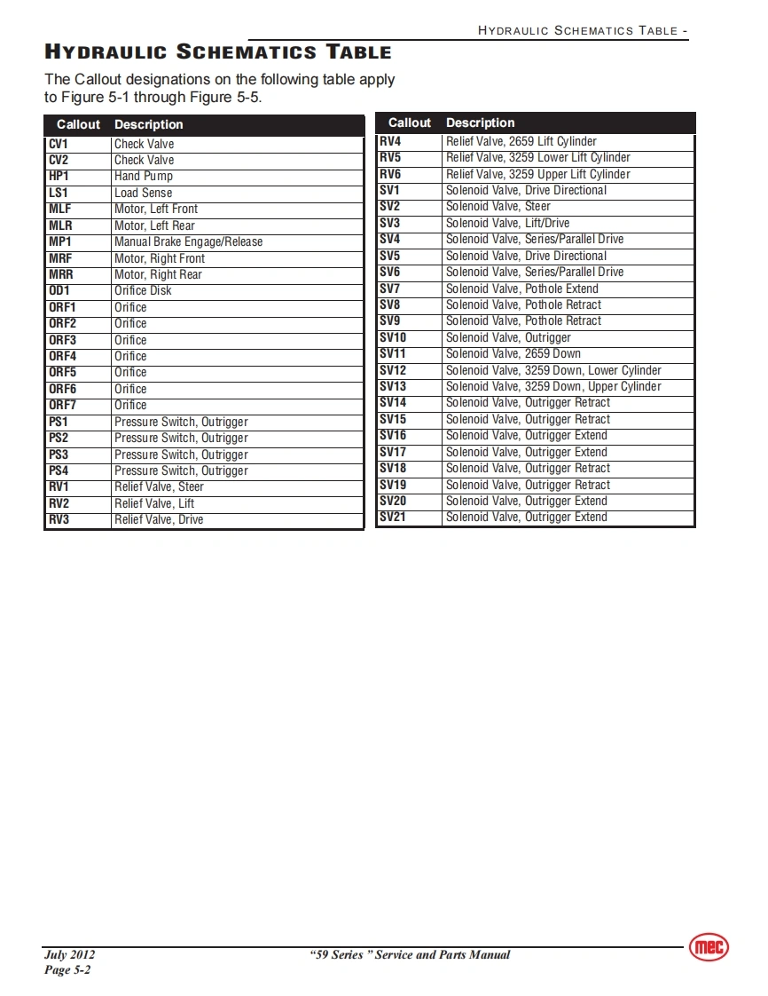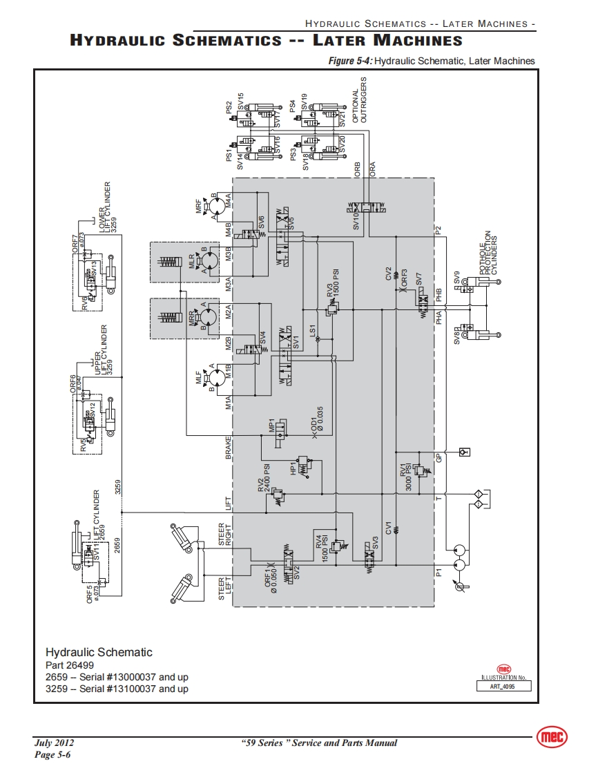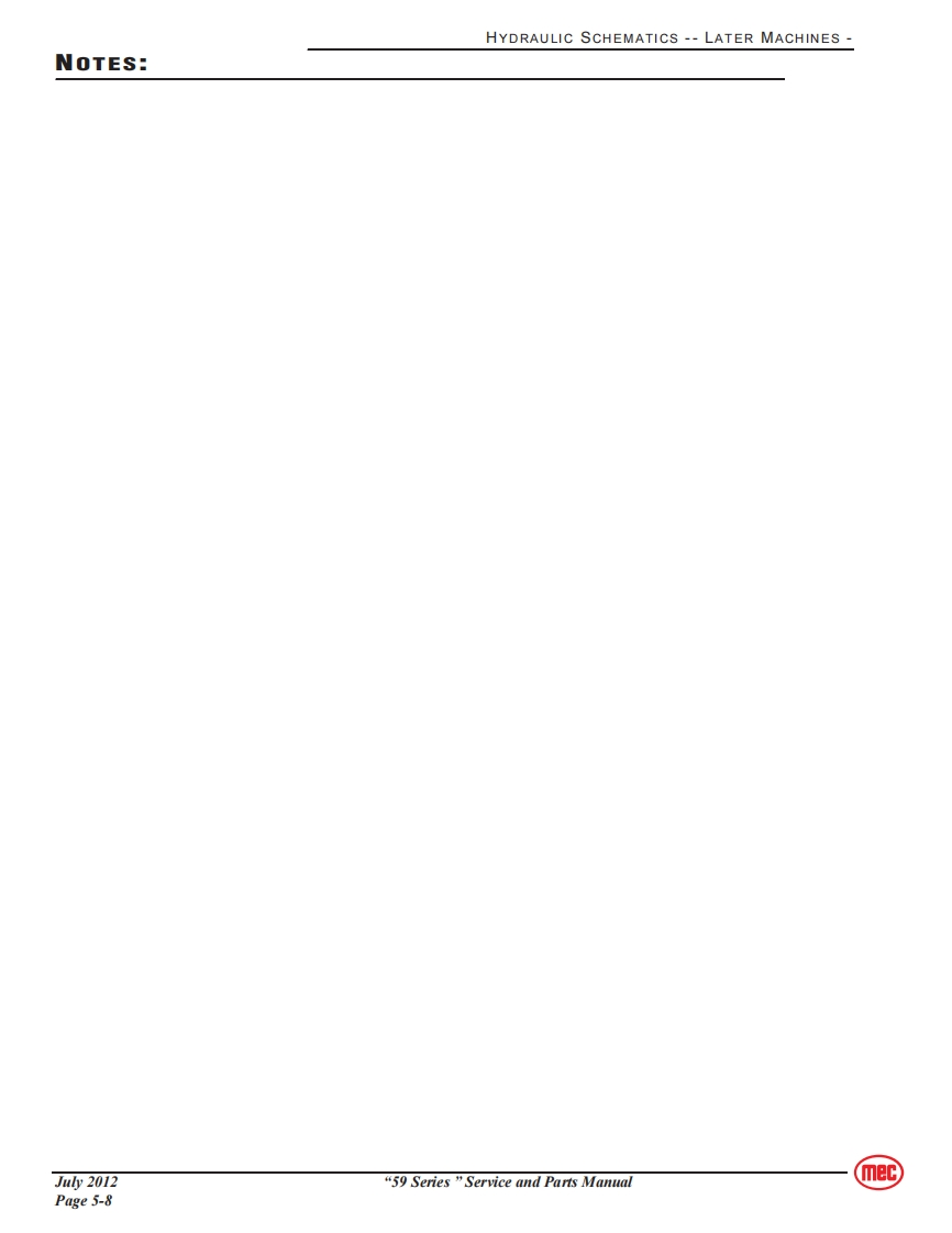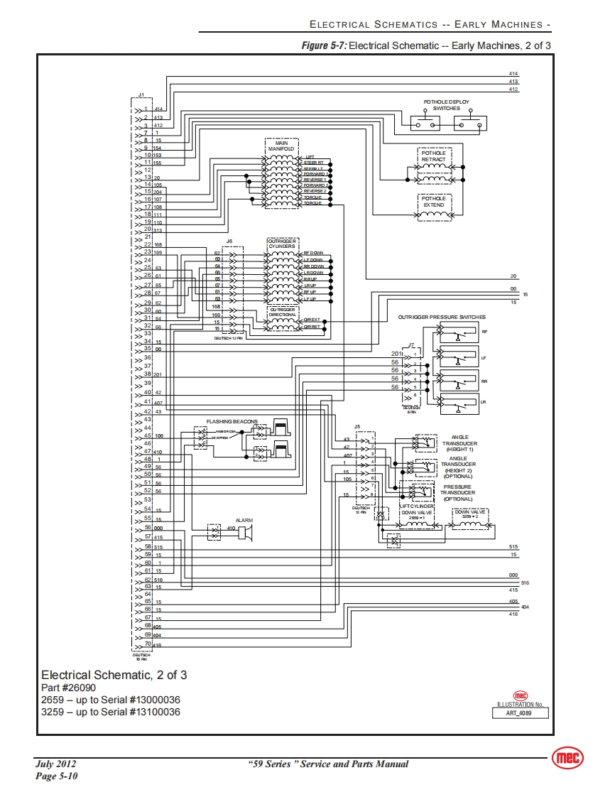 SERVICEmecSection 5SCHEMATICSCONTENTSPAGEHydraulic Schematics Table..............................5-2Hydraulic Schematics--Early Machines5-3Hydraulic Schematics--Later Machines5-6Electrical Schematics--Early Machines5-9Electrical Schematics --Later Machines5-13Controls........···5-16FIGURESPAGEHydraulic Schematic,Early Machines........................5-3Functions Manifold,Early Machine5-4Pothole Outrigger Valve Assemblies,Early Machines ..........5-5Hydraulic Schematic,Later Machines..............5-6Functions Manifold,Later Machine.............5-7Electrical Schematic-Early Machines,1 of 35-9Electrical Schematic-Early Machines,2 of 35-10Electrical Schematic-Early Machines,3 of 35-11Electrical Schematic-Later Machines,1 of 3.................5-13Electrical Schematic-Later Machines,2 of 3..................5-14Electrical Schematic-Later Machines,3 of 3................5-15Lower Controls...............5-16Upper Controls............5-16mec“59 Series”Service and Parts ManualJu2012Page 5-1