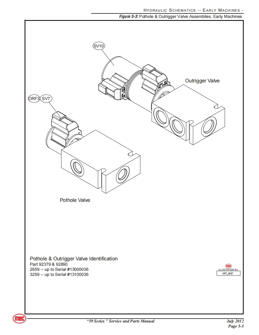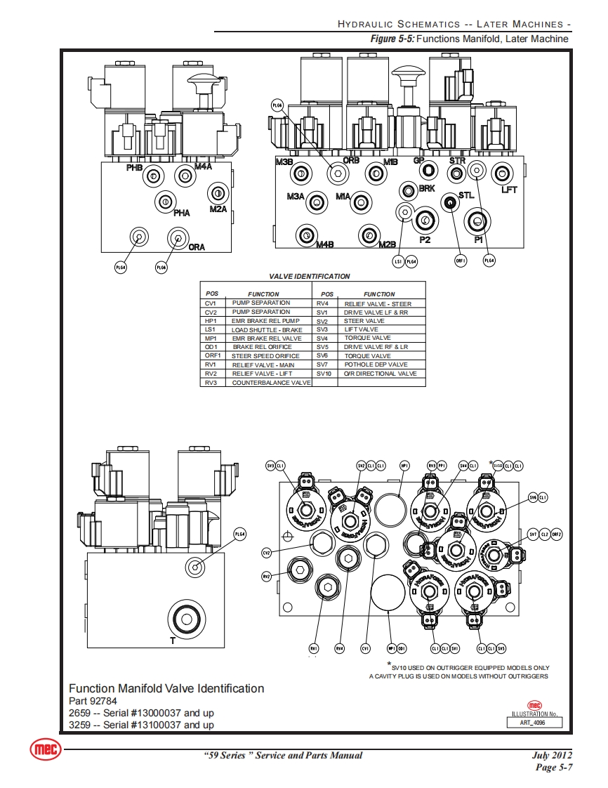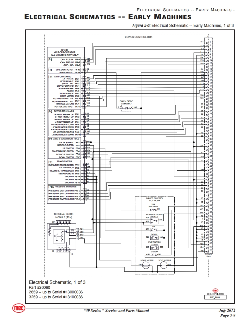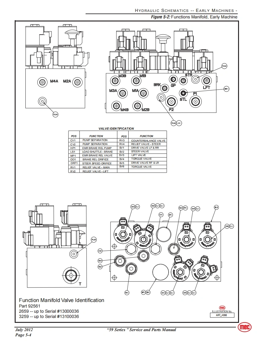 SERVICEmecSection 5SCHEMATICSCONTENTSPAGEHydraulic Schematics Table..............................5-2Hydraulic Schematics--Early Machines5-3Hydraulic Schematics--Later Machines5-6Electrical Schematics--Early Machines5-9Electrical Schematics --Later Machines5-13Controls........···5-16FIGURESPAGEHydraulic Schematic,Early Machines........................5-3Functions Manifold,Early Machine5-4Pothole Outrigger Valve Assemblies,Early Machines ..........5-5Hydraulic Schematic,Later Machines..............5-6Functions Manifold,Later Machine.............5-7Electrical Schematic-Early Machines,1 of 35-9Electrical Schematic-Early Machines,2 of 35-10Electrical Schematic-Early Machines,3 of 35-11Electrical Schematic-Later Machines,1 of 3.................5-13Electrical Schematic-Later Machines,2 of 3..................5-14Electrical Schematic-Later Machines,3 of 3................5-15Lower Controls...............5-16Upper Controls............5-16mec“59 Series”Service and Parts ManualJu2012Page 5-1