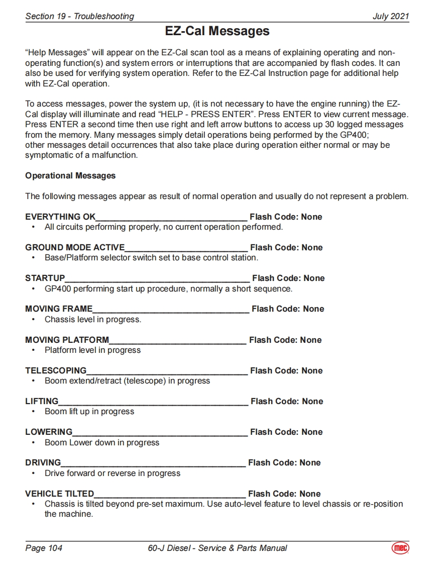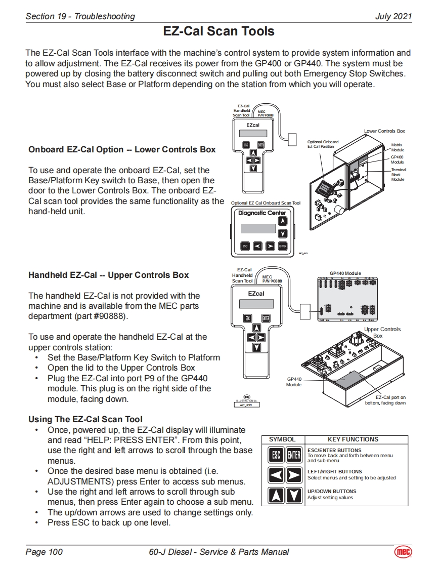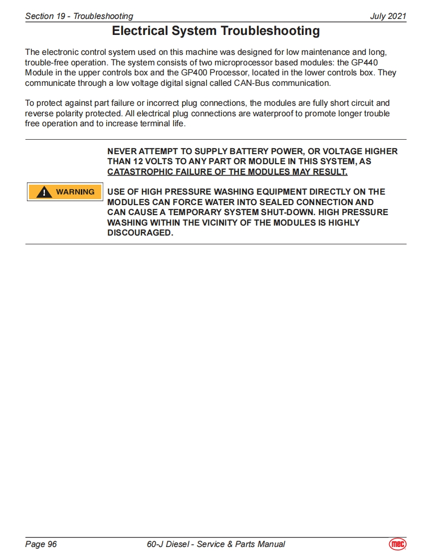 Section 19-TroubleshootingJuly 2021General Troubleshooting TipsHydraulic Fluid PumpThe hydraulic Drive Pump and Primary Functions Pump used in this model are variable displacement,axial piston type pumps.Proper adjustment is critical for normal operation of the machine.Refer toSection 10 of this manual.The Secondary Functions pump is a fixed-displacement gear-type pump attached to the rear of thePrimary Functions Pump.Common Causes of Electrical System Malfunctions:Battery switch is turned OFF (located at the front of the engine module).Battery connections are loose or corroded。Battery is not fully charged.Emergency Stop buttons are pushed (OFF position).Circuit breaker is tripped (OFF position).Common Causes of Hydraulic System Malfunctions:Hydraulic fluid level is too low.Incompatible hydraulic fluids mixed,destroying the additives and causing vamish build up,resulting in the valves sticking.Water in the hydraulic fluid due to a damp climate.Improper hydraulic fluid used.Viscosity too high in cold climates.Viscosity too low in warmclimates.Hydraulic fluid contaminated with debris -filter change interval neglected.Note:MEC uses a multiple viscosity fluid that is light enough for cold climates and resists thinning inwarm climates.Use only the recommended hydraulic fluid.Substituting a lower grade fluid willcause the machine to operate incorrectly and may lead to pump and drive motor failure.Referto "Lubrication"in Section 10 of this manual.Note:Contamination always causes failure in any hydraulic system.It is very important to be carefulnot to introduce any contamination into hydraulic system during the assembly procedures.Make sure all ports and cavities of the manifold and cylinders are properly covered/pluggedduring maintenance activities.Page 9560-J Diesel-Service Parts Manual(mec)
