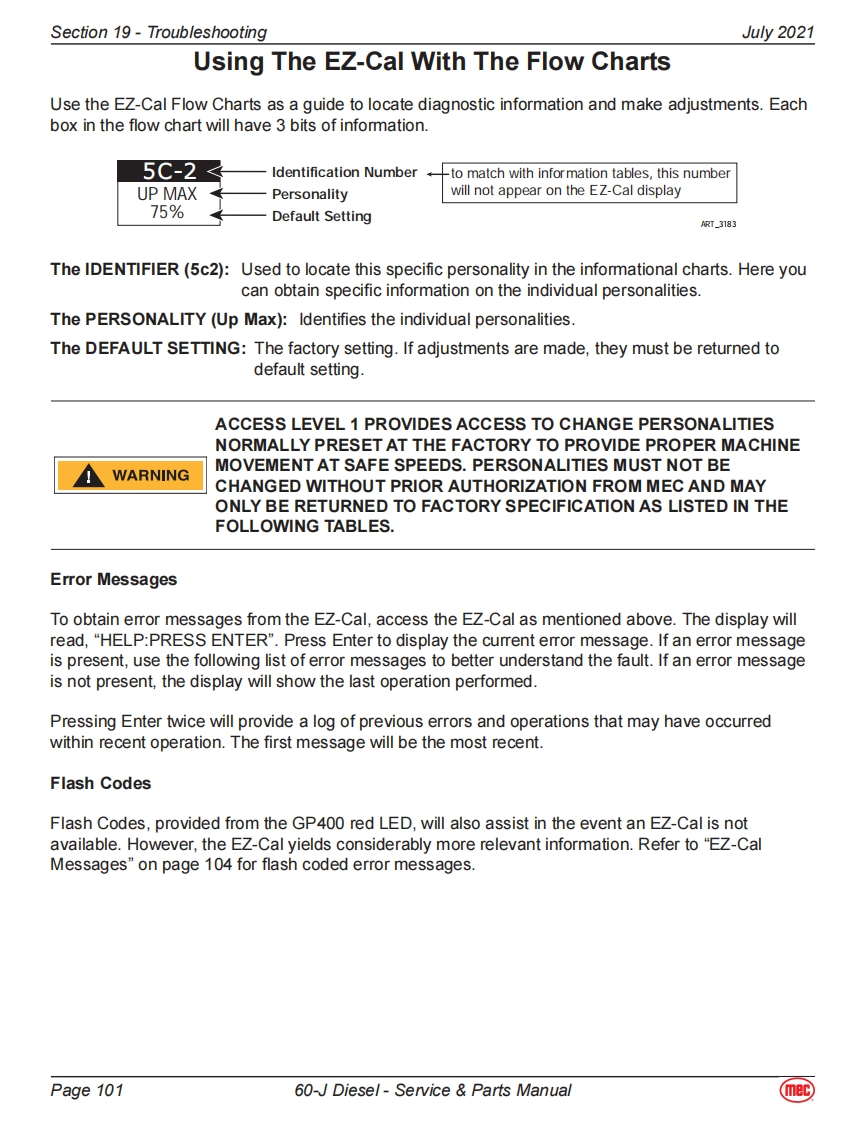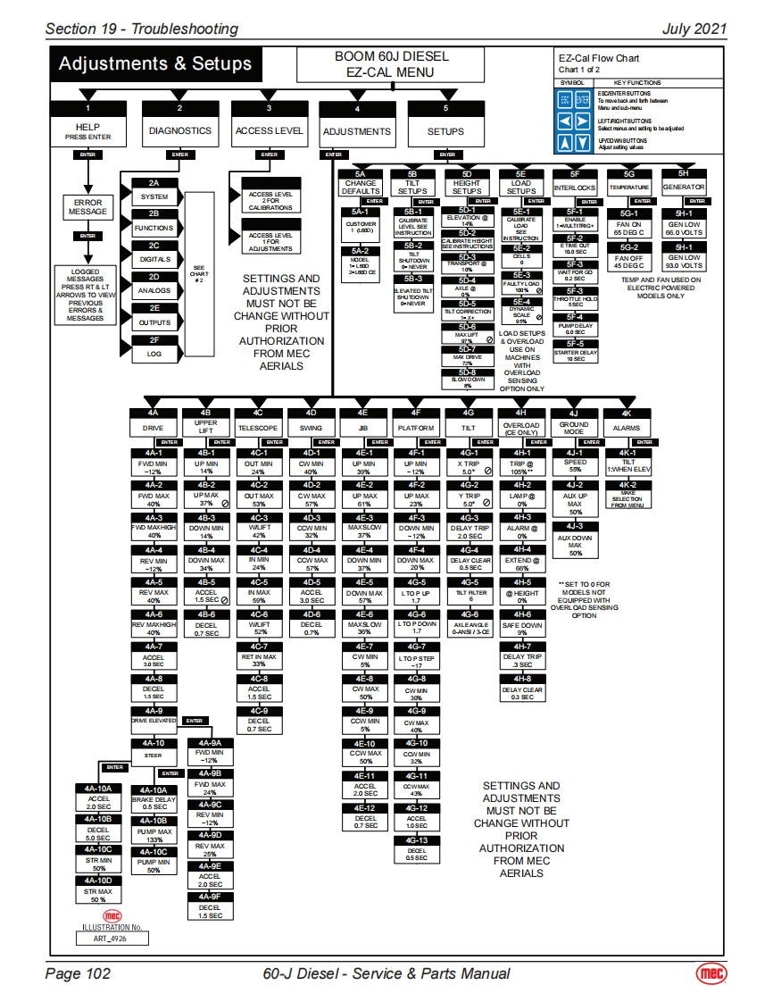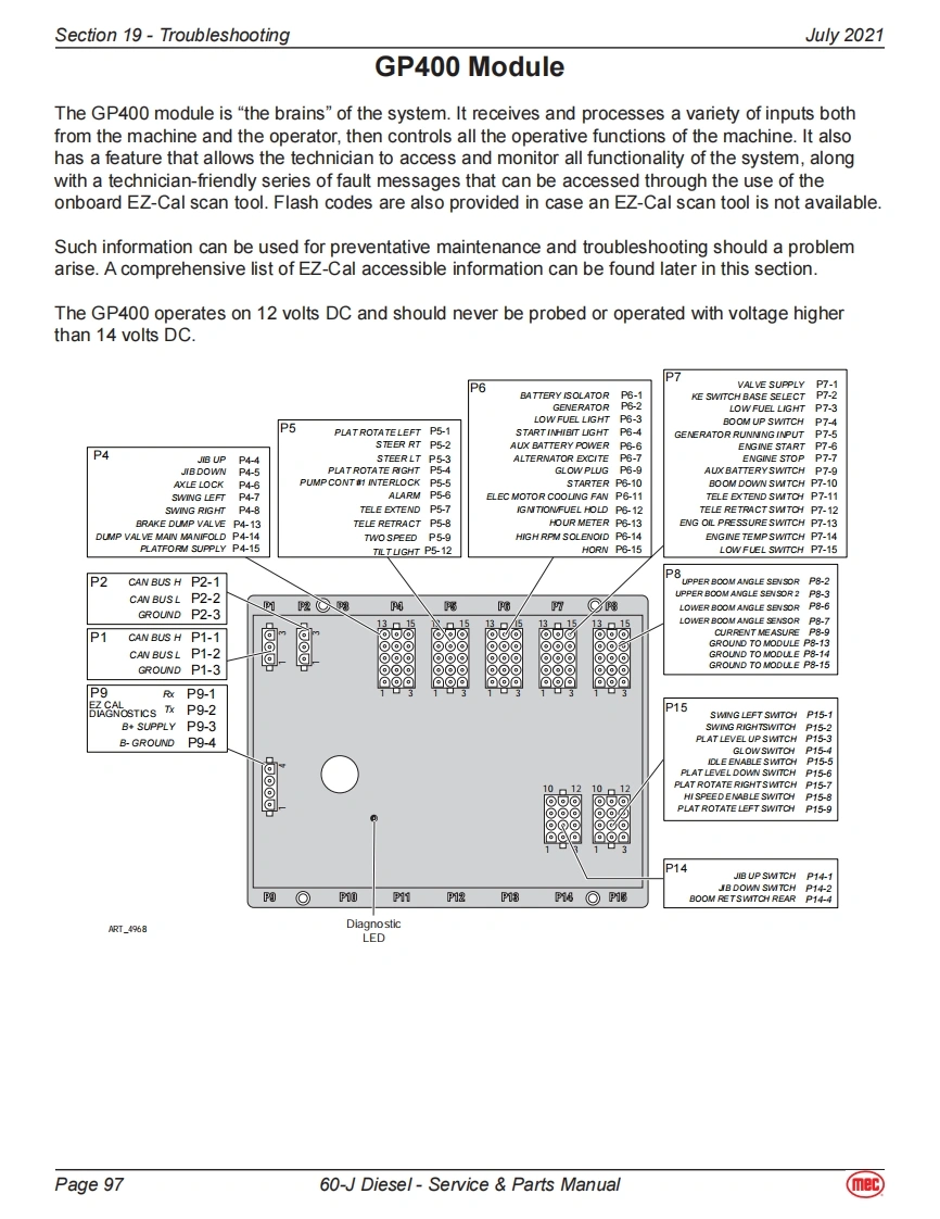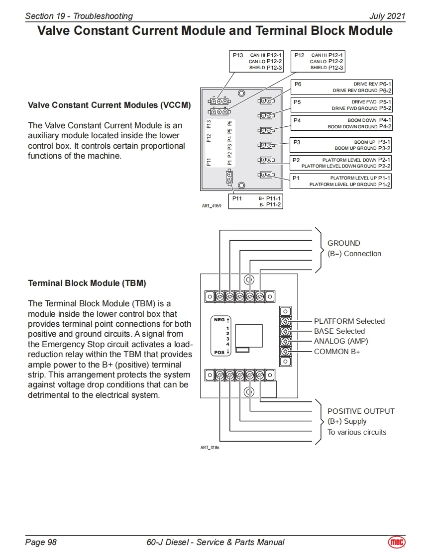 Section 19-TroubleshootingJuly 2021General Troubleshooting TipsHydraulic Fluid PumpThe hydraulic Drive Pump and Primary Functions Pump used in this model are variable displacement,axial piston type pumps.Proper adjustment is critical for normal operation of the machine.Refer toSection 10 of this manual.The Secondary Functions pump is a fixed-displacement gear-type pump attached to the rear of thePrimary Functions Pump.Common Causes of Electrical System Malfunctions:Battery switch is turned OFF (located at the front of the engine module).Battery connections are loose or corroded。Battery is not fully charged.Emergency Stop buttons are pushed (OFF position).Circuit breaker is tripped (OFF position).Common Causes of Hydraulic System Malfunctions:Hydraulic fluid level is too low.Incompatible hydraulic fluids mixed,destroying the additives and causing vamish build up,resulting in the valves sticking.Water in the hydraulic fluid due to a damp climate.Improper hydraulic fluid used.Viscosity too high in cold climates.Viscosity too low in warmclimates.Hydraulic fluid contaminated with debris -filter change interval neglected.Note:MEC uses a multiple viscosity fluid that is light enough for cold climates and resists thinning inwarm climates.Use only the recommended hydraulic fluid.Substituting a lower grade fluid willcause the machine to operate incorrectly and may lead to pump and drive motor failure.Referto "Lubrication"in Section 10 of this manual.Note:Contamination always causes failure in any hydraulic system.It is very important to be carefulnot to introduce any contamination into hydraulic system during the assembly procedures.Make sure all ports and cavities of the manifold and cylinders are properly covered/pluggedduring maintenance activities.Page 9560-J Diesel-Service Parts Manual(mec)