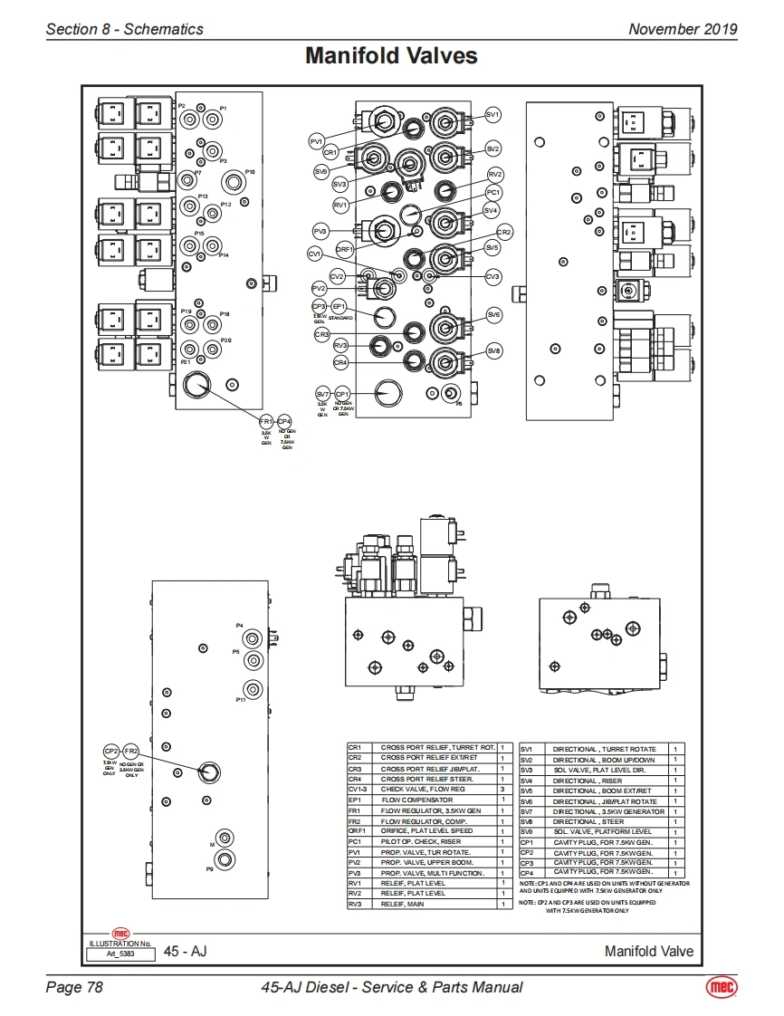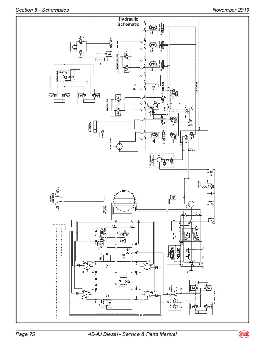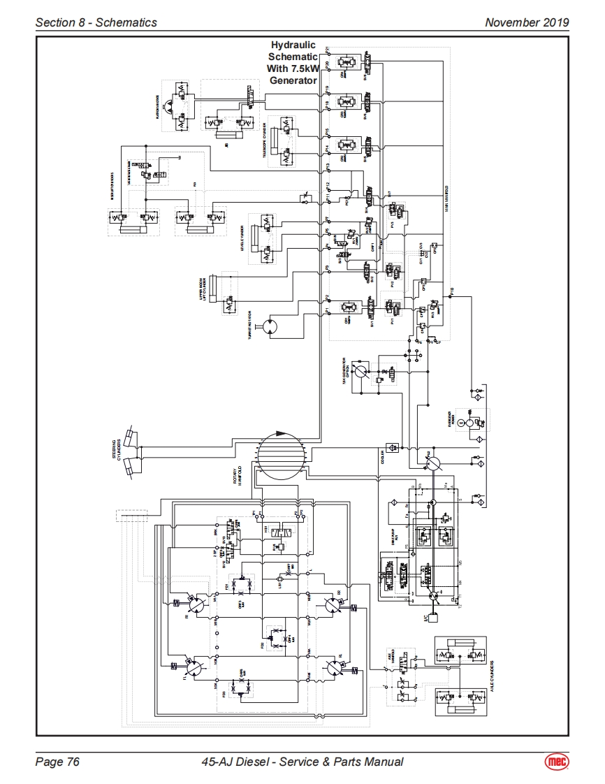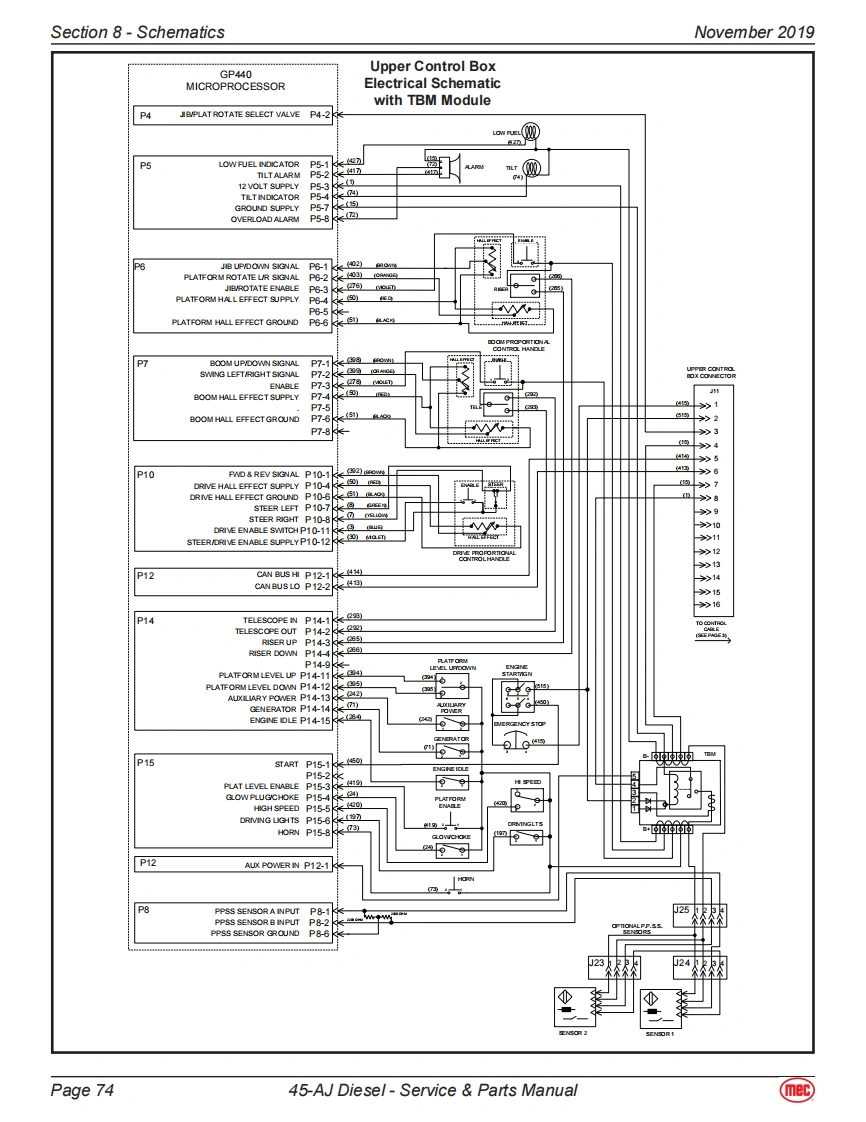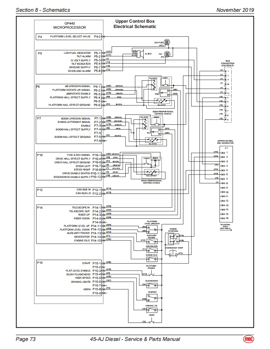 Section 8-SchematicsNovember 2019Lower Control Box1RENT MODULEGP400 MICROPROCESSORElectrical SchematicP1CAN-BUS HIP1-1CA LOC-8J30GBNERATOR P4-1P4EUP&LA灯OT RIGHTP4-4J日O0N&PLATROT LE子TP4-5AnLELOCKSWNG LEFTKCANLOSMING PROPOR TONALUFT UPP5STEER RICHT8e空RLaTALARMTELE EXTENDT日ER白RCTP-12P5-9P6PLATCONTROL VALVEP6-1RSERUPSTARTINHBT UGHTRSERDONP6-5p69HORNP8-2P8-3FUELLEVB S8NS0RP8-7P8-8CURRENT MEASUREP8-9GROUND TOMOOULE P8-14P9Rx P9-1EZCAL DIAGNOSTC8Tx8B+P9-4P7VALVE SUPPLYP7-1KEY SMTCHBASE SBECTP7-2CONTROL BOXBOOM UP SMCHP7-3KEY SMTCHPLAT SBLECTRISER UP SMTOHENGINE STARTP76AS☒RO0 WN SMTCHP7-7RSERUP UMT SMTOHBOOM DOWN SMCH P7-10ELE EEND SMTOH P7-11TELE RETRACT SWITOH P7-12P14JBUPSWITCH P14-1B P14-2RBER DOWNLMIT SMTOH P14-3BOOM RETSWITCHREAR P14-10P15SMING LEFTSWTCH P15-1SMNG RGHT SMCH P15-2PLATLEVELUP SMTCH P15-3GLOWSWTCH P15-4封P15-5PLAT LEVEL DOWN SWITCH P15-6PLAT ROTAERT SMITOH P15-7HIGH SPEED ENABLE SMTO P15-8PLAT ROTATE LEFT SMTOH P15-gBB009TP15-10“T等t图古心Page 7145-AJ Diesel-Service Parts Manual(mec)