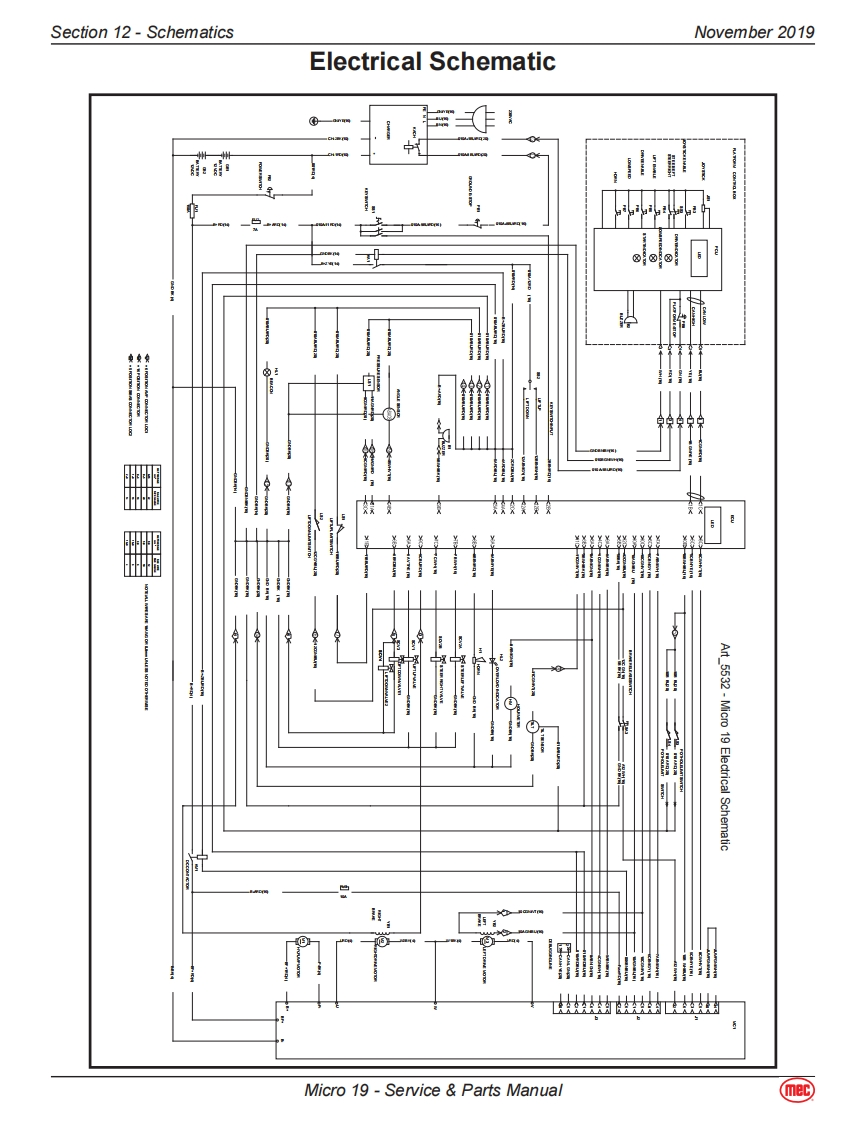Section 12-SchematicsNovember 2019Hydraulic Schematic月at Overload(Option)Lift CylinderUpper Lift CylinderSensorSCV3州DSCV4-150 BarSteer Cylinder0.7mm.1.5mm·CV2CV2Lower valve:Lower valve:5805-08115805-0812IN1.0mm1.0mmSCV2RV2↑100BarRPCV1MRV1160BaPump Unit:1136-40BPump Unit Parameter:Motor:24V,2200W.2800rpmPump:Displacement 2.0cc/rTank:4L(mec)ILLUSTRATION No.AW5537Micro 19Hydraulic SchematicMicro 19-Service Parts Manual(mec)
