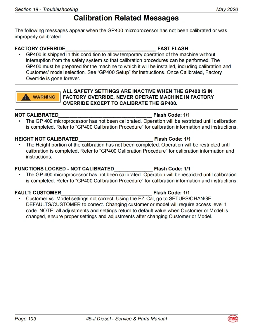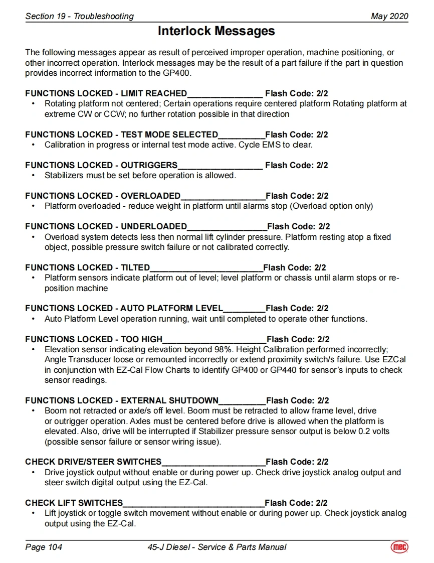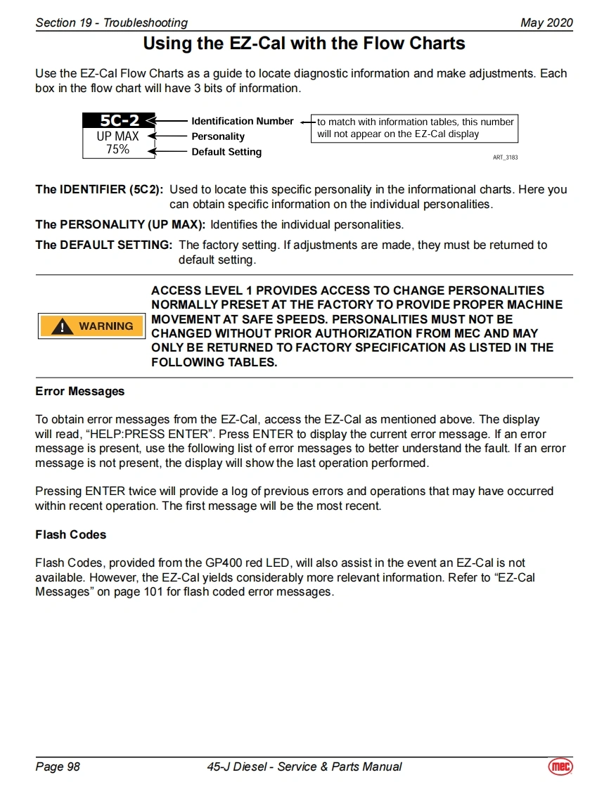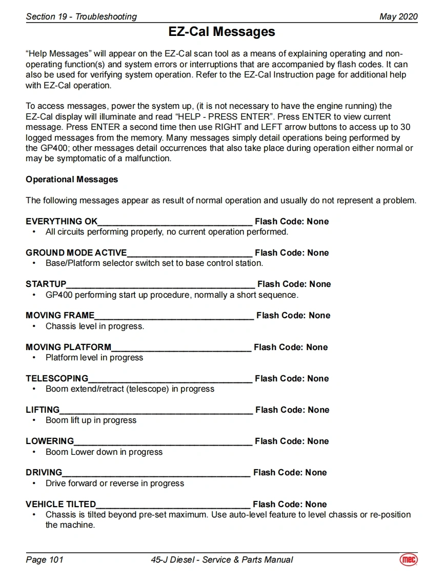 Section 19-TroubleshootingMay 2020EZ-Cal Scan ToolsThe EZ-Cal Scan Tools interface with the machine's control system to provide system information andto allow adjustment.The EZ-Cal receives its power from the GP400 or GP440.The system must bepowered up by closing the battery disconnect switch and pulling out both Emergency Stop Switches.You must also select Base or Platform depending on the station from which you will operate.EZ-Calan ToolEZcalLower Controls BoxOptional OnboardOnboard EZ-Cal Option --Lower Controls BoxE2 Cal PoitionModuleGP400ModuieTo use and operate the onboard EZ-Cal,set theTerminalBase/Platform Key switch to Base,then open thedoor to the Lower Controls Box.The onboard EZ-Cal scan tool provides the same functionality as theOptional EZ Cal Onboard Scan Toolhand-held unit.Diagnostic CenterEZ-CalHandheld EZ-Cal -Upper Controls BoxHandheldGP440 ModuleScan ToolThe handheld EZ-Cal is not provided with theEZcalmachine and is available from the MEC PartsDepartment (part #90888).Upper ControlsTo use and operate the handheld EZ-Cal at theBoxupper controls station:Set the Base/Platform Key Switch to Platform。Open the lid to the Upper Controls Box3经·Plug the EZ-Cal into port P9 of the GP440GP440】Modulemodule.This plug is on the right side of themodule,facing down.EZ-Cal port onbottom,facing downUsing The EZ-Cal Scan ToolOnce,powered up,the EZ-Cal display will illuminate andKEY FUNCTIONSread "HELP:PRESS ENTER".From this point,use theSYMBOLESC/ENTER BUTTONSright and left arrows to scroll through the base menus.ESCENTERTo move back and forth between menuand sub-menuOnce the desired base menu is obtained (i.e.LEFT/RIGHT BUTTONSADJUSTMENTS)press ENTER to access sub menus.Select menus and setting to be adjustedUse the RIGHT and LEFT arrows to scroll through subUP/DOWN BUTTONSmenus,then press ENTER again to choose a sub menu.Adjust setting valuesThe UP/DOWN arrows are used to change settings only.Press ESC to back up one level.Page 9745-J Diesel-Service Parts Manual(mec)