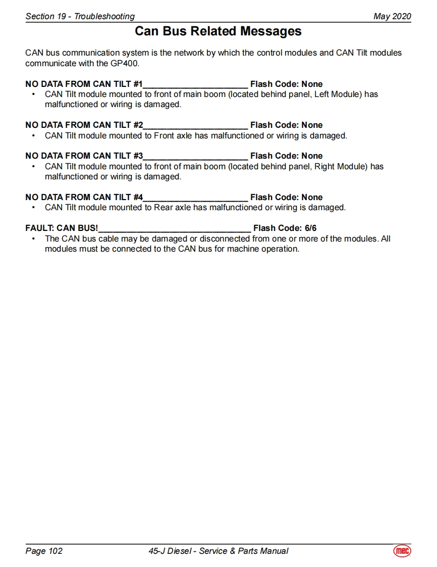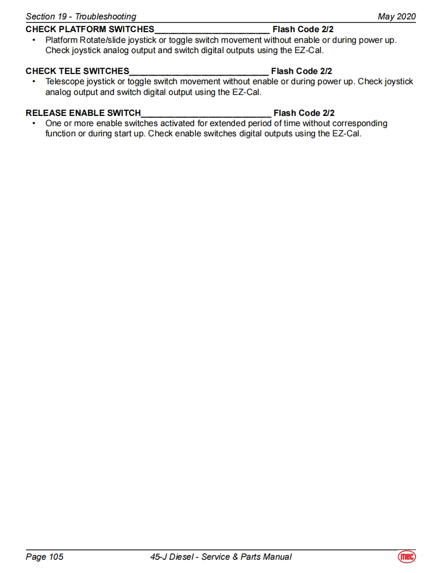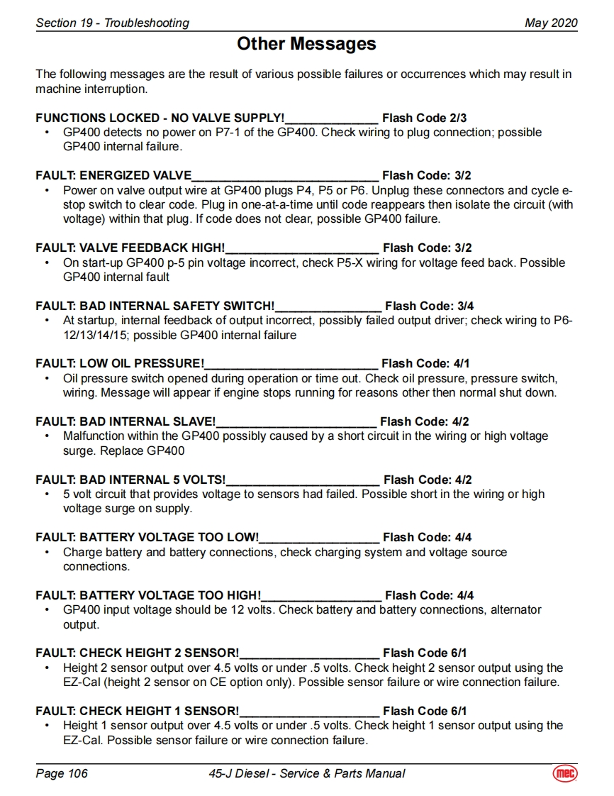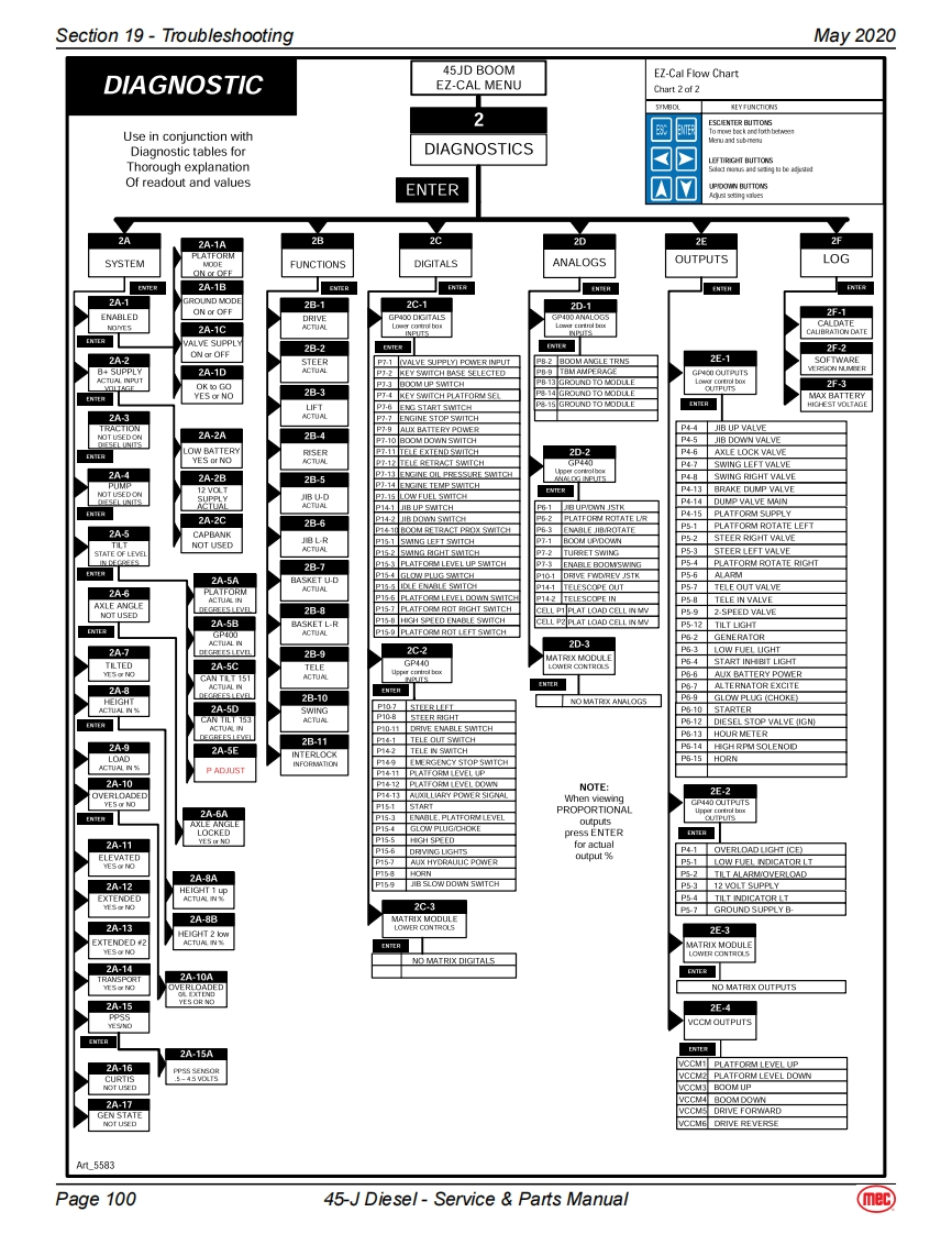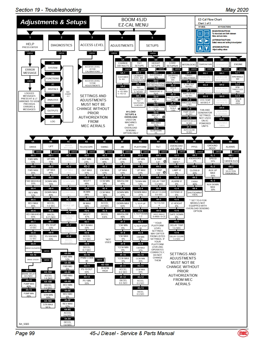 Section 19-TroubleshootingMay 2020EZ-Cal Scan ToolsThe EZ-Cal Scan Tools interface with the machine's control system to provide system information andto allow adjustment.The EZ-Cal receives its power from the GP400 or GP440.The system must bepowered up by closing the battery disconnect switch and pulling out both Emergency Stop Switches.You must also select Base or Platform depending on the station from which you will operate.EZ-Calan ToolEZcalLower Controls BoxOptional OnboardOnboard EZ-Cal Option --Lower Controls BoxE2 Cal PoitionModuleGP400ModuieTo use and operate the onboard EZ-Cal,set theTerminalBase/Platform Key switch to Base,then open thedoor to the Lower Controls Box.The onboard EZ-Cal scan tool provides the same functionality as theOptional EZ Cal Onboard Scan Toolhand-held unit.Diagnostic CenterEZ-CalHandheld EZ-Cal -Upper Controls BoxHandheldGP440 ModuleScan ToolThe handheld EZ-Cal is not provided with theEZcalmachine and is available from the MEC PartsDepartment (part #90888).Upper ControlsTo use and operate the handheld EZ-Cal at theBoxupper controls station:Set the Base/Platform Key Switch to Platform。Open the lid to the Upper Controls Box3经·Plug the EZ-Cal into port P9 of the GP440GP440】Modulemodule.This plug is on the right side of themodule,facing down.EZ-Cal port onbottom,facing downUsing The EZ-Cal Scan ToolOnce,powered up,the EZ-Cal display will illuminate andKEY FUNCTIONSread "HELP:PRESS ENTER".From this point,use theSYMBOLESC/ENTER BUTTONSright and left arrows to scroll through the base menus.ESCENTERTo move back and forth between menuand sub-menuOnce the desired base menu is obtained (i.e.LEFT/RIGHT BUTTONSADJUSTMENTS)press ENTER to access sub menus.Select menus and setting to be adjustedUse the RIGHT and LEFT arrows to scroll through subUP/DOWN BUTTONSmenus,then press ENTER again to choose a sub menu.Adjust setting valuesThe UP/DOWN arrows are used to change settings only.Press ESC to back up one level.Page 9745-J Diesel-Service Parts Manual(mec)