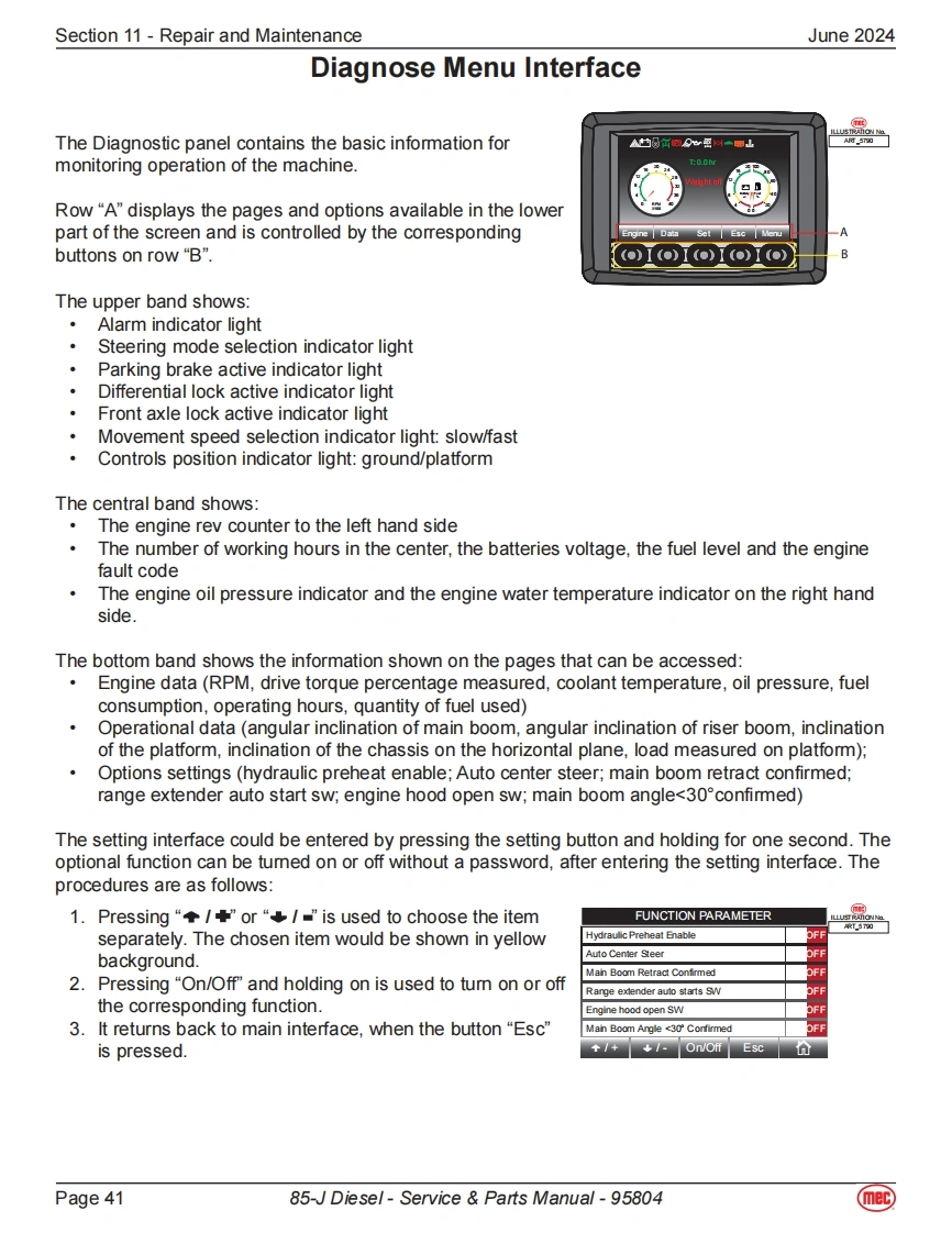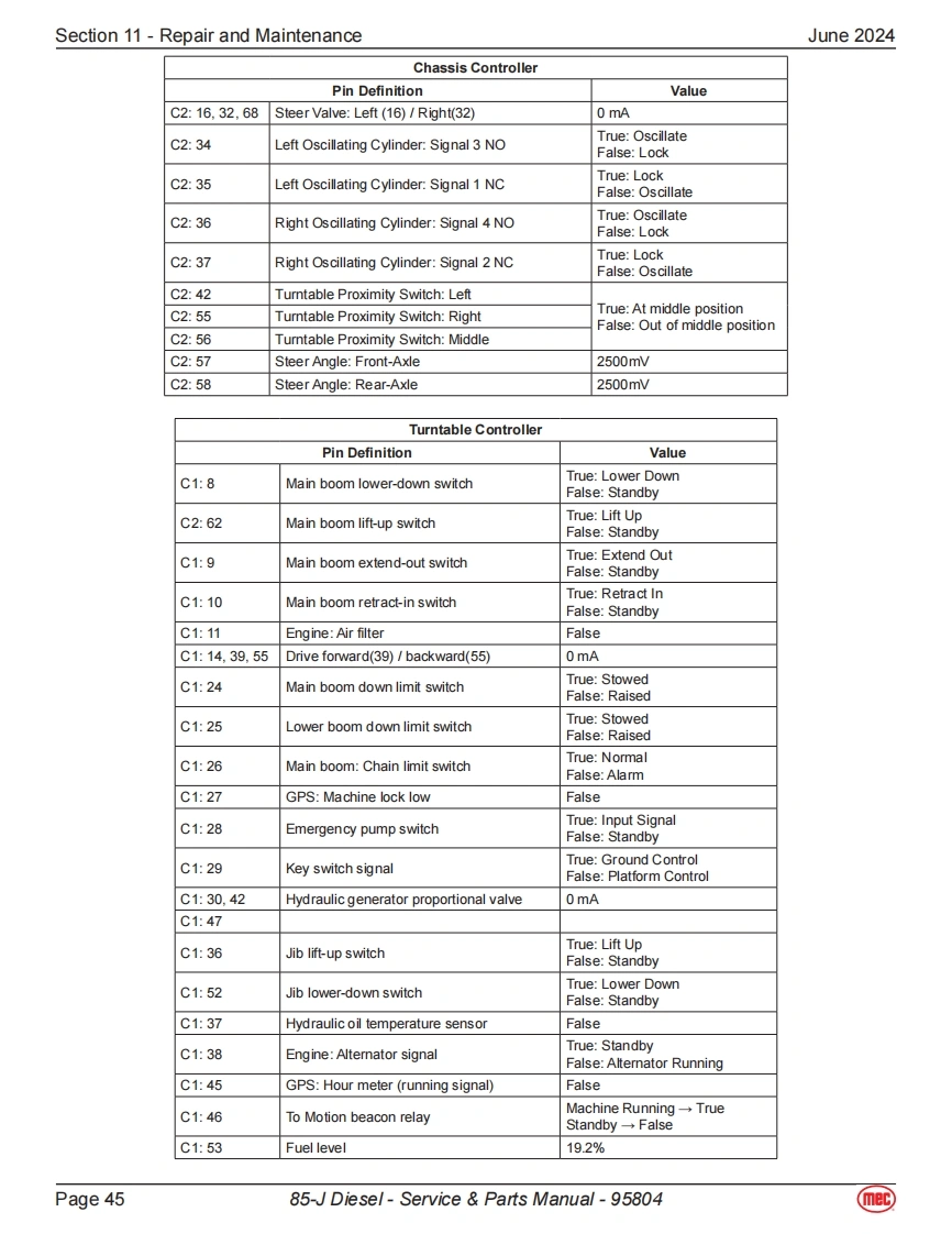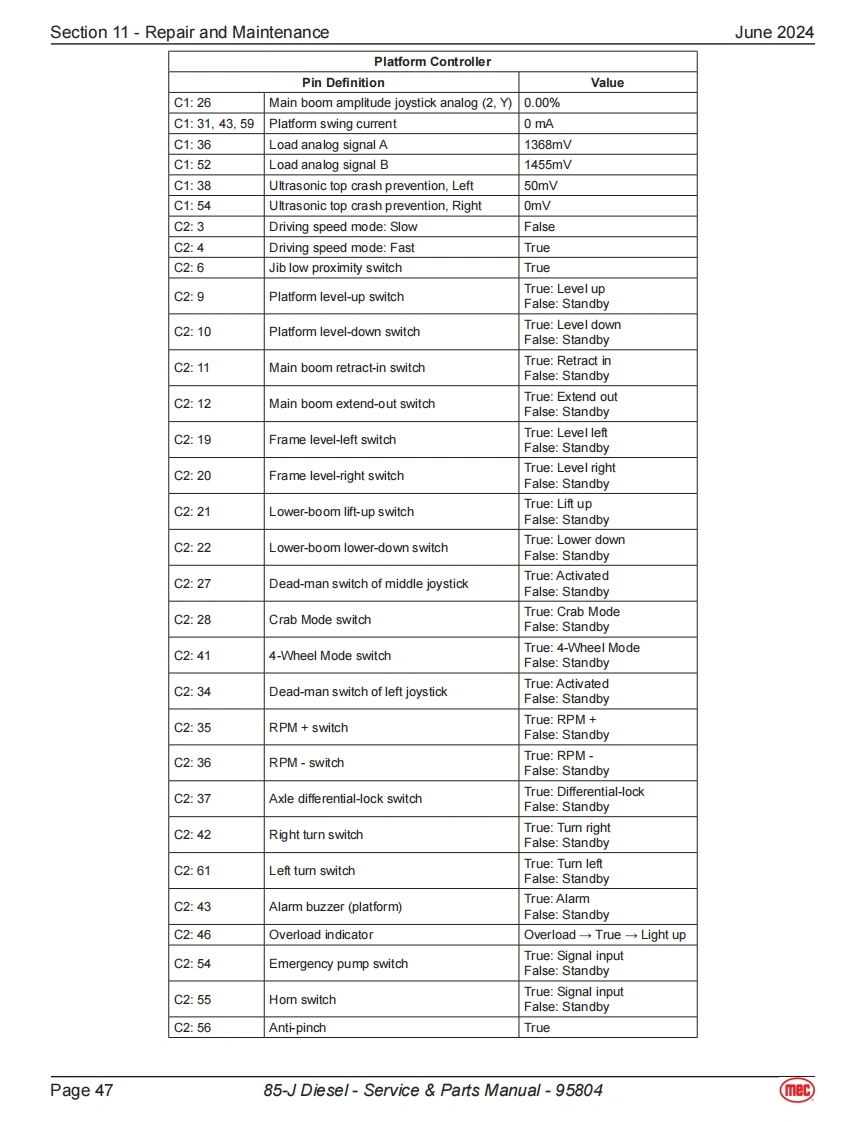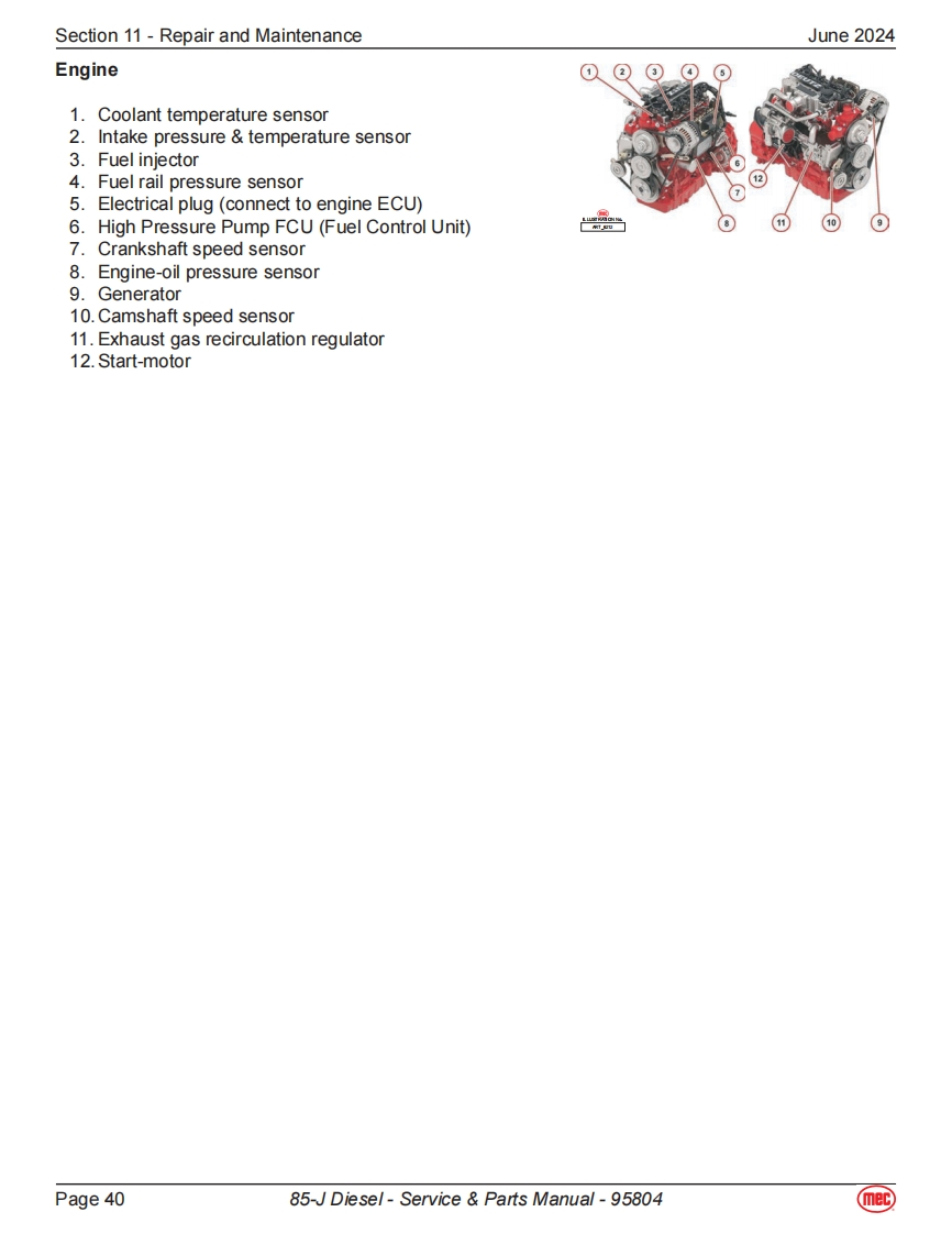Section 11-Repair and MaintenanceJune 2024Power Supply SystemAll the following components displayed in this section can be found onthe engine side of the boom machine.The image to the right show thelocation of the engine for a quick visual reference.BatteriesThe boom machine is equipped with 2 12-Volt 110ah batteries.These batteriesare used to power the control system and in the event of power failure,theycan be used to activate emergency operations.Fuse Box·Fuse13:80amps,connect to“Relay&Fuse Box”.Fuse 14:200amps,connect to Emergency Pump-Motor.Fuse 15:150amps,connect to Engine Preheating Device.Fuse 16:125amps,connect to Engine Generator.Relay DescriptionK1 Beacon BuzzerK2 Power supply to Main Controller,Display Chassis DeviceK3 Diesel Pump RelayFU1K4Horn RelayK5K5 Total Power RelayK6 SpareFU5①No.Fuse Description⑤FU10中FU1 30A Engine ECUQ器6K2FU225ABeacon Buzzer⑦u⑤20中白5白⑩FU330APower supply to Main Controller,Display Chassis DeviceK3FU420ADiesel PumpO盛墨Q5A白FU525AFU7+FU8K6K4K1FU630AFU9+FU10+FU11⑨⑨FU7 7.5A HornFU8 5A Key Switch,Bypass Switch,K2&K5FU97.5ASensor Power,Engine ECU Logic Supply FU12FU1010APVG ValveFU11 15APower supply for electrical equipment on boom and platformFU125A Engine Generator MagnetizationPage 3985-J Diesel-Service Parts Manual-95804mec