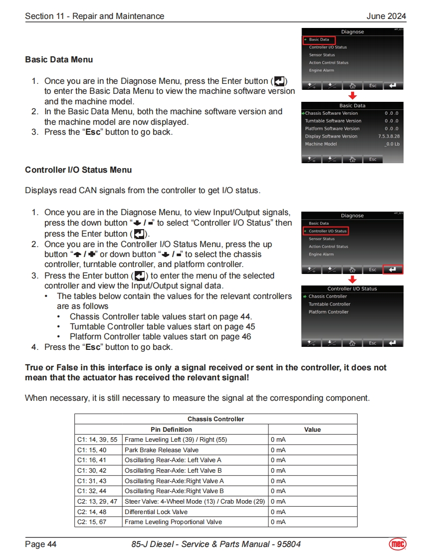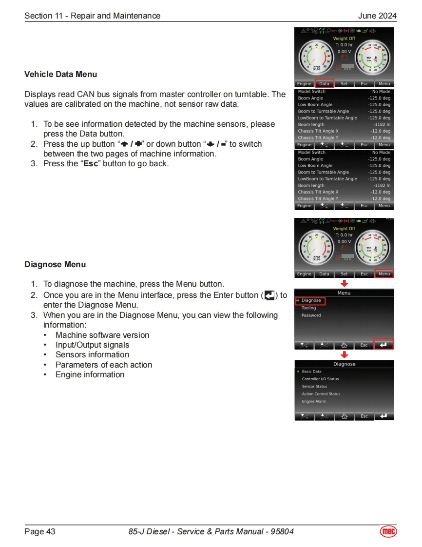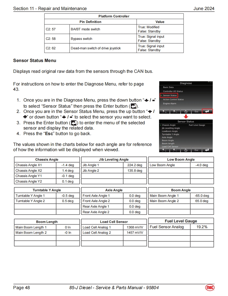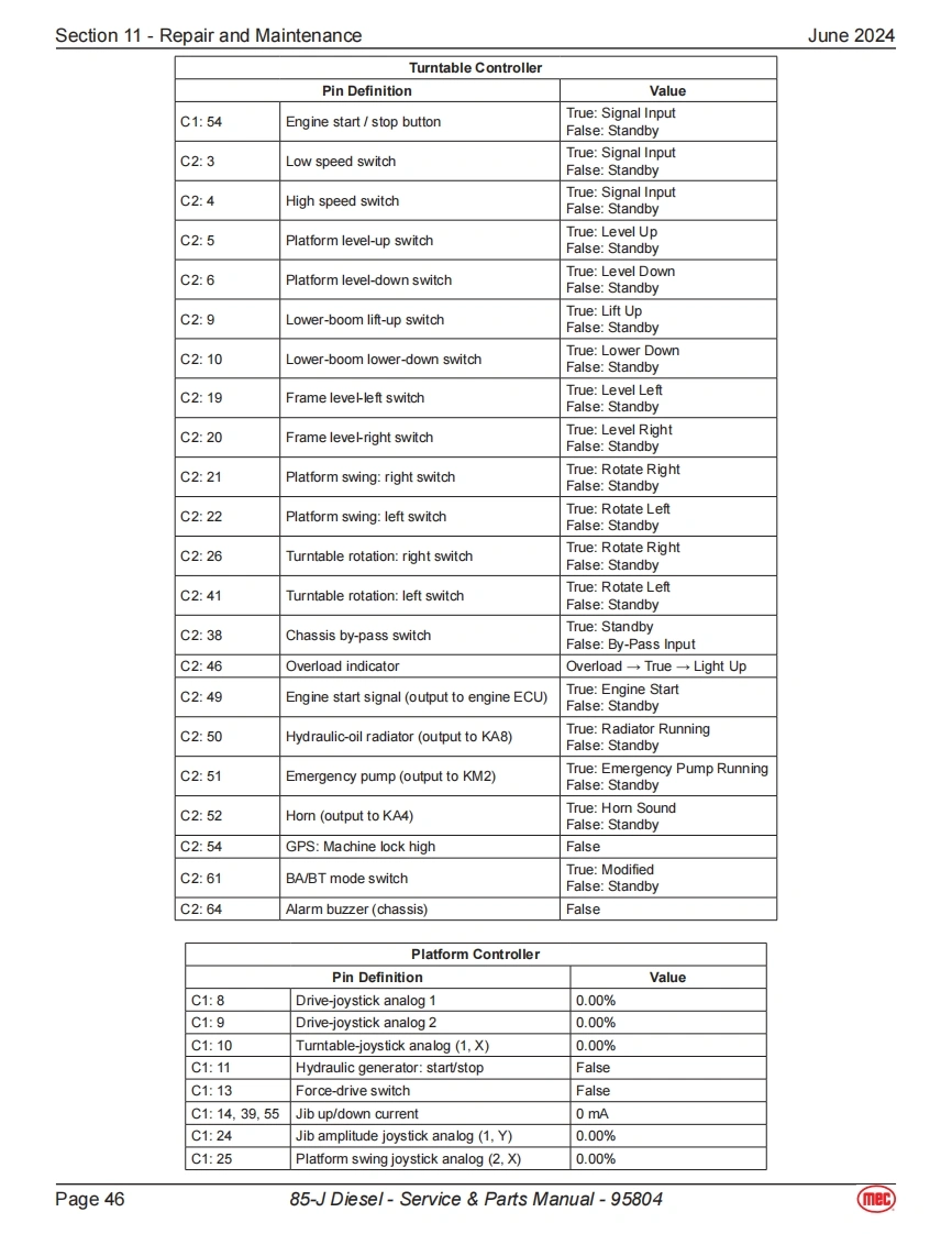 Section 11-Repair and MaintenanceJune 2024Power Supply SystemAll the following components displayed in this section can be found onthe engine side of the boom machine.The image to the right show thelocation of the engine for a quick visual reference.BatteriesThe boom machine is equipped with 2 12-Volt 110ah batteries.These batteriesare used to power the control system and in the event of power failure,theycan be used to activate emergency operations.Fuse Box·Fuse13:80amps,connect to“Relay&Fuse Box”.Fuse 14:200amps,connect to Emergency Pump-Motor.Fuse 15:150amps,connect to Engine Preheating Device.Fuse 16:125amps,connect to Engine Generator.Relay DescriptionK1 Beacon BuzzerK2 Power supply to Main Controller,Display Chassis DeviceK3 Diesel Pump RelayFU1K4Horn RelayK5K5 Total Power RelayK6 SpareFU5①No.Fuse Description⑤FU10中FU1 30A Engine ECUQ器6K2FU225ABeacon Buzzer⑦u⑤20中白5白⑩FU330APower supply to Main Controller,Display Chassis DeviceK3FU420ADiesel PumpO盛墨Q5A白FU525AFU7+FU8K6K4K1FU630AFU9+FU10+FU11⑨⑨FU7 7.5A HornFU8 5A Key Switch,Bypass Switch,K2&K5FU97.5ASensor Power,Engine ECU Logic Supply FU12FU1010APVG ValveFU11 15APower supply for electrical equipment on boom and platformFU125A Engine Generator MagnetizationPage 3985-J Diesel-Service Parts Manual-95804mec