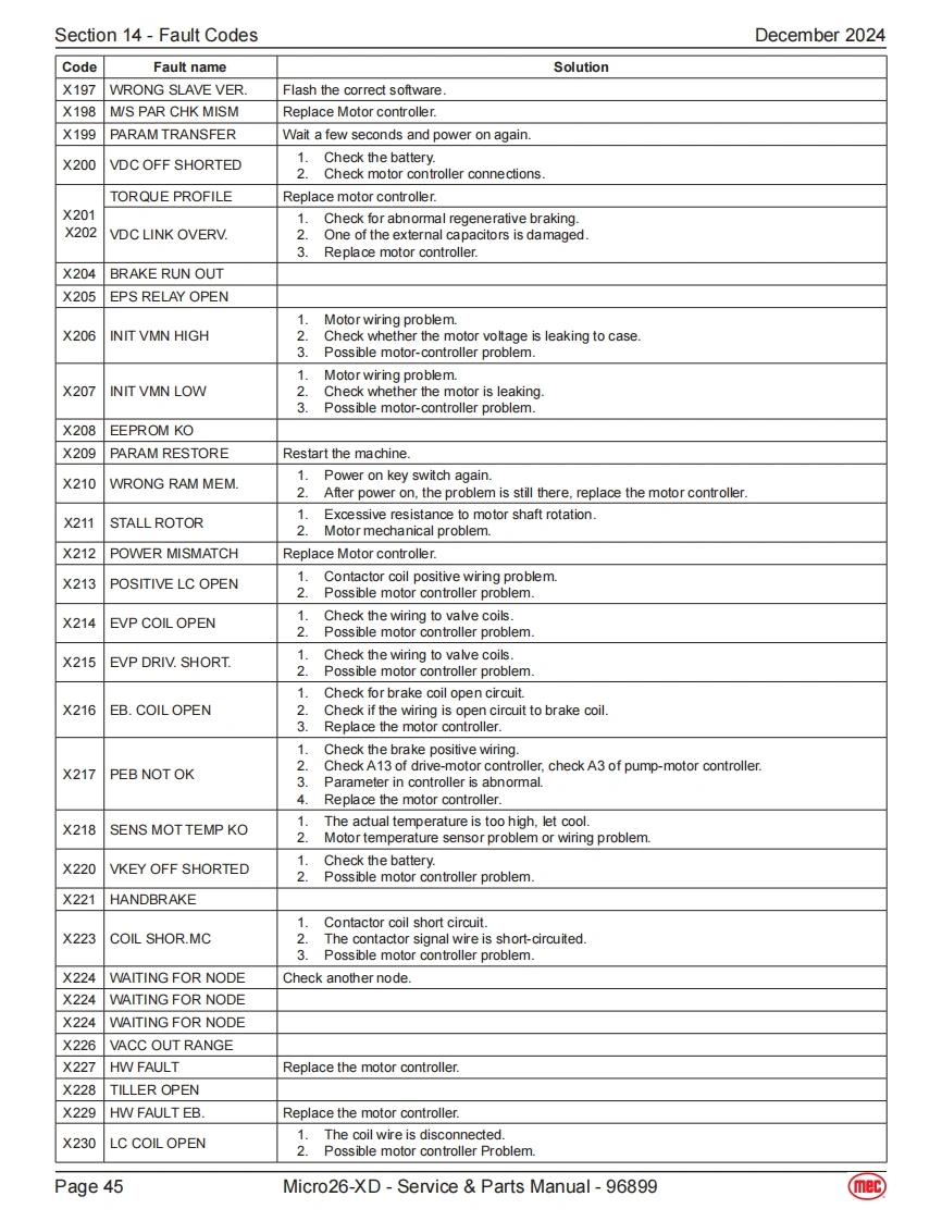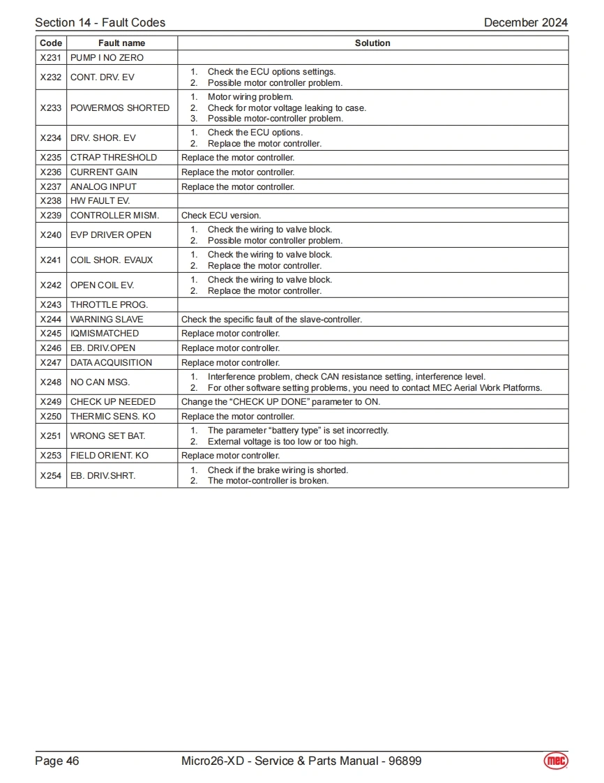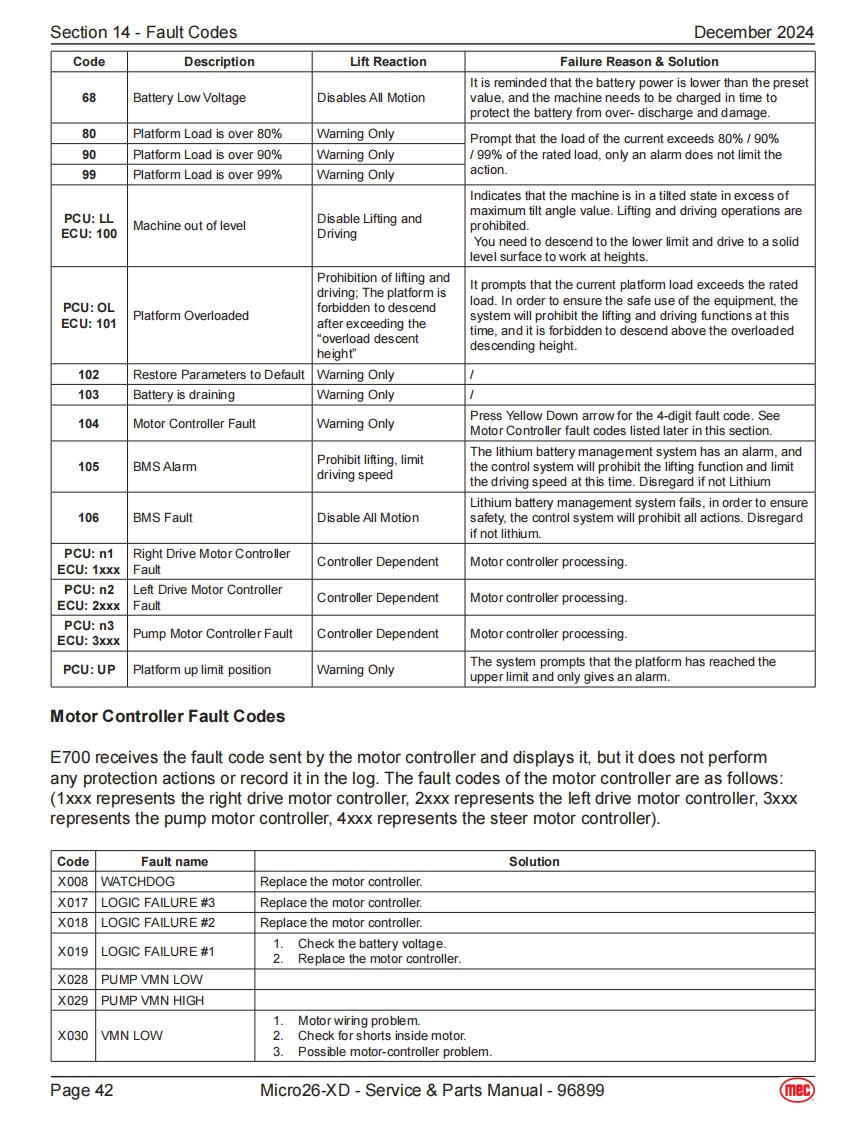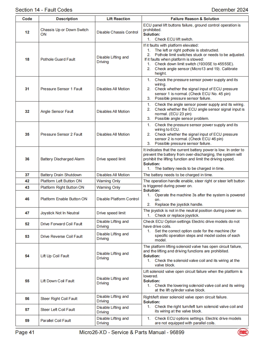 Section 14-Fault CodesDecember 2024Fault CodesThe LED readout screen displays fault codes that provide information about the machineoperating status and about malfunctions.The fault codes listed in the following chartsdescribe malfunctions and can aid in troubleshooting the machine by pinpointing the areaArt_5533or component affected.List of Fault CodesCodeDescriptionLift ReactionFailure Reason SolutionSystem initialization failure if fault last more than a couple01System Initialization FaultDisables All Motionseconds.The system will prohibit all actions.Solution:1.Try to power on again.The CAN bus communication between the upperlowercontroller is faulty,and the system will prohibit all actions.1.The lower or upper communication cable isdamaged.02System Communication FaultDisables All Motion2The upper control is faulty,replace the platformcontrol box.3.Measure battery voltage.4.Check power relay.5.Replace ECU.The current model code inside the ECU is not set to thecorrect model.03Solution:Invalid Option Setting FaultDisables All Motion1.Try to reset the mode code of the correspondingmodel (for specific operation steps and model codesof each model.1.If the angle sensor calibration fails,it may be thatthe angle sensor analog output changes too littleor no change during the calibration process.Checkwhether the angle sensor is firmly fixed,whether the04Calibration FaultWarning Onlypower supply and wiring are normal.Replace theangle sensor.2.No-load/full-load calibration fails,it may be that thepressure sensor and angle sensor analog outputchanges too little or no change during the calibrationprocess,or the machine is not level.Platform/base control key switch failure or up down08Key Switch ErrorDisables All Motioncontrol switching action is too fast.1.Try to restart the power supply.2.Replace Key switch.The built-in GPS module or external GPS modulecommunication failed (if equipped).Solution:09GPS Communication FaultWarning Only1.Check whether the connection between the CANcommunication bus of the external GPS module andthe CAN bus of the machine is normal.10MC Communication FaultWarning OnlyCheck whether the wiring of the motor controller is normal,check the wiring from the controller to the drive motor.Lithium battery BMS CAN bus communication failure,onlyalarm.BMS Communication FaultSolution:11(Lithium battery equippedWarning Only1.Check whether the CAN bus communicationonly)between the lithium battery and the machine isnormal.2.Replace the lithium battery.Page 40Micro26-XD-Service Parts Manual-96899(mec)