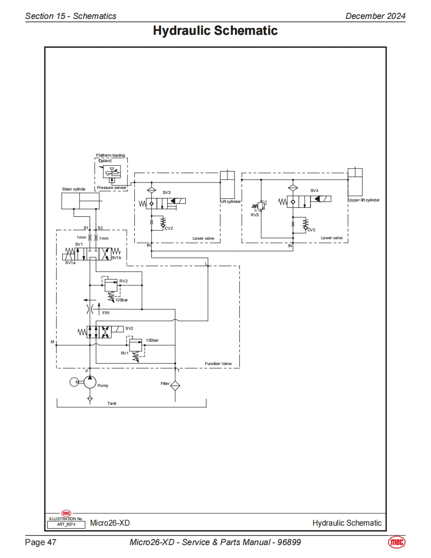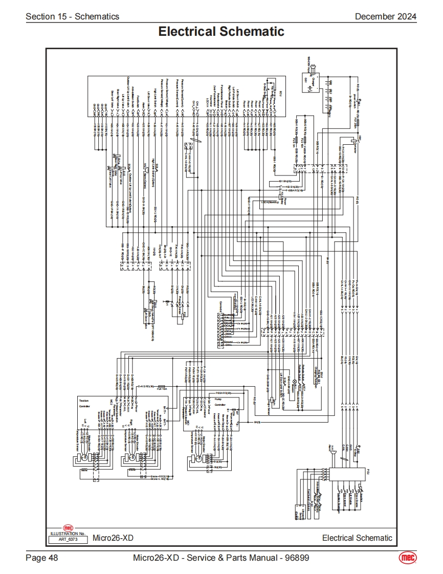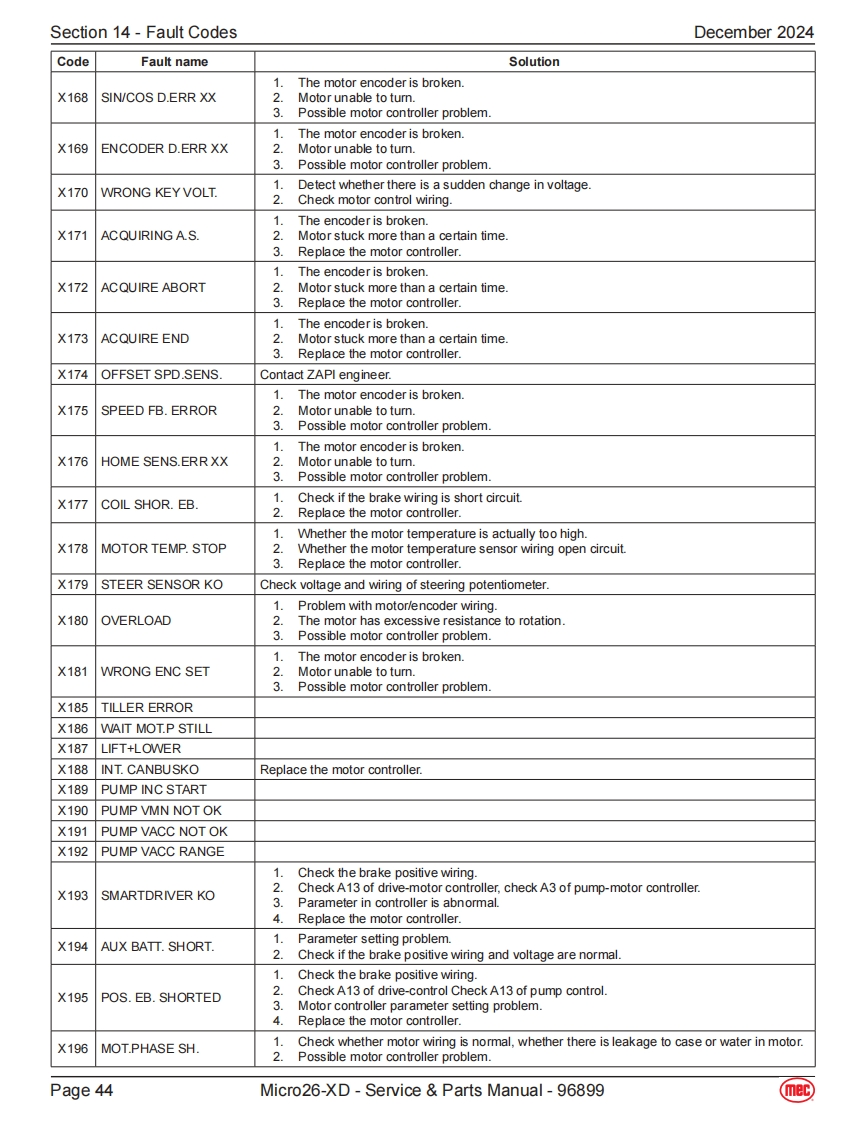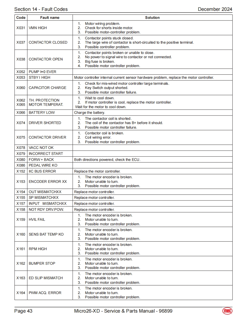 Section 14-Fault CodesDecember 2024Fault CodesThe LED readout screen displays fault codes that provide information about the machineoperating status and about malfunctions.The fault codes listed in the following chartsdescribe malfunctions and can aid in troubleshooting the machine by pinpointing the areaArt_5533or component affected.List of Fault CodesCodeDescriptionLift ReactionFailure Reason SolutionSystem initialization failure if fault last more than a couple01System Initialization FaultDisables All Motionseconds.The system will prohibit all actions.Solution:1.Try to power on again.The CAN bus communication between the upperlowercontroller is faulty,and the system will prohibit all actions.1.The lower or upper communication cable isdamaged.02System Communication FaultDisables All Motion2The upper control is faulty,replace the platformcontrol box.3.Measure battery voltage.4.Check power relay.5.Replace ECU.The current model code inside the ECU is not set to thecorrect model.03Solution:Invalid Option Setting FaultDisables All Motion1.Try to reset the mode code of the correspondingmodel (for specific operation steps and model codesof each model.1.If the angle sensor calibration fails,it may be thatthe angle sensor analog output changes too littleor no change during the calibration process.Checkwhether the angle sensor is firmly fixed,whether the04Calibration FaultWarning Onlypower supply and wiring are normal.Replace theangle sensor.2.No-load/full-load calibration fails,it may be that thepressure sensor and angle sensor analog outputchanges too little or no change during the calibrationprocess,or the machine is not level.Platform/base control key switch failure or up down08Key Switch ErrorDisables All Motioncontrol switching action is too fast.1.Try to restart the power supply.2.Replace Key switch.The built-in GPS module or external GPS modulecommunication failed (if equipped).Solution:09GPS Communication FaultWarning Only1.Check whether the connection between the CANcommunication bus of the external GPS module andthe CAN bus of the machine is normal.10MC Communication FaultWarning OnlyCheck whether the wiring of the motor controller is normal,check the wiring from the controller to the drive motor.Lithium battery BMS CAN bus communication failure,onlyalarm.BMS Communication FaultSolution:11(Lithium battery equippedWarning Only1.Check whether the CAN bus communicationonly)between the lithium battery and the machine isnormal.2.Replace the lithium battery.Page 40Micro26-XD-Service Parts Manual-96899(mec)