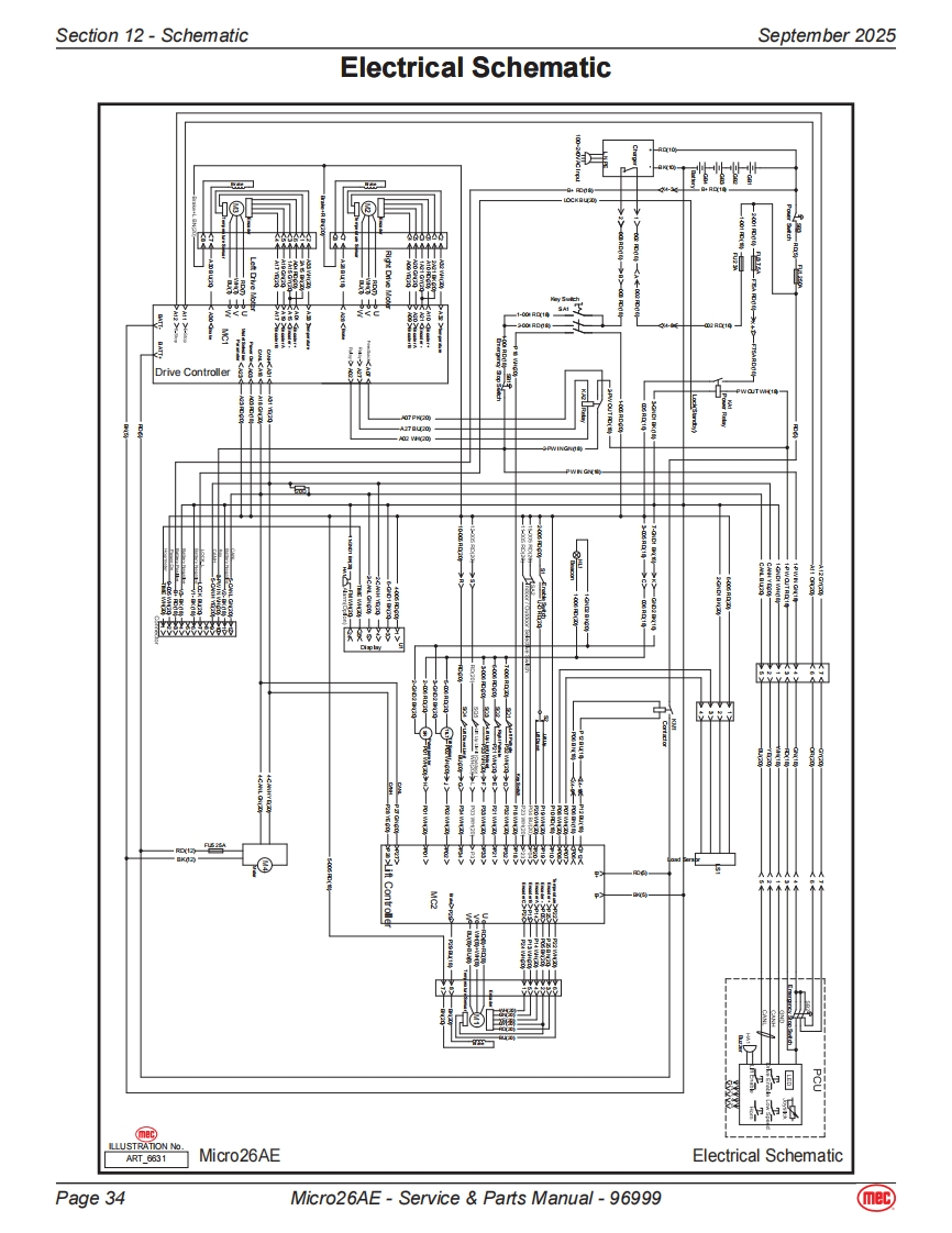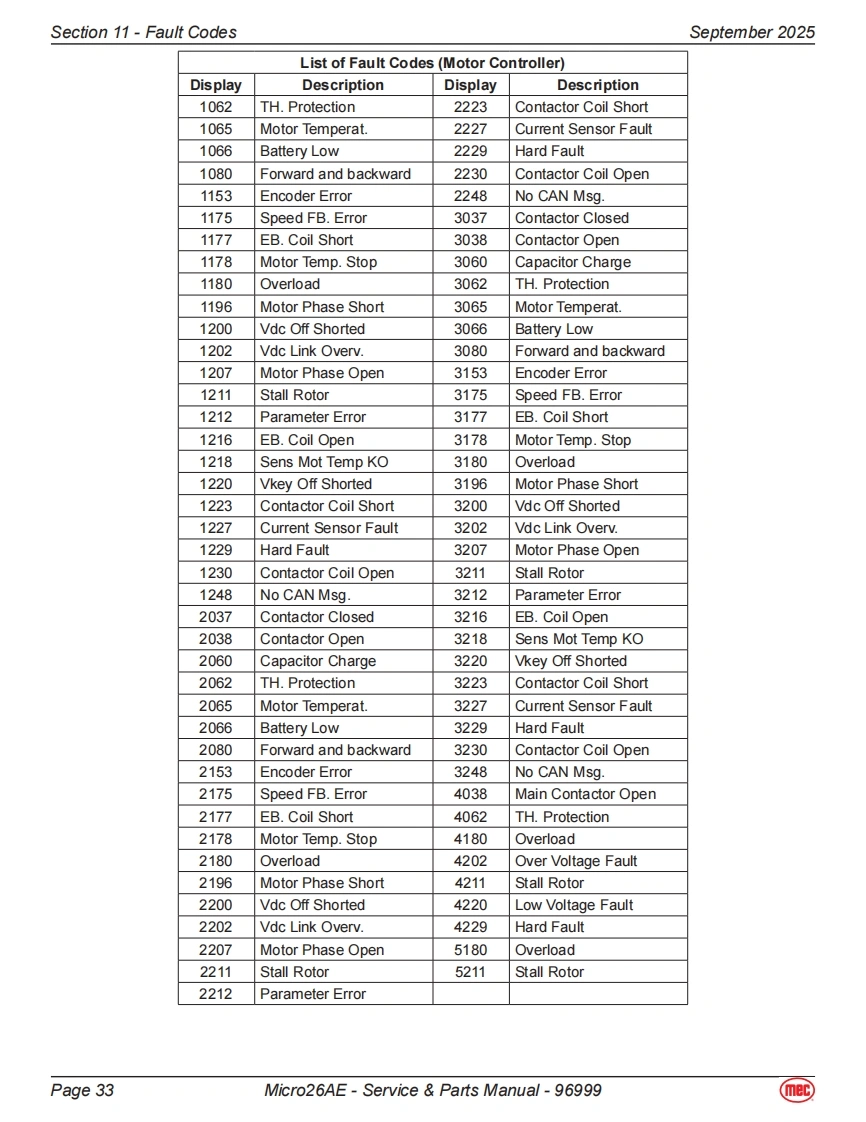 Section 11-Fault CodesSeptember 2025Fault CodesThe LED readout screen displays fault codes that provide information about the machineoperating status and about malfunctions.The fault codes listed in the following chartsdescribe malfunctions and can aid in troubleshooting the machine by pinpointing the areaor component affected.List of Fault CodesDisplayDescriptionLift Reaction01 System Initialization FaultSystem Initialization FaultDisables All Motion02 System Communication FaultSystem Communication FaultDisables All Motion03 Invalid Option Setting FaultInvalid Option Setting FaultDisables All Motion04 Calibration IncompleteCalibration IncompleteWarning Only05 Left MC FaultLeft MC FaultDisables All Motion06 Right MC FaultRight MC FaultDisables All Motion07 Lift MC FaultLift MC FaultDisables All Motion08 Steer MC FaultSteer MC FaultDisables All Motion09 Left MC Communication FaultLeft MC Communication FaultDisables All Motion10 Right MC Communication FaultRight MC Communication FaultDisables All Motion11 Pump MC Communication FaultPump MC Communication FaultDisables All Motion12 Steer MC Communication FaultSteer MC Communication FaultDisables All Motion13 Chassis Up or Down Switch ONChassis Up or Down Switch ONDisables All Motion14 Load Sensor Communication FaultLoad Sensor Communication FaultDisables All Motion18 Pothole Guard FaultPothole Guard FaultDisable Lifting and Driving31 Load Sensor FaultLoad Sensor FaultDisables All Motion32 Angle Sensor FaultAngle Sensor FaultDisables All Motion36 Low Battery LimpLow Battery LimpDrive speed limit37 Battery SleepBattery SleepWarning Only42 Platform Left Button ONPlatform Left Button ONWarning Only43 Platform Right Button ONPlatform Right Button ONWarning Only46 Platform Enable Button ONPlatform Enable Button ONDisable Platform Control47 Joystick Not In NeutralJoystick Not In NeutralDrive speed limit68 Battery Low Voltage FaultBattery Low Voltage FaultDisables All Motion80 Platform Load is over 80%Platform Load is over 80%Warning Only90 Platform Load is over 90%Platform Load is over 90%Warning Only99 Platform Load is over 99%Platform Load is over 99%Warning Only100 Machine InclinedMachine InclinedDisable Lifting and Driving100 Platform OverloadedPlatform OverloadedDisable All Motion101 Restore Parameters to DefaultRestore Parameters to DefaultWarning Only102 Battery is drainingBattery is drainingBattery is drainingList of Fault Codes(Motor Controller)DisplayDescriptionDisplayDescription1037Contactor Closed2216EB.Coil Open1038Contactor Open2218Sens Mot Temp KO1060Capacitor Charge2220Vkey Off ShortedPage 32Micro26AE-Service Parts Manual-96999(mec)