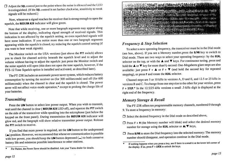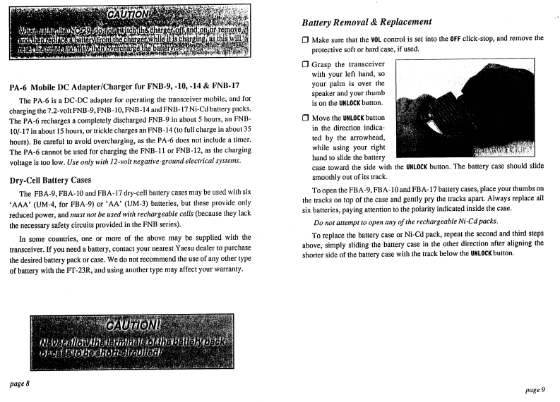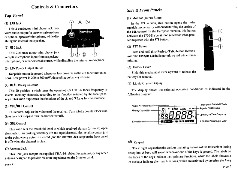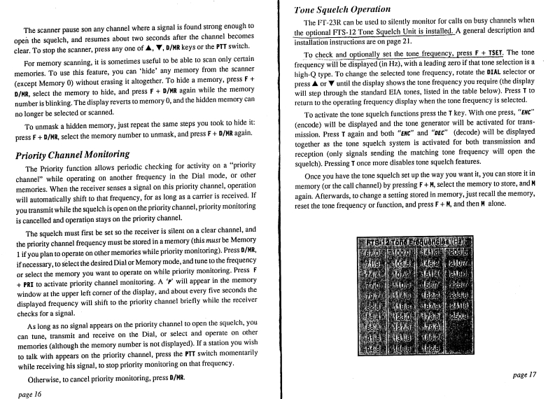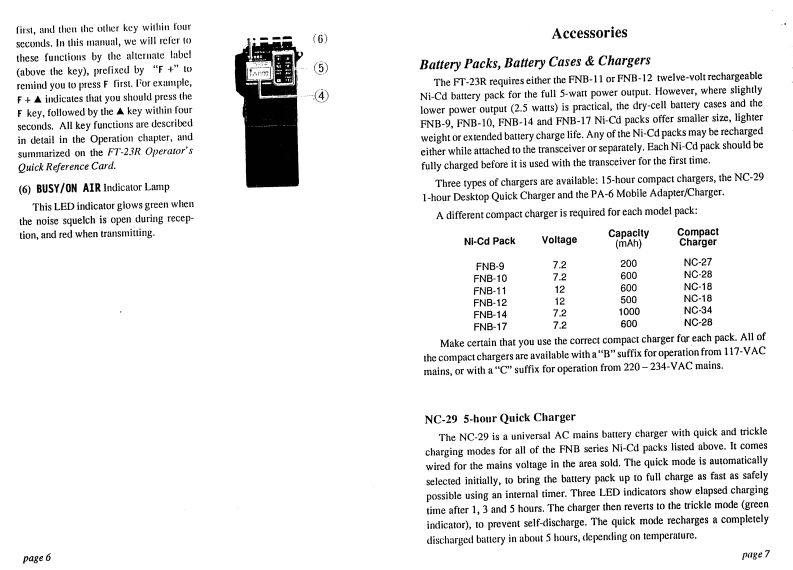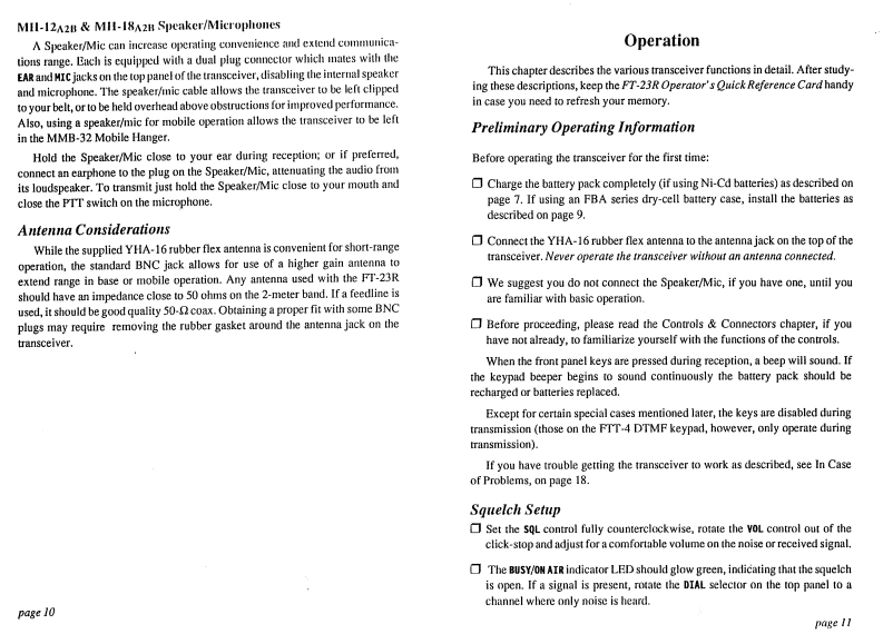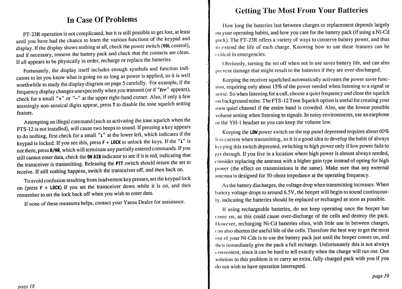 AmateurContents?RadioFT-23RSpecifications三.DirectoryGeneralOPERATINGReceiver2222TransmitterAccessories Options List3MANUALControls Connectors4Top PanelSide Front Panels5Accessories7Battery Packs,Battery Cases ChargersNC-29 5-hour Quick Charger77PA-6 Mobile DC Adapter/Charger for FNB-9,-10.-14 FNB-178Dry-Cell Batfery Cases8Battery Removal ReplacementMH-12A2B MH-18A2B Speaker/MicrophonesAntenna Considerations1Operation11Preliminary Operating InformationSquelch Setup11Transmitting1Frequency Step SelectionMemory Storage RecallRepeater Operation1Non-Standard Repeater SplitsScanningPriority Channel Monitoring5156Tone Squelch OperationIn Case Of Problems1Getting The Most From Your Batteries19YAESU MUSEN CO.,LTD.Memory Cloning20C.P.0.BOX 1500,TOKYO,JAPANInstallation of Options2FTS-12 Tone Squelch Unit Installation1YAESU U.S.A.If FTT-4 is NOT Installed17210 Edwards Rd.,Cerritos,Caffornia 90701,U.S.A.If FTT-4 IS Installed1223YAESU EUROPE B.V.FTT-4 DTMF Keypad InstallationSnipweg 3.1118AA Schiphol,The Netherlands