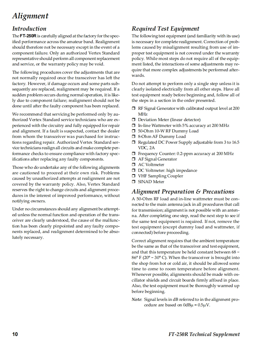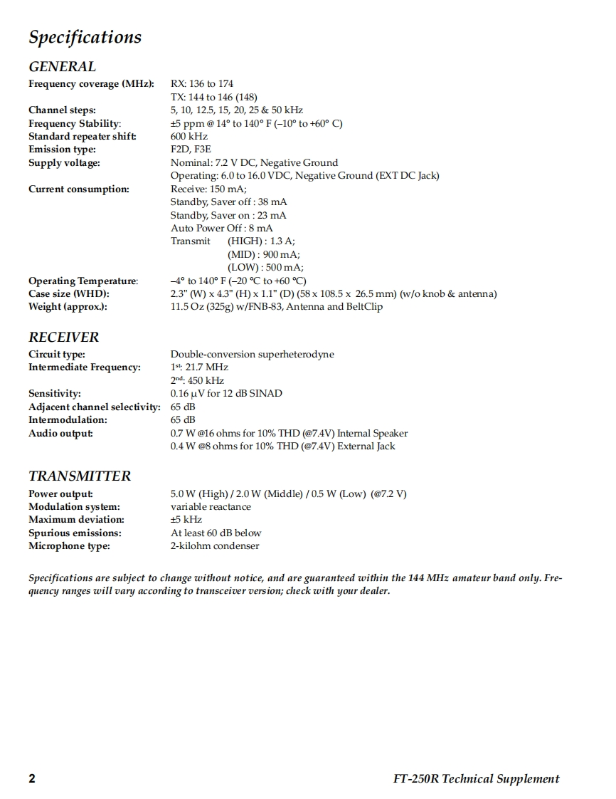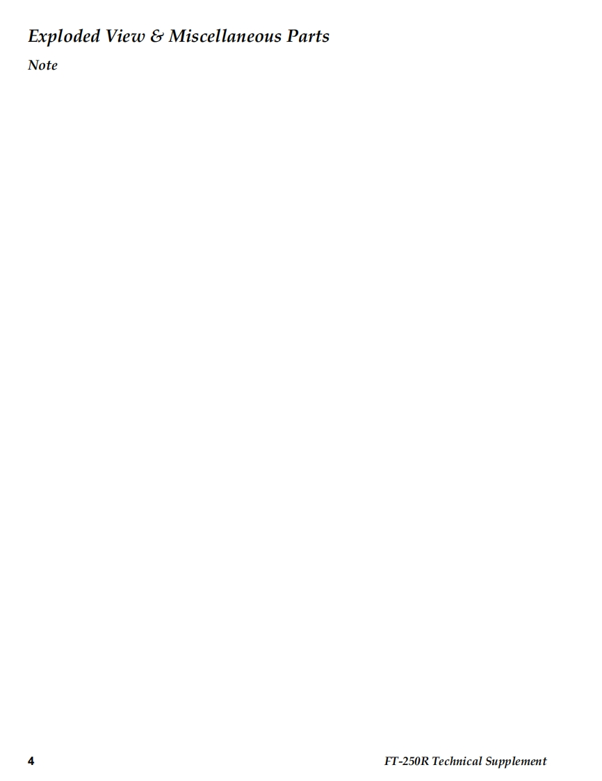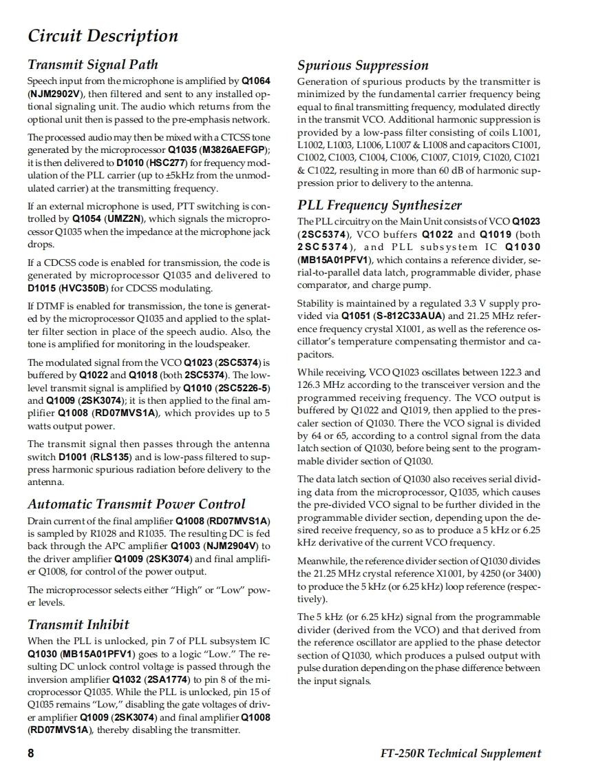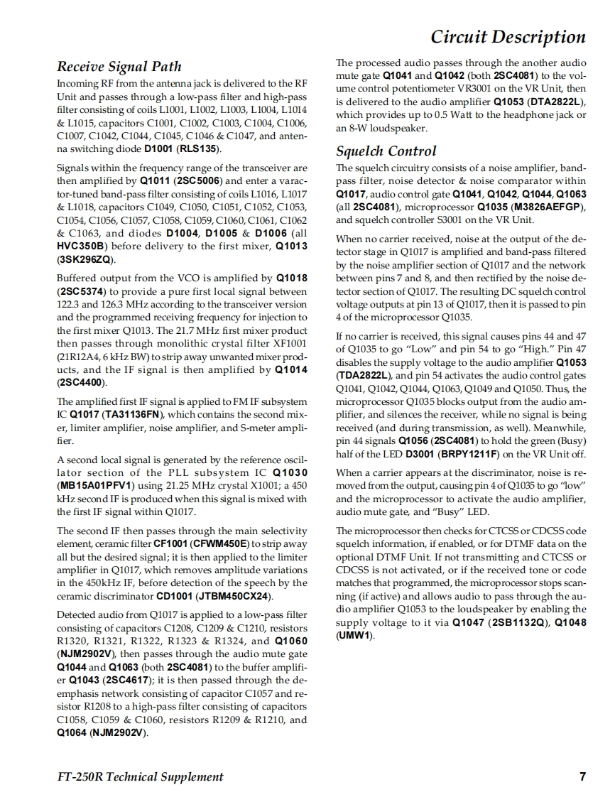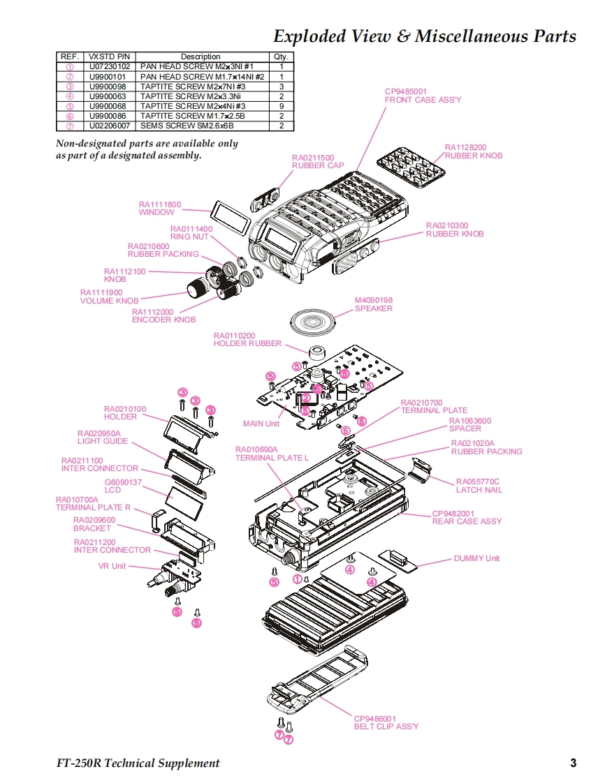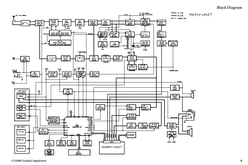 SYAESUVERTEX STANDARD CO.,LTD.4-8-8 Nakameguro,Meguro-Ku,Tokyo 153-8644,JapanVERTEX STANDARDet.CypresCAFT-250RYAESU UK LTD.Unit 12.Sun Valley Business Park,Winnall CloseWinchester,Hampshire,SO23 OLB.U.K.Technical SupplementVERTEX STANDARD HK LTD.Unit 5,20/F.,Seaview Centre,139-141 Hoi Bun Road.Kwun Tong,Kowloon,Hong KongVERTEX STANDARD(AUSTRALIA)PTY.,LTD.Nomanby Business Park,Unit 14/45 Normanby RoadC2009 VERTEX STANDARD CO.,LTD.EHO38N90ANotting Hill 3168,Victoria,AustraliaIntroductionThis manual provides the technical information necessary for servicing the FT-250RVHF FM Transceiver.Servicing this equipment requires expertise in handing surface-mount chip compo-nents.Attempts by non-qualified persons to service this equipment may result inpermanent damage not covered by the warranty,and may be illegal in some coun-tries.Two PCB layout diagrams are provided for each double-sided board in this trans-ceiver.Each side of the board is referred to by the type of the majority of componentsinstalled on that side("Side A"or"Side B").In most cases one side has only chipcomponents(surface-mount devices),and the other has either a mixture of both chipand leaded components (trimmers,coils,electrolytic capacitors,ICs,etc.),or leadedcomponents only.While we believe the information in this manual to be correct,VERTEX STANDARDassumes no liability for damage that may occur as a result of typographical or othererrors that may be present.Your cooperation in pointing out any inconsistencies inH0800the technical information would be appreciated.Important NoteThe transceiver was assembled using Pb (lead)free solder,based on the RoHSspecification.Only lead-free solder(Alloy Composition:Sn-3.0Ag-0.5Cu)should be used1213for repairs performed on this apparatus.The solder stated above utilizes thealloy composition required for compliance with the lead-free specification,and any solder with the above alloy composition may be used.ContentsSpecifications.........2Exploded View Miscellaneous Parts ....3Bl0 ck Diagram.…Circuit Description..7Alignment......10Board Units(Schematics,Layouts Parts)Main Unit..15VR Unit…31SW Unit.......32DUMMY Unit.32