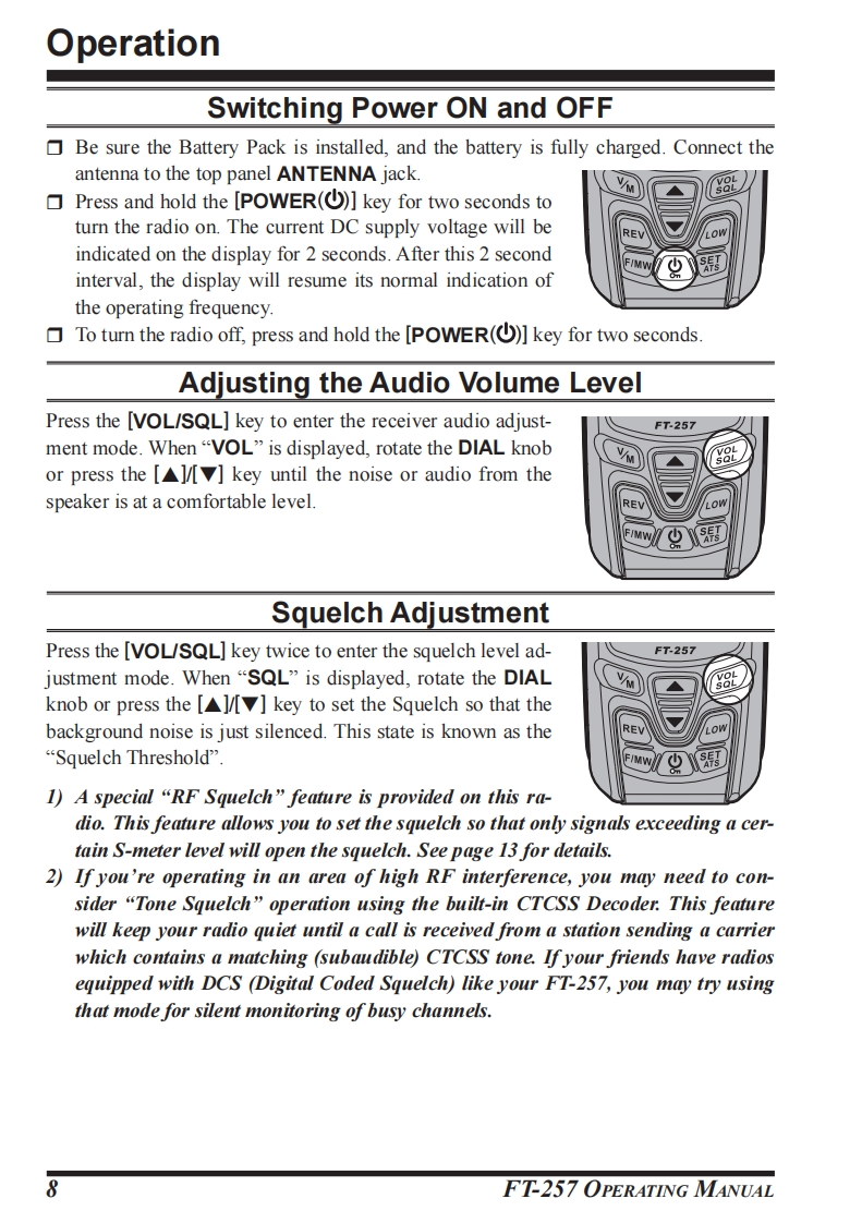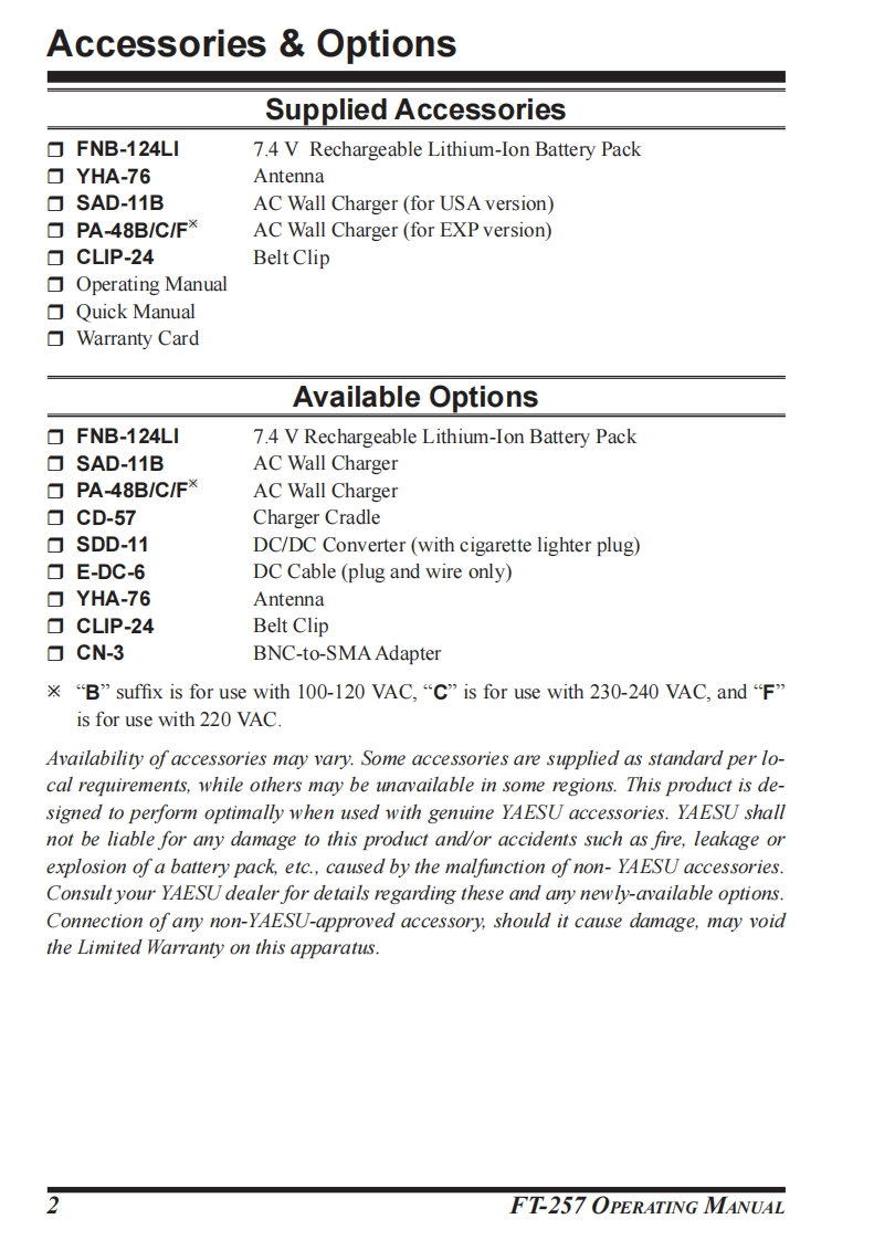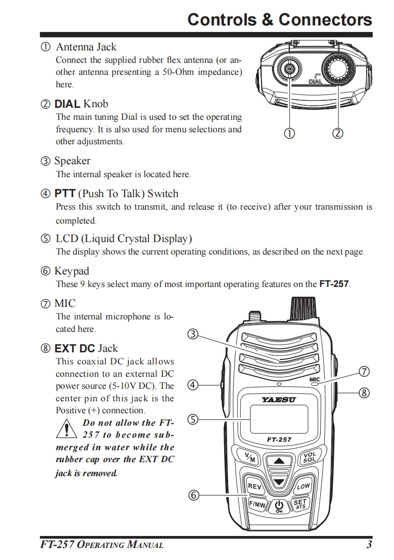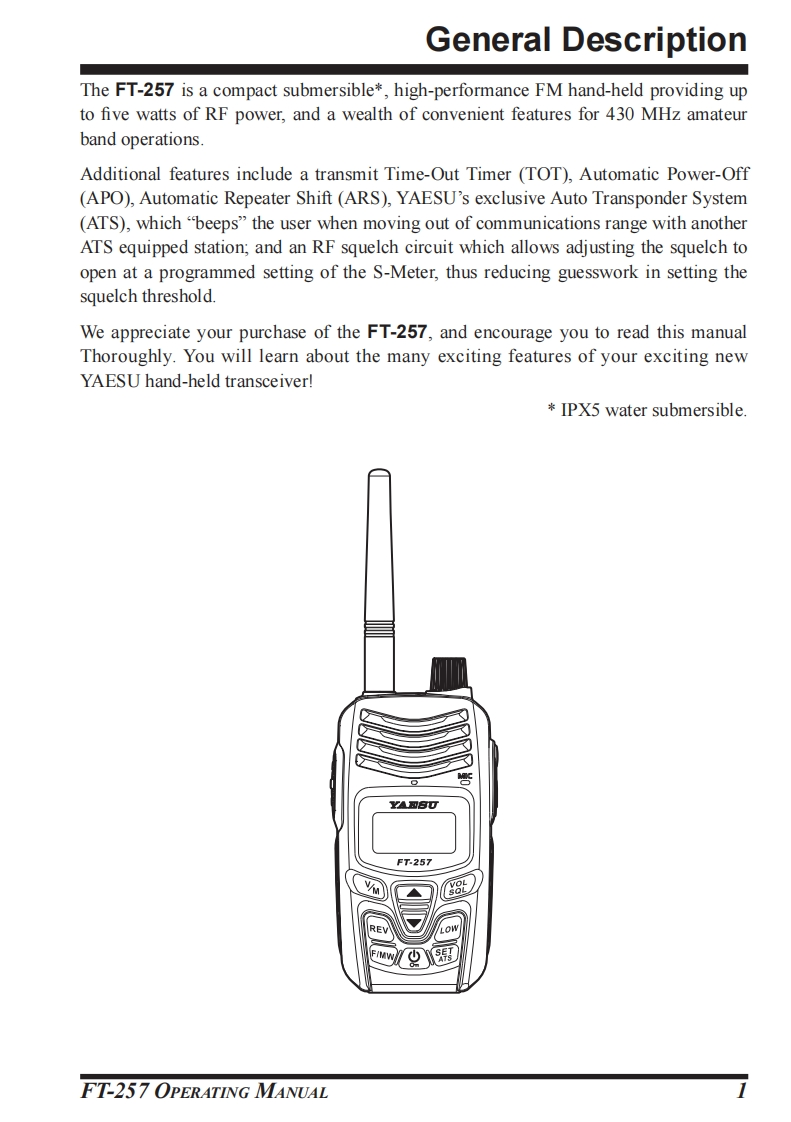 YAESUThe radioUHF FM TRANSCEIVERF1T-257OPERATING MANUALYAESUFT-257V/Mg8趾YAESU MUSEN CO.,LTD.Tennozu Parkside Building2-5-8 Higashi-Shinagawa,Shinagawa-ku,Tokyo 140-0002 JapanYAESU USAREV6125 Phyllis Drive,Cypress,CA90630,U.S.A.YAESU UKFIMWUnit 12,Sun Valley Business Park,Winnall CloseWinchester,Hampshire,S023 OLB.U.K.mYAESU HKUnit 2002,20/F,9 Chong Yip Street.Kwun Tong,Kowloon,Hong Kong