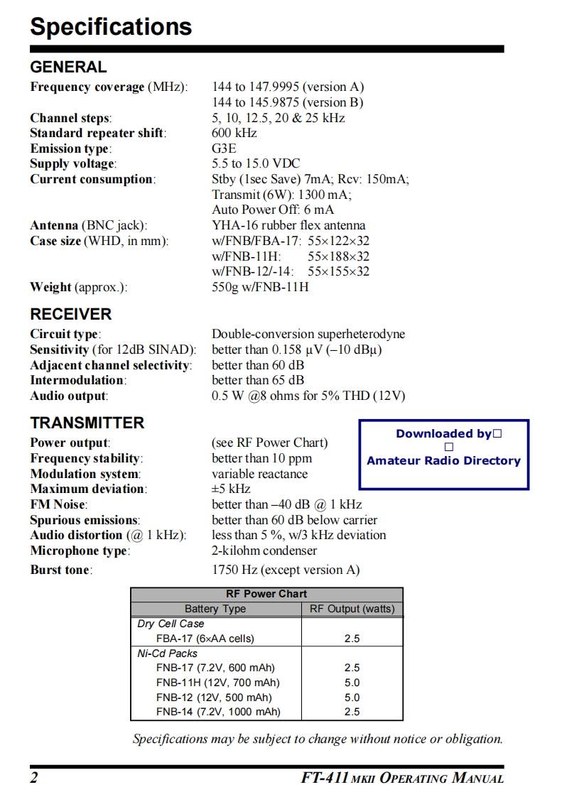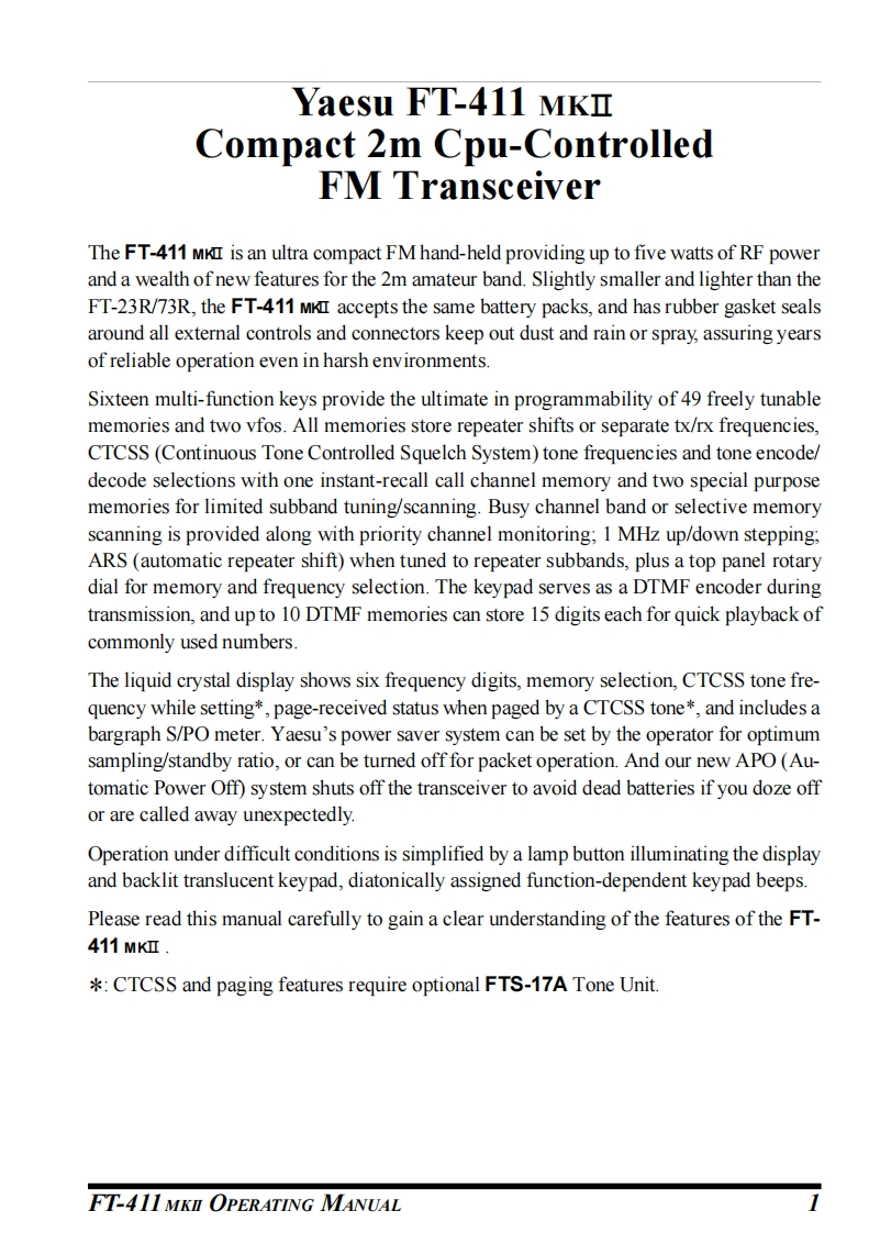 YAESU144 MHz FM TRANSCEIVERFT-411MKⅫOPERATING MANUALDownloaded by▣▣Amateur Radio DirectoryYAESUw5000当岛野当B暨間。当尚:回YAESU MUSEN CO.,LTD.1-20-2 Shimomaruko,Ota-Ku,Tokyo 146-8649,JapanYAESU U.S.A.17210 Edwards Rd.,Cerritos,CA 90703,U.S.AYAESU EUROPE B.V.P.O.Box 75525 1118 ZN,Schiphol,The NetherlandsYAESU UK LTD.Unit 12,Sun Valley Business Park,Winnall CloseWinchester,Hampshire,SO23 0LB,U.K.YAESU GERMANY GmbHAm Kronberger Hang 2,D-65824 Schwalbach,GermanyYAESU HK LTD.11th Floor Tsim Sha Tsui Centre,66 Mody Rd.,Tsim Sha Tsui East,Kowloon,Hong Kong