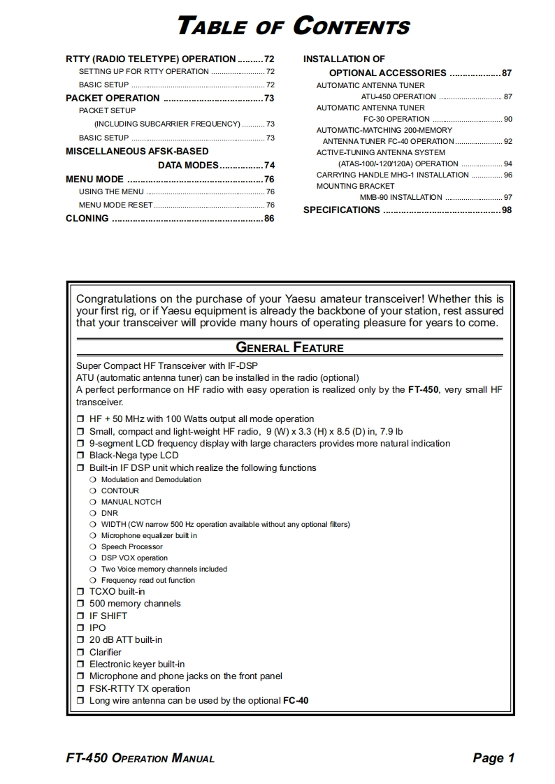 YAESUHF/50 MHZ TRANSCEIVERFT-450OPERATION MANUALDownloaded byRadioAmateur.EU晋器四巴智2l295.000-VERTEX STANDARD CO.,LTD.4-8-8 Nakameguro,Meguro-Ku,Tokyo 153-8644.JapanVERTEX STANDARDUS Headquarters10900 Walker Street.Cypress,CA 90630.U.S.A.YAESU EUROPE B.V.P.O.Box 75525,1118 ZN Schiphol,The NetherlandsYAESU UK LTD.Unit 12,Sun Valley Business Park,Winnall CloseWinchester.Hampshire.SO23 OLB.U.K.VERTEX STANDARD HK LTD.Unit 5,20/F..Seaview Centre,139-141 Hoi Bun Road,Kwun Tong,Kowloon,Hong KongVERTEX STANDARD(AUSTRALIA)PTY.,LTD.Normanby Business Park,Unit 14/45 Normanby RoadNotting Hill 3168,Victoria,Australia