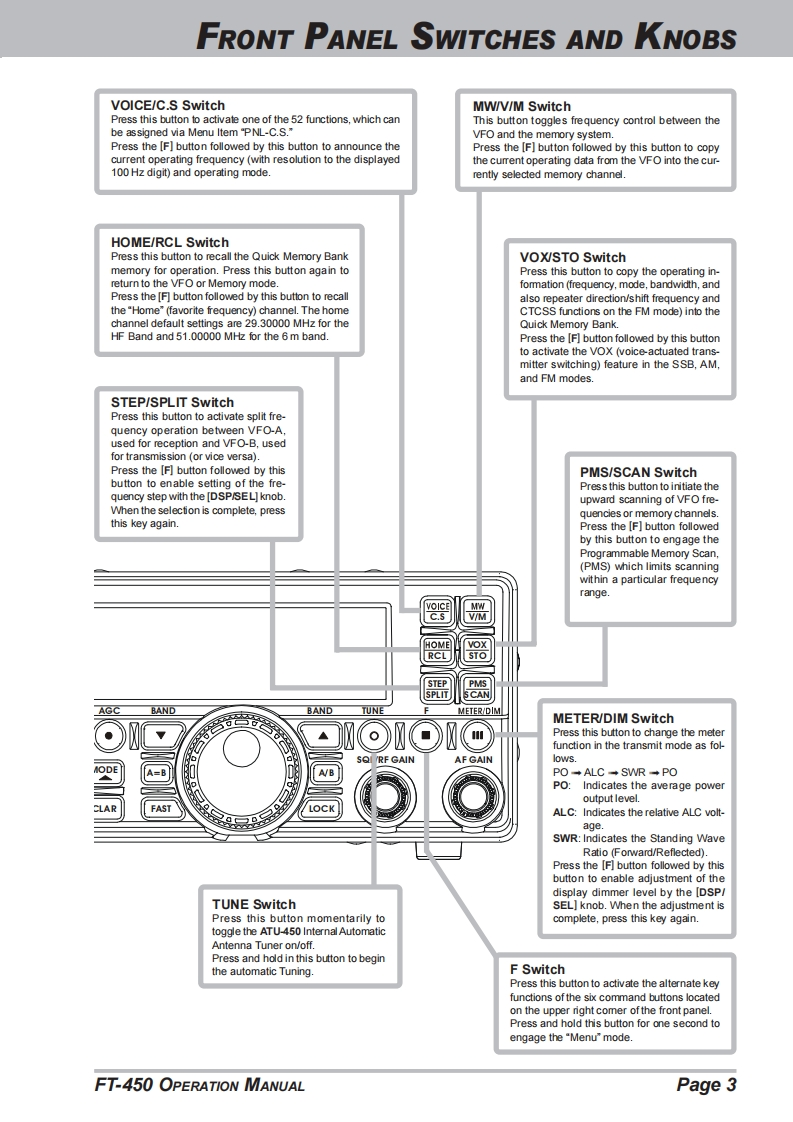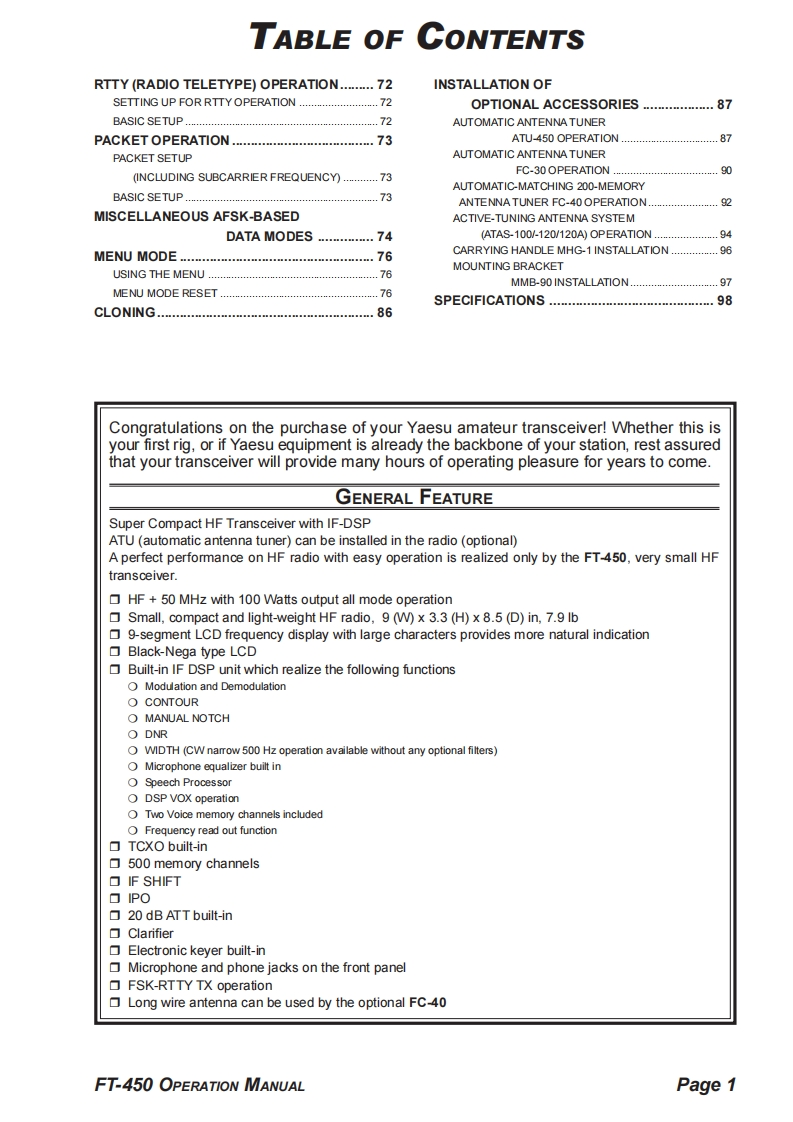YAESUHF/50 MHz TRANSCEIVERFT-450OPERATION MANUAL咒晋器器巴盟2129S.00月VERTEX STANDARD CO.,LTD.4-8-8 Nakameguro,Meguro-Ku.Tokyo 153-8644.JapanVERTEX STANDARDUS Headquarters10900 Walker Street.Cypress.CA 90630.U.S.AYAESU EUROPE B.V.P.O.Box 75525,1118 ZN Schiphol.The NetherlandsYAESU UK LTD.Unit 12,Sun Valley Business Park,Winnall CloseWinchester.Hampshire.SO23 OLB.U.K.VERTEX STANDARD HK LTD.Unit 5,20/F.,Seaview Centre,139-141 Hoi Bun Road,Kwun Tong.Kowloon,Hong KongVERTEX STANDARD(AUSTRALIA)PTY.,LTD.Normanby Business Park.Unit 14/45 Normanby RoadNotting Hill 3168,Victoria,Australia