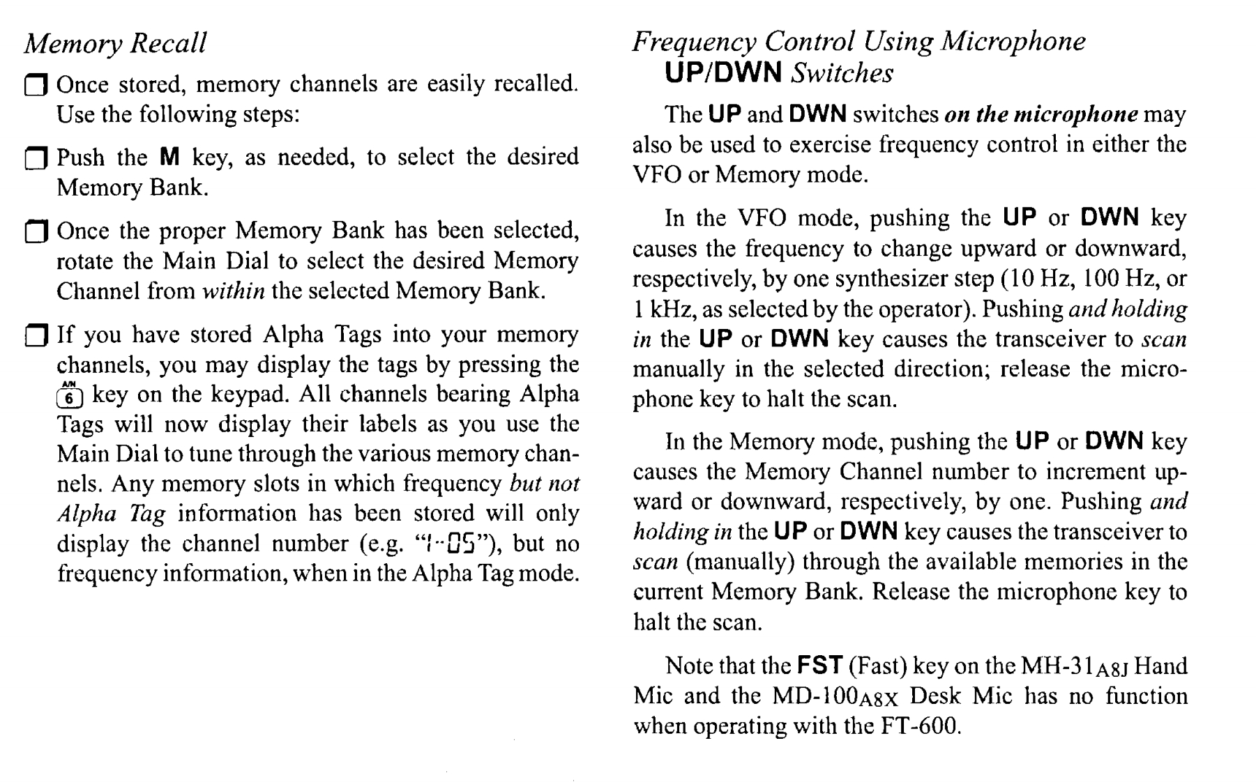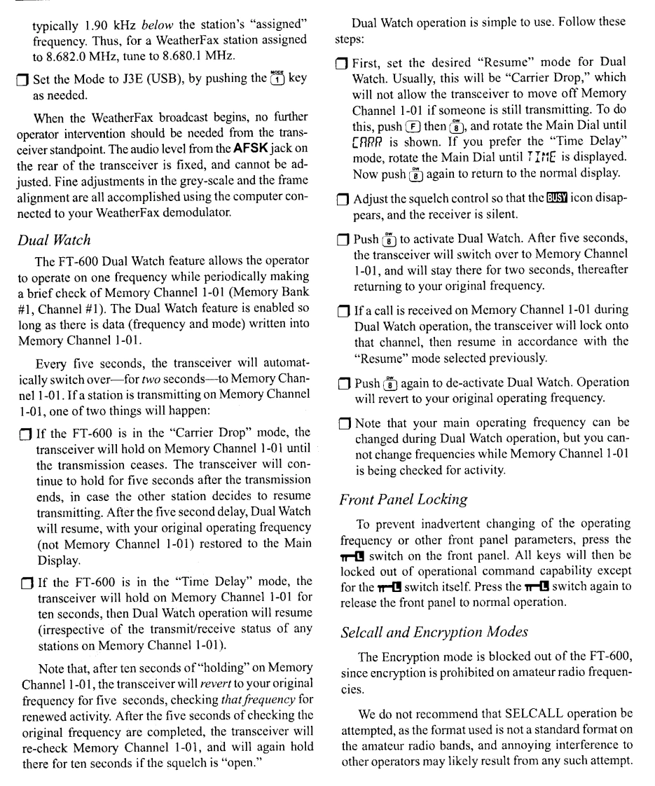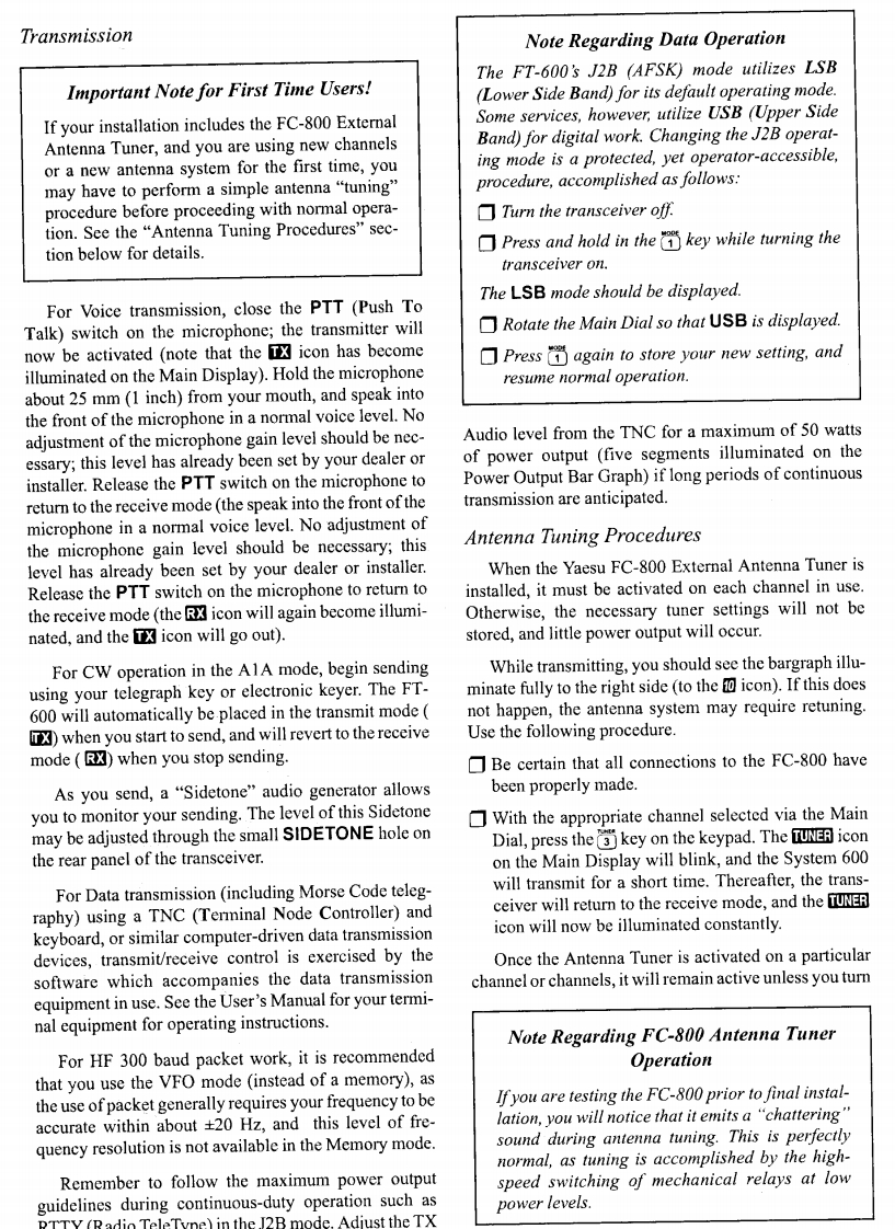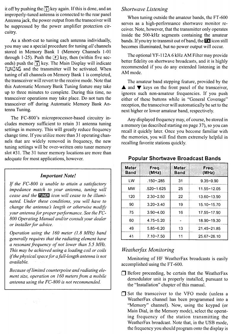 I.SpecificationsGeneralReceiverReceiver Frequency Range:Circuit Type:Double-conversion Superheterodyne50kHz~29.99999MHzIntermediate Frequencies:Transmitter Frequency Range:1st47.055MHz,2nd:8.215MHz1.8~29.99999 MHz (Selected memory channelsSensitivity (for 10 dB S/N):and/or ITU marine channels;Amateur Radio bands0.5~1.8MHzJ2B/J3E/A1A2μV,A3E8μVonly in FT-600).1.8~29.999MHz:J2B/J3E/A1A0.25μV,A3E1uVEmission Modes:J3E(USB,LSB)Squelch Sensitivity:A1A(CW),A3E (AM)Better than 2uV(1.8~29.999MHz)H3E(2182 Mode only,Marine version only)J2B (USB,LSB)IF Rejection:Better than 60dB(1.8~29.999MHz)Image Rejection:Better than 70dB(1.8~29.999MHz)Frequency Synthesizer Step Resolution:10 Hz,100 Hz,1 kHzSelectivity:J2B/J3E/A3E-Narrow/H3E-Narrow/A1A-Wide 2.2Frequency Stability:kHz (-6 dB),5.0 kHz (-60 dB)±l0 ppm from0℃~+40℃(Standard Version)A1A-Narrow 500 Hz(-6 dB),1.2 kHz (-60 dB)A3E±2 ppm from0℃~+50℃(w/TCXO-4 Option)6.0kHz(-6dB),12.0kHz(60dB)Operating Temperature Range:-10C~+50CClarifier Range:+300 HzAntenna Impedance:Audio Output:50 nominal (2:1 Maximum Permitted SWR)At least 1.5 watts into 4 (@10%THD or less)Supply Voltage:13.5 V DC +10%,negative groundConducted Radiation:Less than-55 dBmPower Consumption:Spurious Responses:1.2 A (Receive,no signal)Below I mV equivalent signal level.(Except discrete20 A (Transmit,100 watts output)spurious responses at 5.2428 MHz,8.2150 MHz,Dimensions (WHD):244 x 104 x 286 mm10.4857MHz,and19.6610MHz)Weight (approx.):4.5 kg (9.9 Ibs.)FC-800 Antenna Tuner (Option)TransmitterOperating frequency range:1.8~30 MHz with 12m+end-fed wire;Power Output:100 watts (J2B,J3E,A1A)3.5~30 MHz with 2.6m whip25 watts AM Carrier(A3E,H3E)Matching impedance:50 Ohms (unbalanced)Modulation Types:Maximum transmitter power:150 watts PEPSSB:Balanced modulator,filtered carrierMaximum SWR after tuning:AM:Low-level (early stage)1.5:1 (if antenna is not a multiple ofSpurious Radiation:40 dB below peak outputRequired RF power for tuning:10 watts(+3W)SSB Carrier Suppression:Tuning time:>40 dB below peak output3 s typical,10 s maximum (for one channel)Undesired Sideband Suppression:Power requirements:At least 50 dB below peak output@1.5 kHz modula-13.5 V DC+15%@700 mA (from FC-800 jack ontion inputrear of transceiver)SSB Audio Response:Operating temperature range:Not more than-6 dB from 400 Hz ~2600 Hz-30°t0+65°C(-22°to+149°F)Occupied Bandwidth:AlA:<0.5 kHzCase size (WHD):264 x 80 x 264 mmJ2B:3.0 kHz,J3E:3.0 kHzWeight:2.1 kg.H3E:3.0 kHz,A3E:<6.0 kHzSupplied Cables:3rd-Order SSB IMD:Coaxial Cable (5m),p/n T9101366-25 dB or better 100W PEP (14 MHz)Control Cable,4-wire (5m),p/n T9101419Microphone Impedance:500~600 SSpecifications may be subject to change without notice.