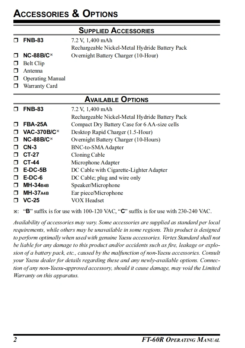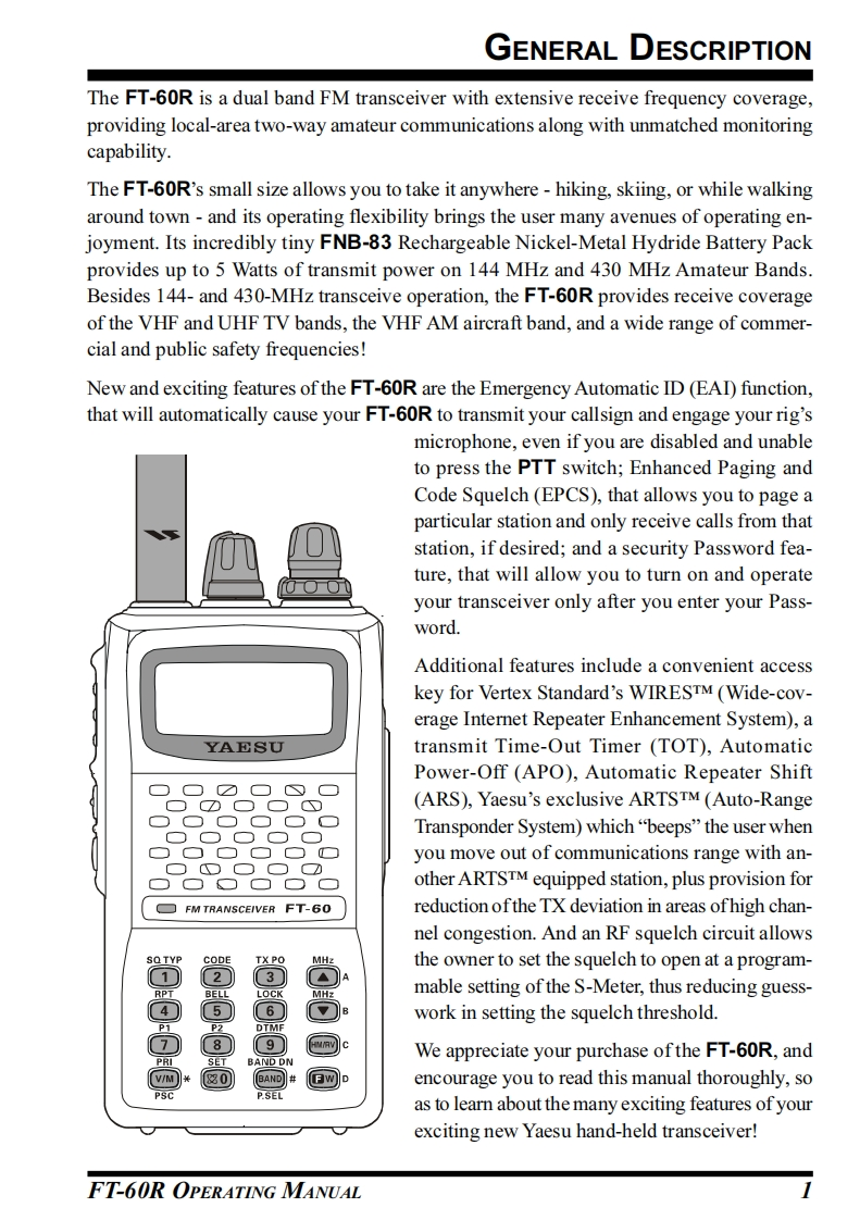 YAESUVHF/UHFDUAL BAND TRANSCEIVERFT-60ROPERATING MANUALm6888H口■正YAESUVERTEX STANDARD CO.,LTD.4-8-8 Nakameguro,Meguro-Ku,Tokyo 153-8644,JapanVERTEX STANDARDUS HeadquartersFM TRANSCEIVERET-6010900 Walker Street,Cypress,CA 90630,U.S.A.YAESU EUROPE B.V.P.O.Box 75525,1118 ZN Schiphol,The NetherlandsYAESU UK LTD.Unit 12,Sun Valley Business Park,Winnall CloseWinchester,Hampshire,SO23 OLB,U.K.VERTEX STANDARD HK LTDEUnit 5,20/F.,Seaview Centre,139-141 Hoi Bun Road,Kwun Tong,Kowloon,Hong Kong