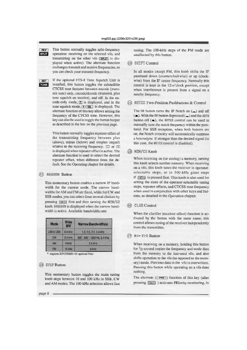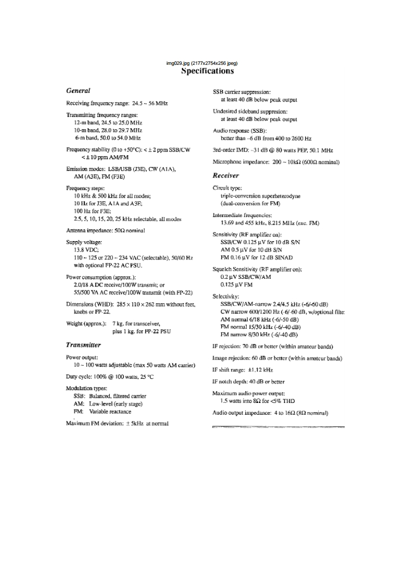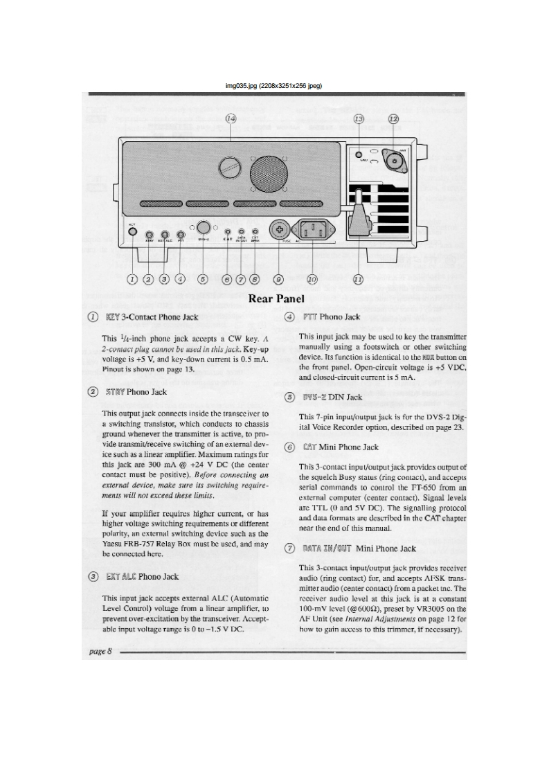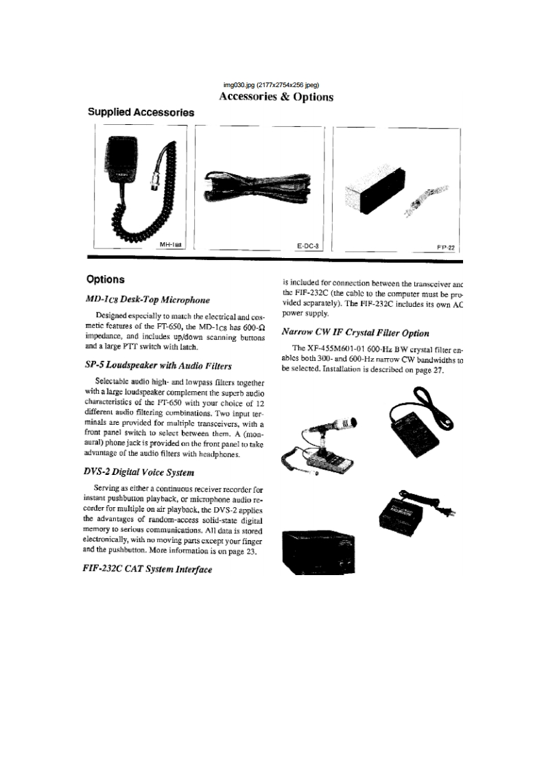 img027.jpg(2177x2754x256 jpegContentsGeneral InformationGeneral Coverage Reception公Specifications2Dealing with InterferenceGeneralAttenuation RF Amplifiers16TransmitterIF Bandwidth and Shift AdjustmentReceiverIF Notch Filter (not used in FM mode)17Accessories OptionsTransmitting17MD-1C8 Desk-Top MicrophoneSSB Transmission17SP-5 Loudspeaker with Audio FilterswCW Transmission18DVS-2 Digital Voice Systern3AM Transmission18FIF-232C CAT System InterfaceFM Transmission18Narrow CW IF Crystal Filter OptionClarifier (Receiver Offset Tuning)19Supplied Accessories3Using Yro B19Controls Connectors4Split Frequeney Operation19Front Panel ControlsMemory Storage20Rear Panel8Memory Recall Operation20Memory Scanning21General Setup Power Connections10Memory Scan Skip21Preliminary Inspection10Clearing/lliding Memories21Power Connection10Mode-Specific Scanning21ACOperation with the FP-2210Programmable Scanning Limits(PMS)22DC Power10Priority Monltoring22Transeeiver LocationTone Squelch Operation24Grounding111200-Baud (FM)Packet25Adjusting the Front Feet11Antenna Considerations12Installing Internal Accessories26Interconnection of Accessories12FIS-8 CTCSS Tone Squeleh Unit26Memory Backup12XF-455M601-01 600-Hz Narrow CW Filter27Internal Adjustments:FP.22 AC Power Supply28Beeper/Sidetone Volume CW Ilang Time12Connecting External Accessories13Cat System Computer Control29Connector Pinouts14CAT Commands30Coding Examples31Operating Tutorial15Sending Commands31VFO Scanning6