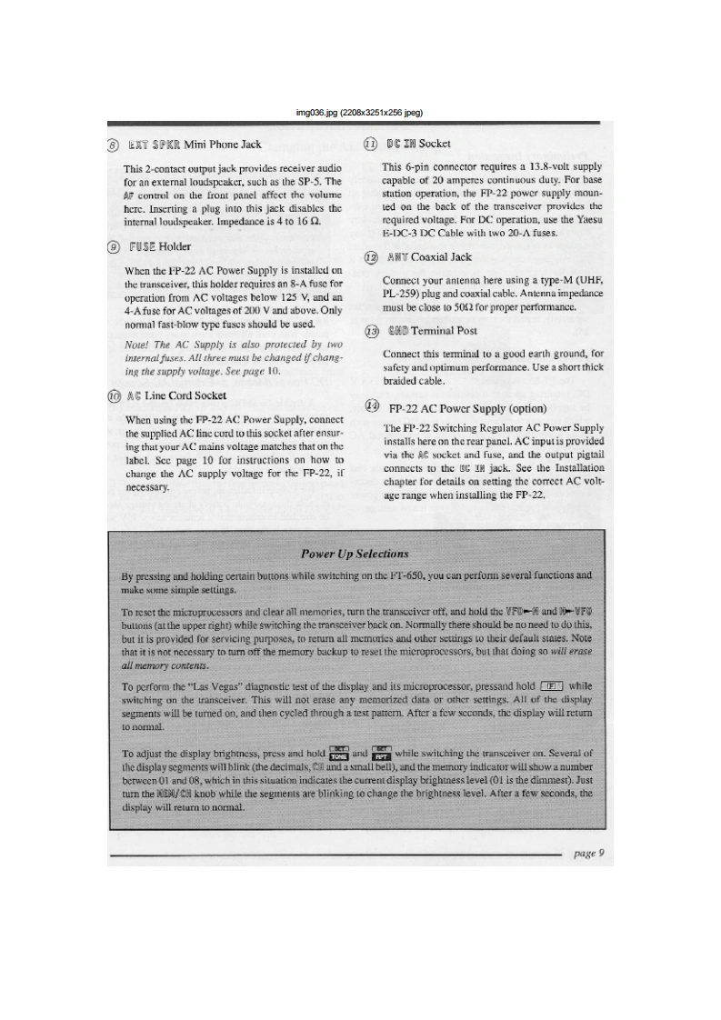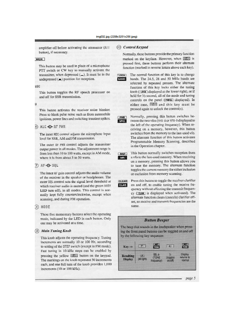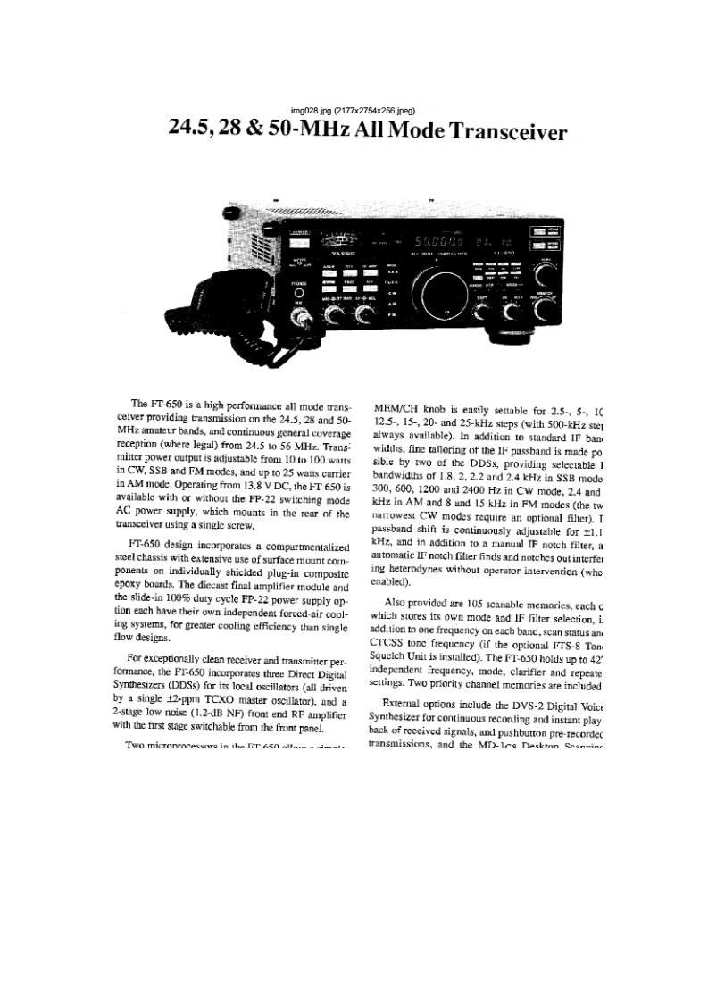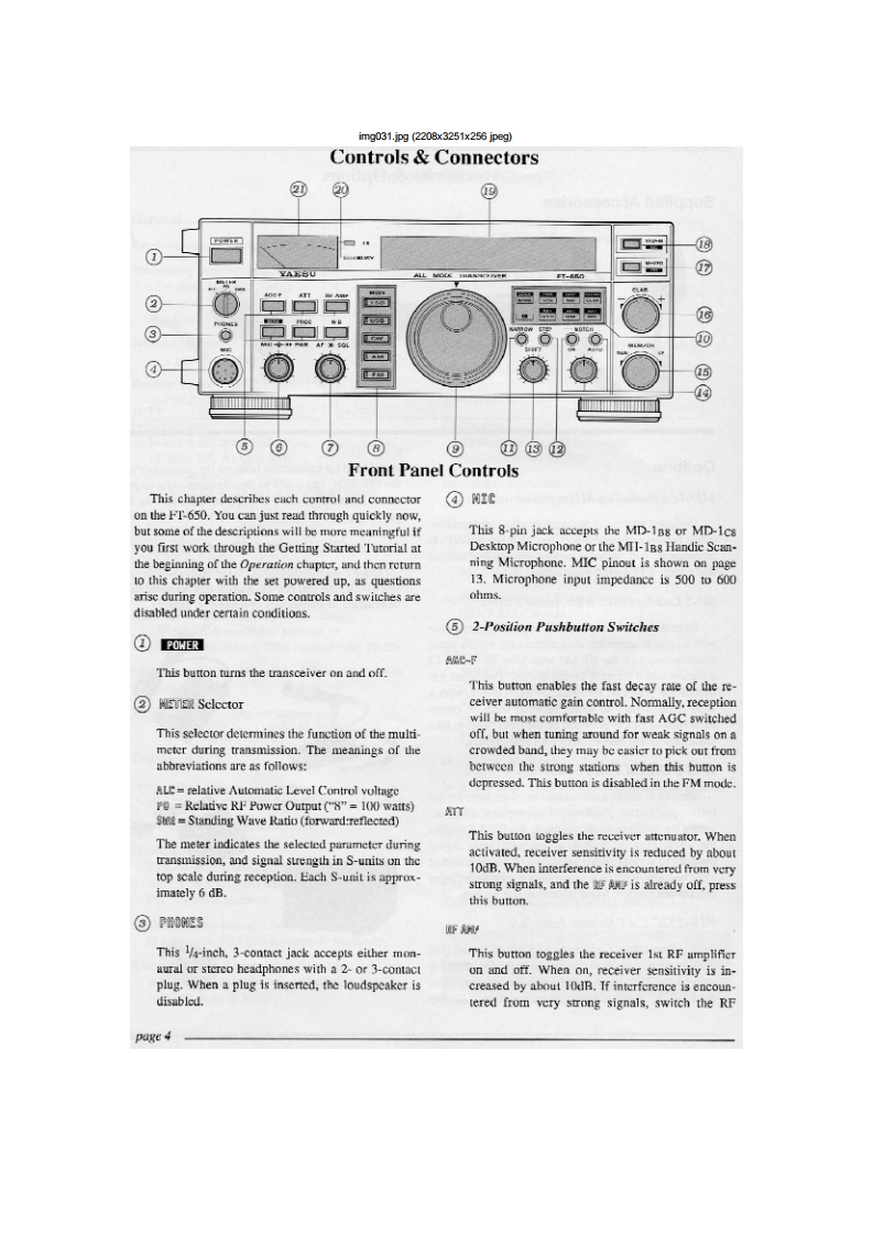 img027.jpg(2177x2754x256 jpegContentsGeneral InformationGeneral Coverage Reception公Specifications2Dealing with InterferenceGeneralAttenuation RF Amplifiers16TransmitterIF Bandwidth and Shift AdjustmentReceiverIF Notch Filter (not used in FM mode)17Accessories OptionsTransmitting17MD-1C8 Desk-Top MicrophoneSSB Transmission17SP-5 Loudspeaker with Audio FilterswCW Transmission18DVS-2 Digital Voice Systern3AM Transmission18FIF-232C CAT System InterfaceFM Transmission18Narrow CW IF Crystal Filter OptionClarifier (Receiver Offset Tuning)19Supplied Accessories3Using Yro B19Controls Connectors4Split Frequeney Operation19Front Panel ControlsMemory Storage20Rear Panel8Memory Recall Operation20Memory Scanning21General Setup Power Connections10Memory Scan Skip21Preliminary Inspection10Clearing/lliding Memories21Power Connection10Mode-Specific Scanning21ACOperation with the FP-2210Programmable Scanning Limits(PMS)22DC Power10Priority Monltoring22Transeeiver LocationTone Squelch Operation24Grounding111200-Baud (FM)Packet25Adjusting the Front Feet11Antenna Considerations12Installing Internal Accessories26Interconnection of Accessories12FIS-8 CTCSS Tone Squeleh Unit26Memory Backup12XF-455M601-01 600-Hz Narrow CW Filter27Internal Adjustments:FP.22 AC Power Supply28Beeper/Sidetone Volume CW Ilang Time12Connecting External Accessories13Cat System Computer Control29Connector Pinouts14CAT Commands30Coding Examples31Operating Tutorial15Sending Commands31VFO Scanning6