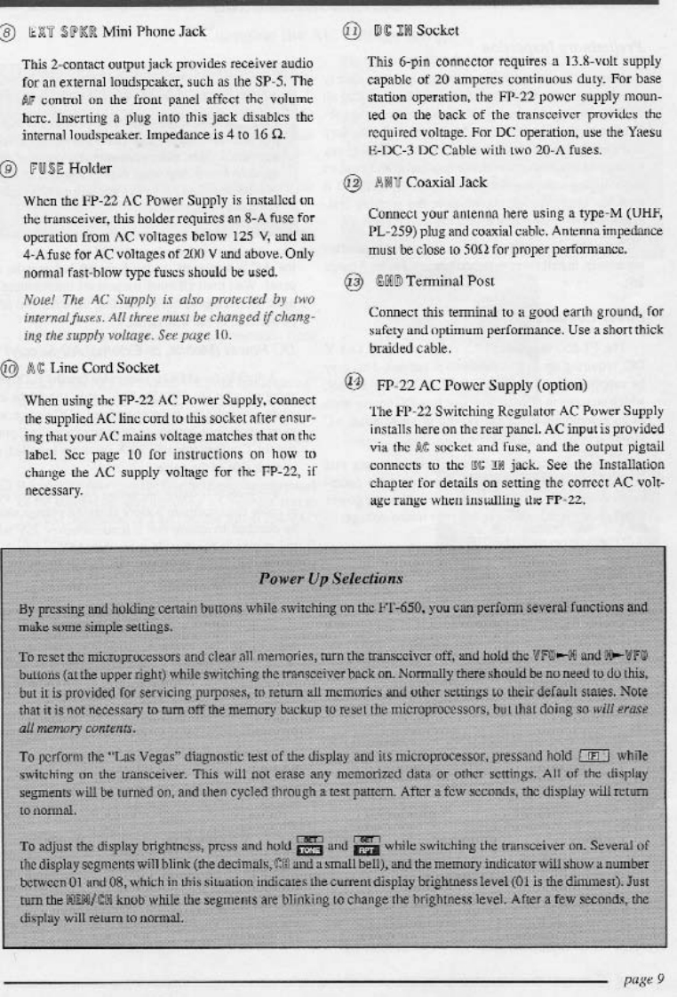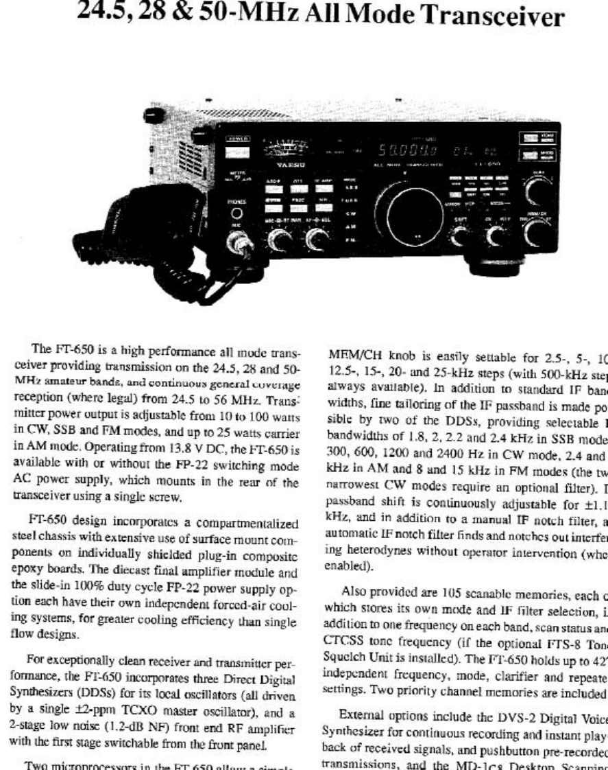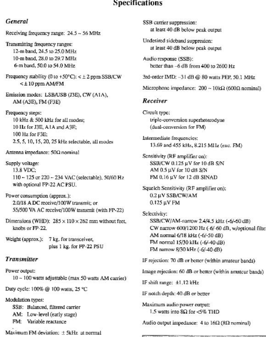 ContentsGeneral Information1General Coverage Reception16Specifications2Dealing with Interference16General2Attenuation RF Amplifiers16Transmitter2IF Bandwidth and Shift Adjustment17Receiver2IF Notch Filter (not used in FM mode)17Accessories Options3Transmitting17MD-IC8 Desk-Top Microphone3SSB Transmission17SP-5 Loudspeaker with Audio Filters3CW Transmission18DVS-2 Digital Voice Systern3AM Transmission18FIF-232C CAT System Interface3FM Transmission18Narrow CW IF Crystal Filter Option3Clarifier (Receiver Offset Tuning)19Supplied Accessories3Using Yfo B19Controls Connectors4Split Frequency Operation19Front Panel ControlsgMemory Storage20Rear Panel8Memory Recall Operation0Memory Scanning21General Setup Power Connections10Memory Scan Skip21Preliminary Inspection10Clearing/Iliding MemoriesPower Connection10Mode-Specific Scanning42AC Operation with the FP-2210Programmable Scanning Limits(PMS)22DC Power10Priority Monitoring22Transceiver Location11Tone Squelch Operation24Grounding111200-Baud (FM)Packet25Adjusting the Front Feet11Antenna Considerations12Installing Internal Accessories26Interconnection of Accessories12FIS-8 CTCSS Tone Squelch Unit26Memory Backup12XF-455M601-01 600-Hz Narrow CW Filter27Internal Adjustmcnts:FP.22 AC Power Supply28Beeper/Sidetone Volume CW IIang Time12Connecting External Accessories13Cat System Computer Control29Connector Pinouts14CAT Commands30Coding Examples31Operating Tutorial15Sending Commands31VFO Scanning15