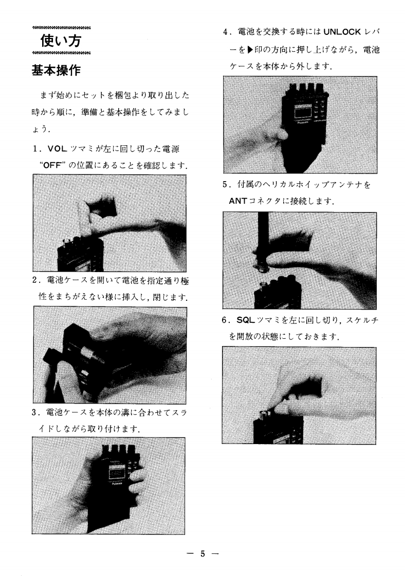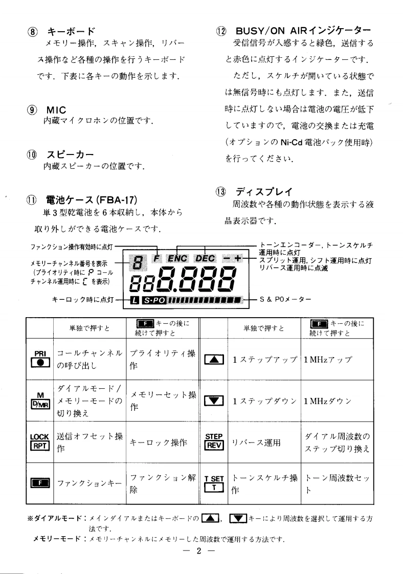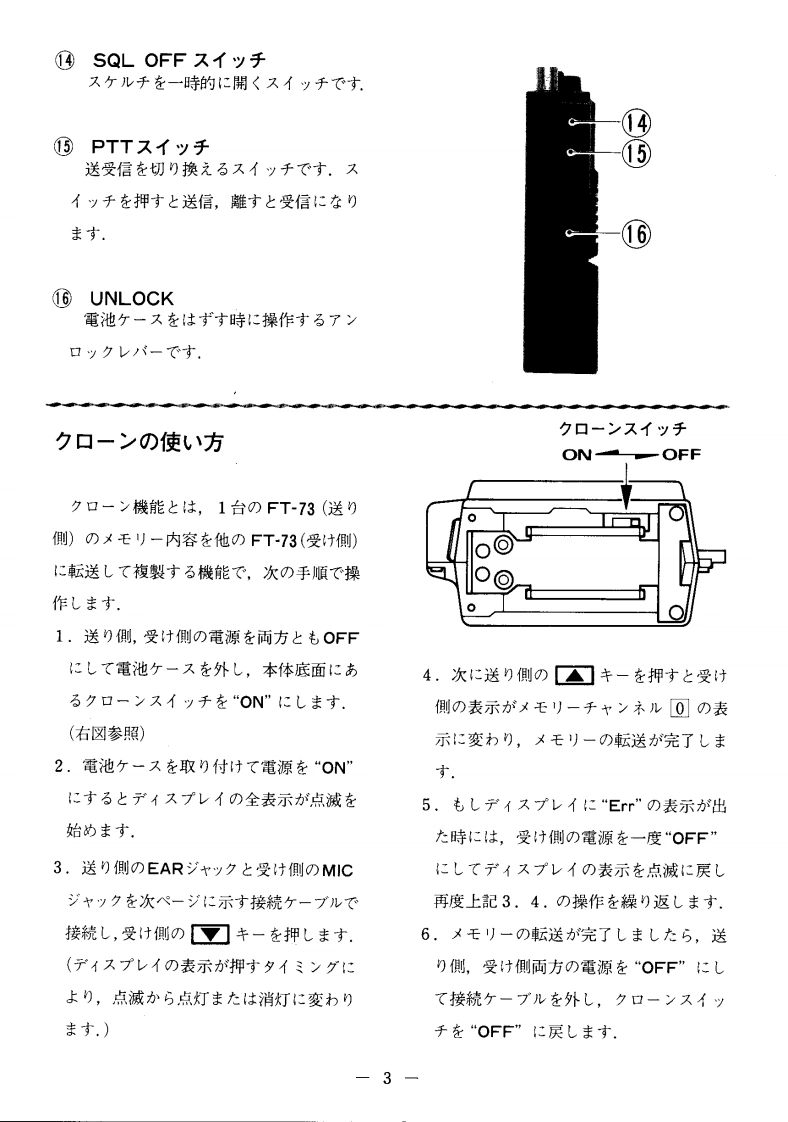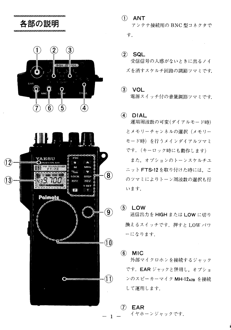 FM HANDIE TRANSCEIVERFT-73层是!:HITOP取极說明書(02)704-9104(0502)145-4380YAESUPalmateUHF目次各部)說明C使用)前34TCの:YAESU FT-73卜ラy-/バ-才ブョ4左书買L1上(1大龙老丰T誠莎)护匕使方5C小求寸基本操作5本製品这骸儿品質管理)老之二生座苍九各種①機能匕操作文粉)去李力,万一運搬中)事故套二上门1.周波数七y卜破損去大体巴不審存箇所)丰儿大与,2.メ毛刂一口之卜口-儿7粉早目已方買」上)大龙意主L大販壳店3.又丰ャ门卜口一儿9大体最寄))当社當業所片一上又仁粉問)合4.寸ラ亻才刂デ9力世〈龙这5.送信才フ七y卜機能10正L操作方法在已理解大龙意,本機)6.卜一又ヶ儿于運用11性能左十分二凳揮下老石上方已使用)大龙〈7.乇)他)機能12前二,己の取极脱明普左上〈书読↓大尤老,故障加尔?七思)前仁12趣味)王樣上力九了マ于ュ了無線左大↓)定格13把扫粢L《龙这.了マ于ュ了局免許申請書類)書老方14製品)改良)大的二,取极說明書)写真套之一部製品上異李石二上方)丰才.击与心的已了承〈龙吉.