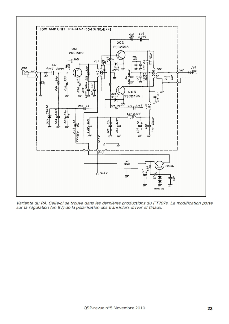 QRPSchema du PA 10W des FT-7,77s et 707sCes transceivers sont tres prises des amateurssheet.Mais Heureusement pour nous ils ont lede QRP et a juste titre Mais le schema estcelebre 2SC1969 comme correspondance.Cesindisponible sur Internet...Le voici a la pagetransistors sont indestructibles dans un usagesuivante.II existe en deux versions:la secondenormal mais des OM poussent le reglageest celle d'une version ulterieure du FT-707s.d'ALC a fond pour sortir le maximum deCe PA est particulierement lineaire et de bonnepuissance (-18W)et le refroidissement n'estqualite.C'est une reussite et c'est pour cettepas suffisant,surtout dans I'habitacle d'uneraison qu'il s'est retrouve dans plusieursvoiture en ete.Et comme I'ALC sert aussi a lagenerations de TX.protection du PA,on se retrouve avec desll faut signaler que les transistors du PA sonttransistors fondus.…quasiment introuvables,de meme que leur dataI0W AMP UNIT PB-1443-3540(NO.4J..)002Q012SC23952sC1589lpaet3corT02了01De-INaoiy scexpOUT宁0032SC2395r03c00☑s8水而PA Yaesu 10W.Le schema le plus repandu.Se trouve dans les FT-7,77s et 707s22QSP-revue n5 Novembre 2010