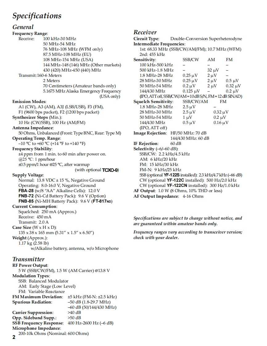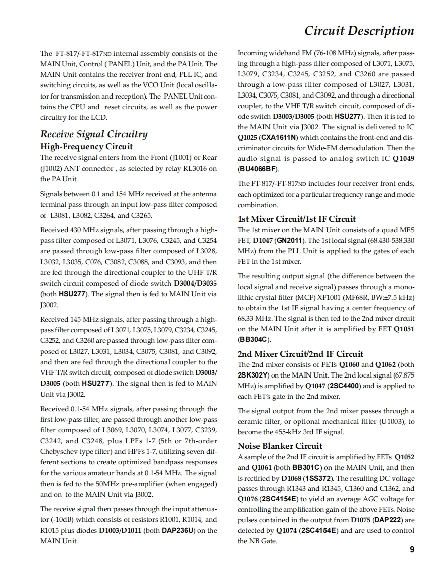 HF/VHF /UHFVERTEX STANDARD CO.,LTD.All Mode Transceiver4-8-8 Nakameguro,Meguo-Ku,Tokyo 153-8644,JapanVERTEX STANDARD10900 Waiker Street,Cypress,CA30,U.S.AFT-817/FT-817NDYAESU EUROPE B.V.P.O.Box 75525,1118 ZN Schiphol,The NetherlandsYAESU UK LTD.Technical SupplementUnit 12,Sun Valley Business Park,Wimall CloseWinchester,Hampshire,S023 0LB,U.K.VERTEX STANDARD HK LTD.Unit 5,20/F,Seaview Centre,139-141 Hoi Bun Road,2005 VERTEX STANDARD CO.,LTD(E137790B)Kwun Tong,Kowloon,Hong KongIntroductionThis manual provides technical information necessary forservicing the Yaesu FT-817/FT-817ND HF V/UHF-BandsTransceiver.It does not include information on installa-tion and operation,which are described in the FT-817/FT-817ND Operating Manual provided with the transceiv-er,or on accessories which are described in their manuals.The FT-817/FT-817ND is carefully designed to allow theknowledgeable operator to make nearly all adjustmentsrequired for various station conditions,modes and oper-ator preferences simply from the controls on the panels,without opening the case of the transceiver.The FT-817/nents(trimmers,coils,electrolytic capacitors,packagedFT-817ND Operating Manual describes these adjustments,ICs,etc.),or lead components only.plus certain intemal settings.While we believe the technical information in this manu-Servicing this equipment requires expertise in handlingal is correct,VERTEX STANDARD assumes no liabilitysurface mount chip components.Attempts by unquali-for damage that may occur as a result of typographical orfied persons to service this equipment may result in per-other errors that may be present.Your cooperation inmanent damage not covered by warranty.For the majorpointing out any inconsistencies in the technical informa-circuit boards,each side of the board is identified by thetion would be appreciated.VERTEX STANDARD reservestype of the majority of components installed on that side.the right to make changes in this transceiver and the align-In most cases one side has only chip components,and thement procedures,in the interest of technological improve-other has either a mixture of both chip and lead compo-ment,without notification of owners.ContentsSpecification2Board Unit(Schematics,Layouts Parts)Exploded View Miscellaneous Parts .....3MAIN Unit..25Block Diagram....5PLLInterconnection Diagram..........REF Unit..75PA /FINAL Unit....Circuit Description.…4.9…81PANEL Unit....99Alignment….15TCXO-9 Unit(Option).110