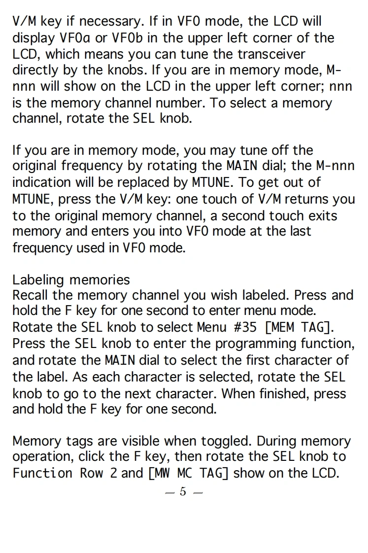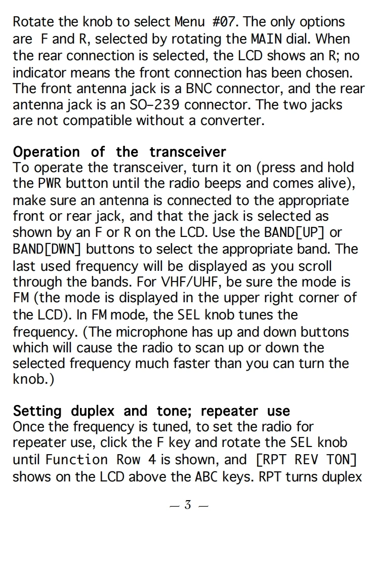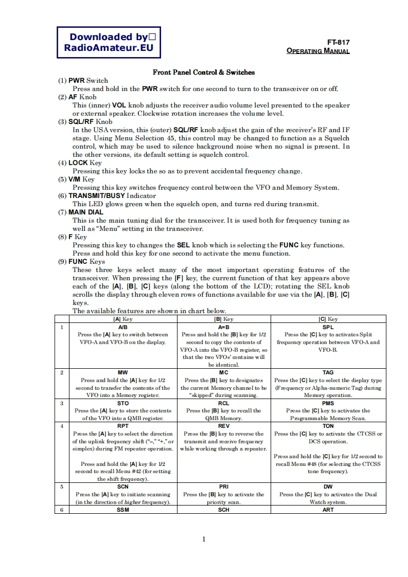 FT-817 Cheat Sheet(There are separate instructions for connecting thetransceiver to power and turning it on."Click"meansto press a button and to release it immediately;"pressand hold"a button means to press it in and hold it for asecond.See the attached photo.)The front panelThe power switch is the button on the far right of thefront panel,upper corner,and it is labeled PWR.To theleft of the power switch is the LOCK key.Pressing thiskey locks the controls,preventing inadvertentfrequency changes.Continuing to the left,next is theV/M key;this key toggles between VF0 and memorymodes.The transmit/busy indicator is next.The lightis green when squelch opens and red whentransmitting.Finally,the last button before the LCD isthe F key.Clicking the F key displays the functionsavailable via the A,B,and C keys.(These keys arebelow the LCD screen.)The button to the left of the LCDis the HOME key;clicking it recalls your "home"frequency.The knob to the left of the LCD is the SEL knob.Depending on the mode the radio is in,turning the SELknob tunes a frequency or selects a memory channel orfunction for the ABC keys.The large dial to the right ofthe LCD is the MAIN dial.This is the main tuning dialfor the radio.(Generally,in VF0 mode the SEL knobDownloaded byl□RadioAmateur.EU
