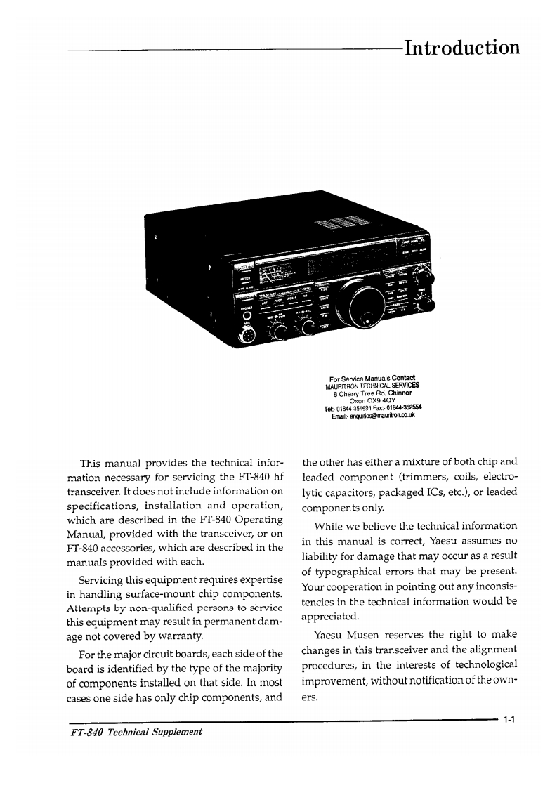 FT-840For Service Manuals ContactMAURITRON TECHNICAL SERVICESChinnor0n0X340yTt-01B44351634Fax001844-352554Emai:-enquines mauntron.co.ukDownloaded by▣Amateur Radio Directorywww.hamdirectory.infoYAESU MUSEN CO.,LTD.C.P.O.Box 1500,Tokyo,JapanYAESU U.S.A.17210 Edwards Rd.,Cerritos,CA90701,U.S.A.YAESU EUROPE B.V.Snipweg 3,1118AA Schipol,The Netherlands