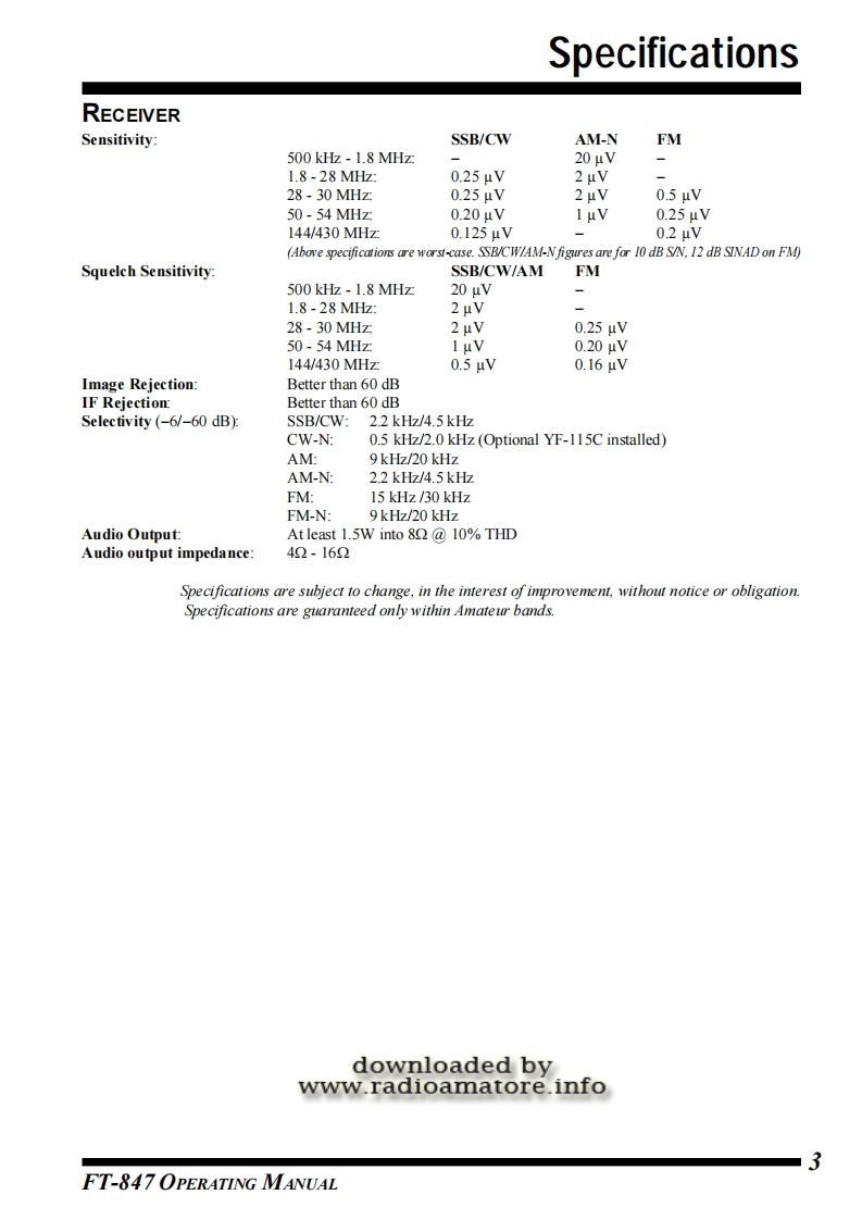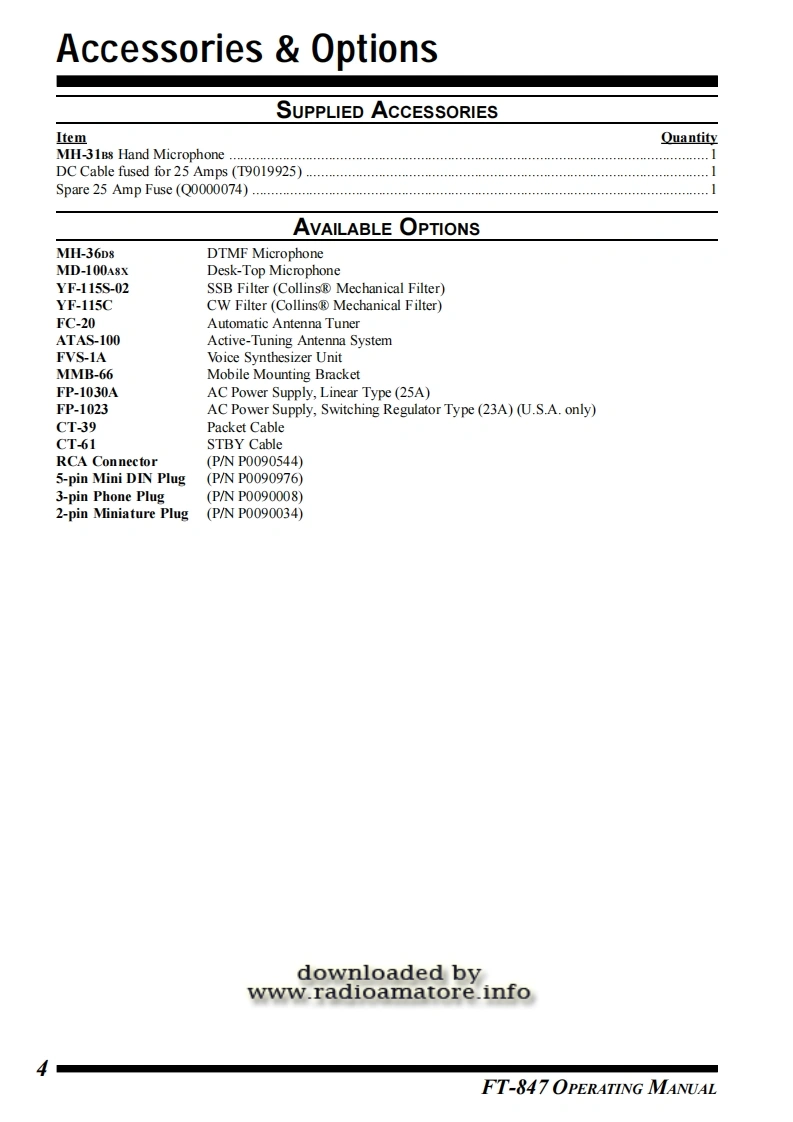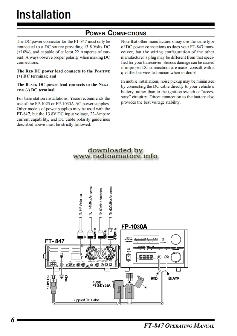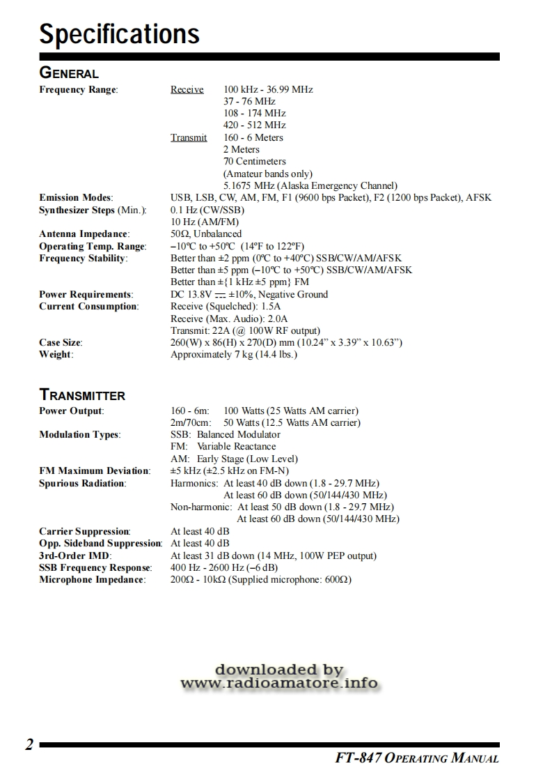 FT-847OPERATINGMANUALdownloaded bywww.radioamatore.infoYAESU MUSEN CO.,LTD.4-8-8 Nakameguro,Meguro-Ku,Tokyo 153-8644,JapanYAESU U.S.A.17210 Edwards Rd.,Cerritos,CA 90703,U.S.A.YAESU EUROPE B.V.P.O.Box 75525 1118 ZN.Schiphol.The NetherlandsYAESU UK LTD.Unit 12,Sun Valley Business Park,Winnall CloseWinchester.Hampshire.SO23 0LB.U.K.YAESU GERMANY GmbHAm Kronberger Hang 2,D-65824 Schwalbach,GermanyYAESU HK LTD11th Floor Tsim Sha Tsui Centre,66 Mody Rd.Tsim Sha Tsui East,Kowoon,Hong Kong