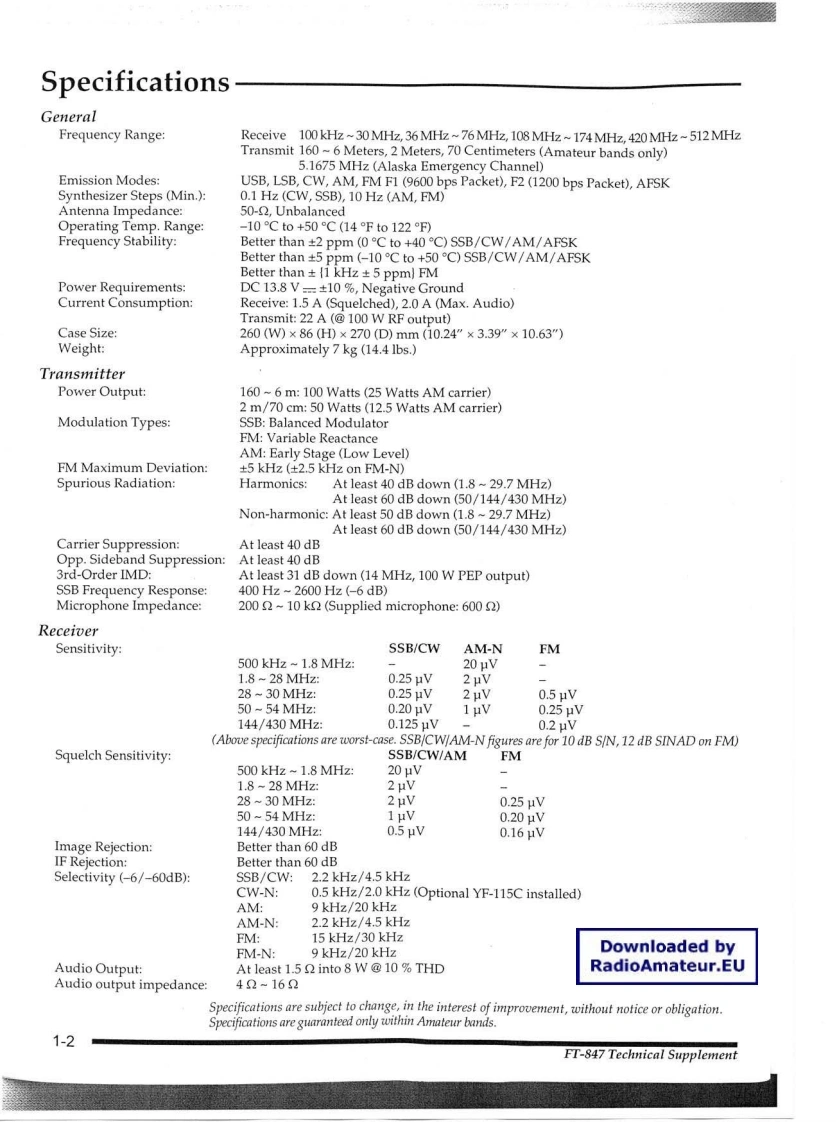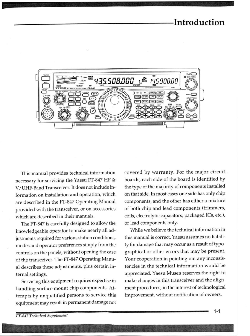 YAESUFT-847HF&V/UHF Band TransceiverTechnical SupplementVERTEX STANDARD CO.,LTD.4-8-8 Nakameguro,Meguro-Ku,Tokyo 153-8644.JapanVERTEX STANDARDUS Headquarters17210 Edwards Rd.,Cerritos,CA 90703.U.S.A.International Division8350 N.W.52nd Terrace,Suite 201,Miami,FL 33166,U.S.A.YAESU EUROPE B.V.-=435.508009_品4590800P.O.Box 75525,1118 ZN Schiphol,The NetherlandsYAESU UK LTD.YAESU GERMANY GmbHAm Kronberger Hang 2,D-65824 Schwalbach,GermanyVERTEX STANDARD HK LTD.Unit 5,20/F.,Seaview Centre.139-141 Hoi Bun Road,Kwun Tong.Kowloon,Hong KongDownloaded byRadioAmateur.EU