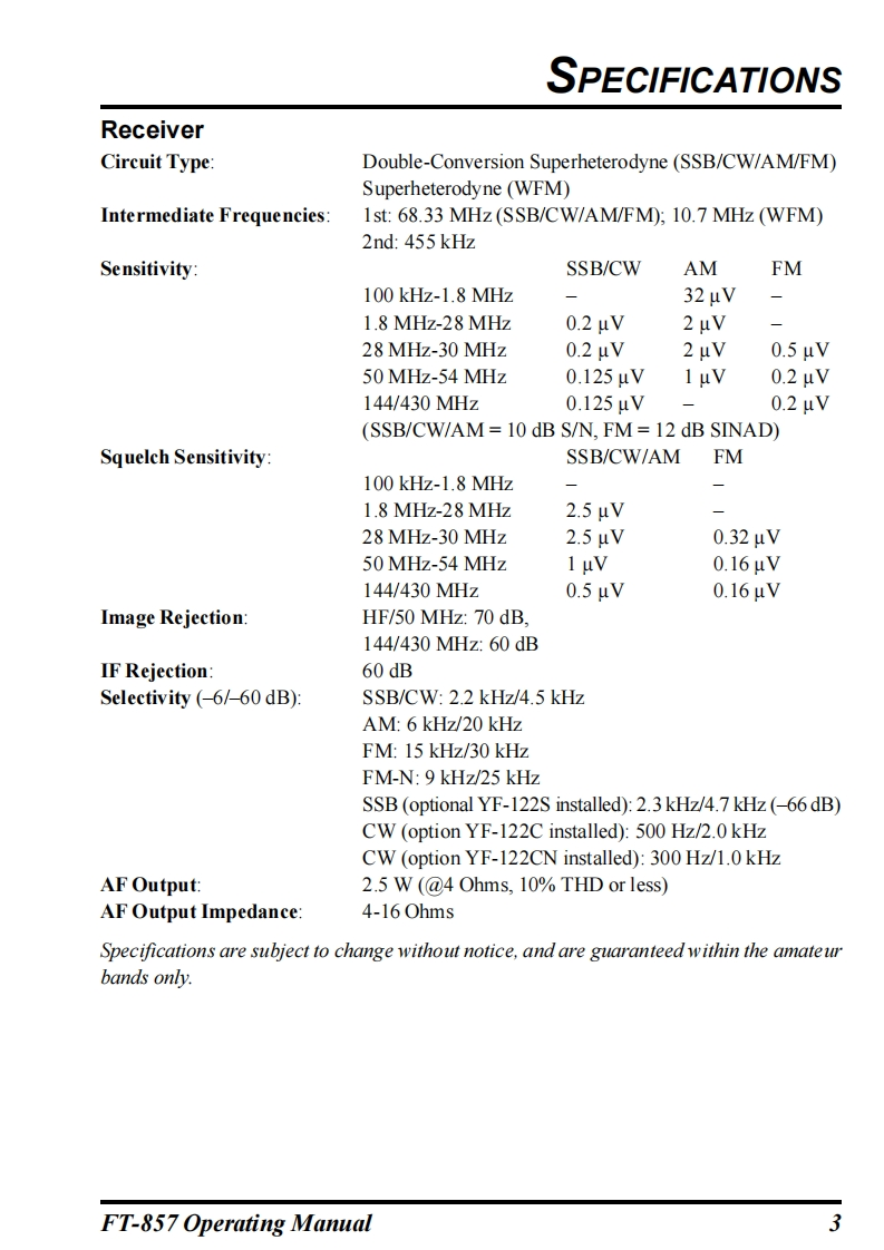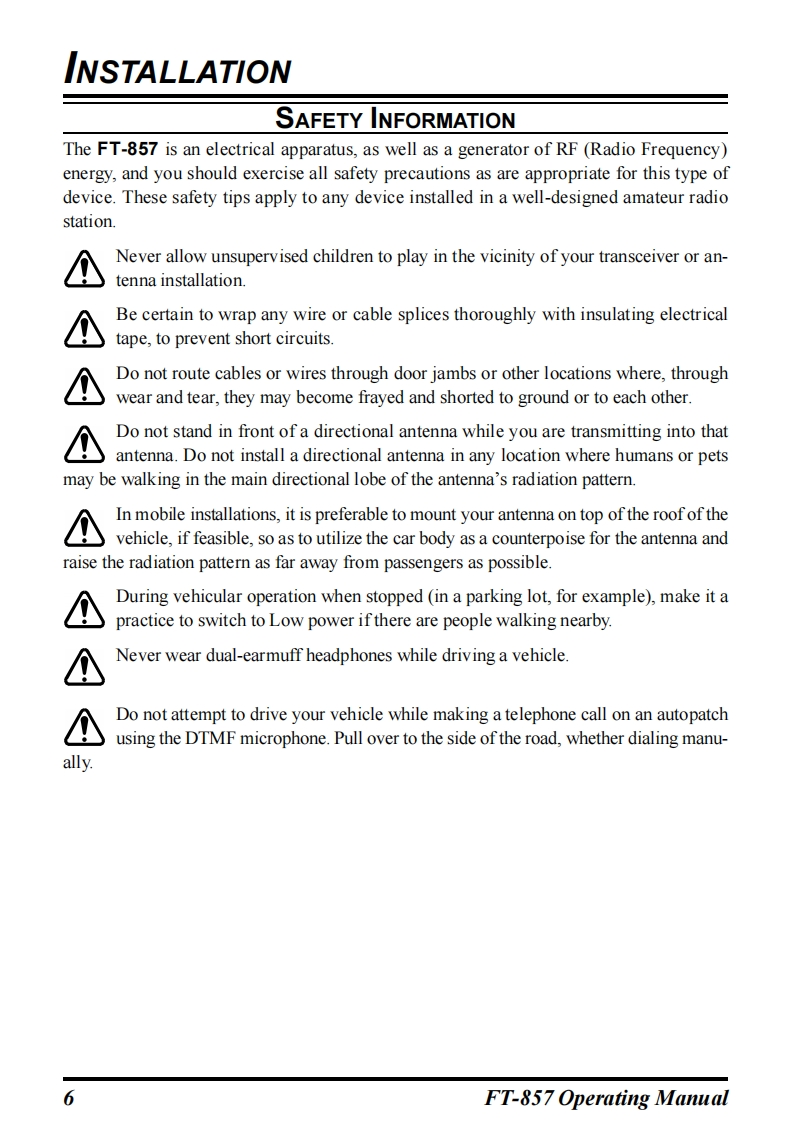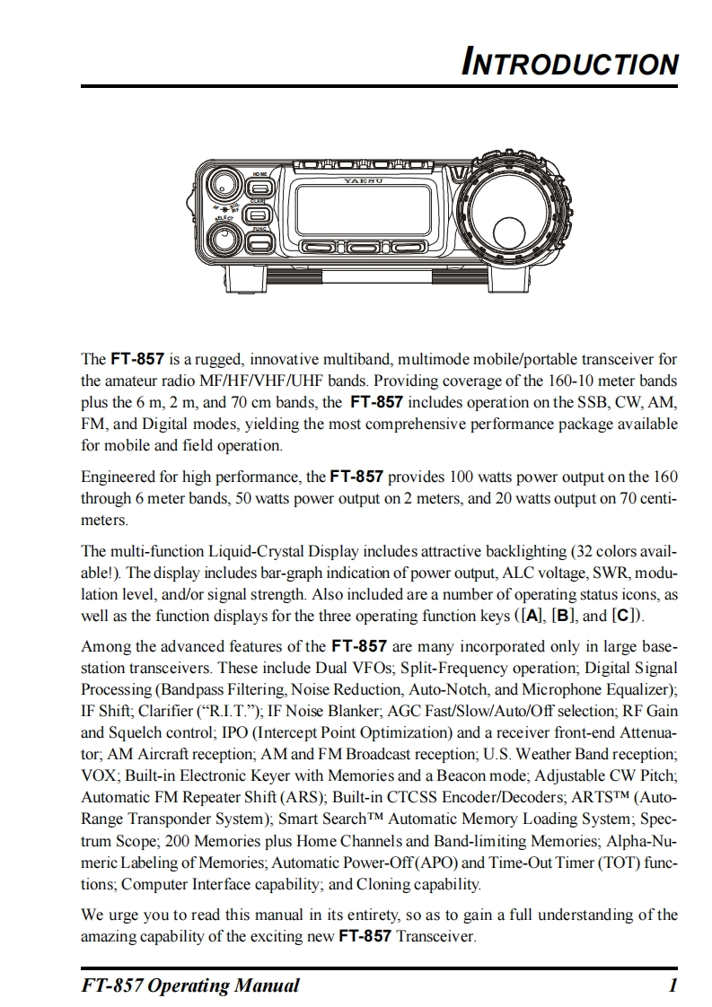 YAESUFT-857HF/VHF/UHFULTRA-COMPACT TRANSCEIVEROPERATING MANUALVERTEX STANDARD CO.,LTD.4-8-8 Nakameguro,Meguro-Ku,Tokyo 153-8644,JapanVERTEX STANDARDUS Headquarters10900 Walker Street,Cypress,CA 90630,U.S.AInternational Division8350 N.W.52nd Terrace,Suite 201,Miami,FL 33166,U.S.A.YAESU EUROPE B.V.P.O.Box 75525,1118 ZN Schiphol,The NetherlandsYAESU UK LTD.Unit 12,Sun Valley Business Park,Winnall CloseWinchester,Hampshire,SO23 0LB,U.K.VERTEX STANDARD HK LTD.Unit 5,20/F.,Seaview Centre,139-141 Hoi Bun Road,Kwun Tong,Kowloon,Hong Kong