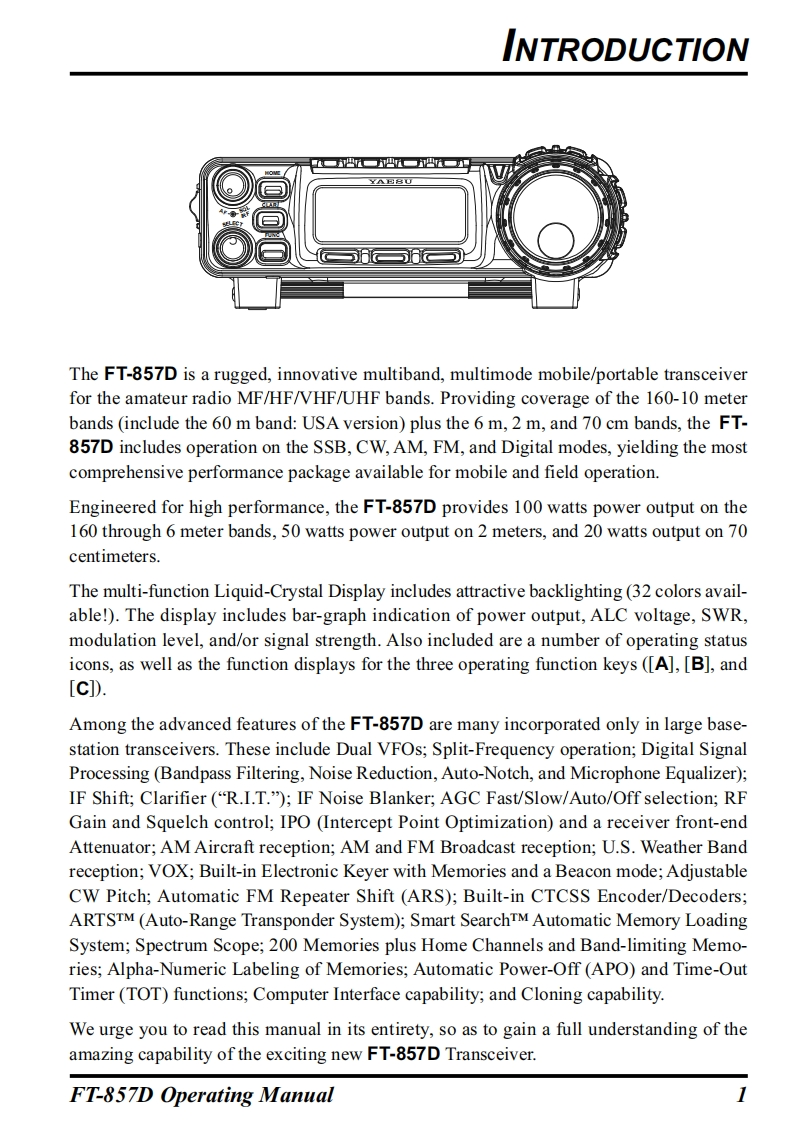 YAESUTheradioFT-857DHF/VHF/UHFULTRA-COMPACT TRANSCEIVEROPERATING MANUAL0000YAESU MUSEN CO.,LTD.Tennozu Parkside Building2-5-8 Higashi-Shinagawa,Shinagawa-ku,Tokyo 140-0002 JapanYAESU USA6125 Phyllis Drive,Cypress,CA 90630,U.S.A.YAESU UKUnit 12,Sun Valley Business Park,Winnall CloseWinchester,Hampshire,SO23 0LB,U.K.