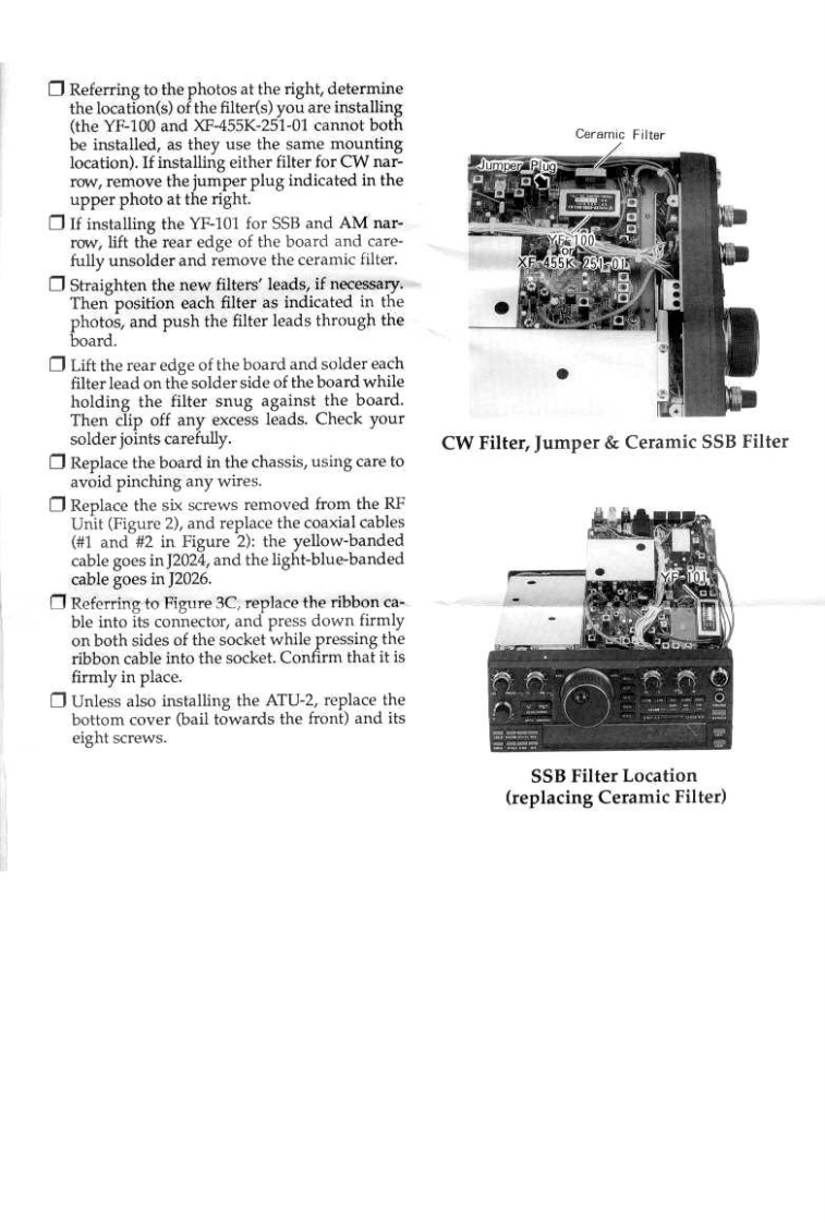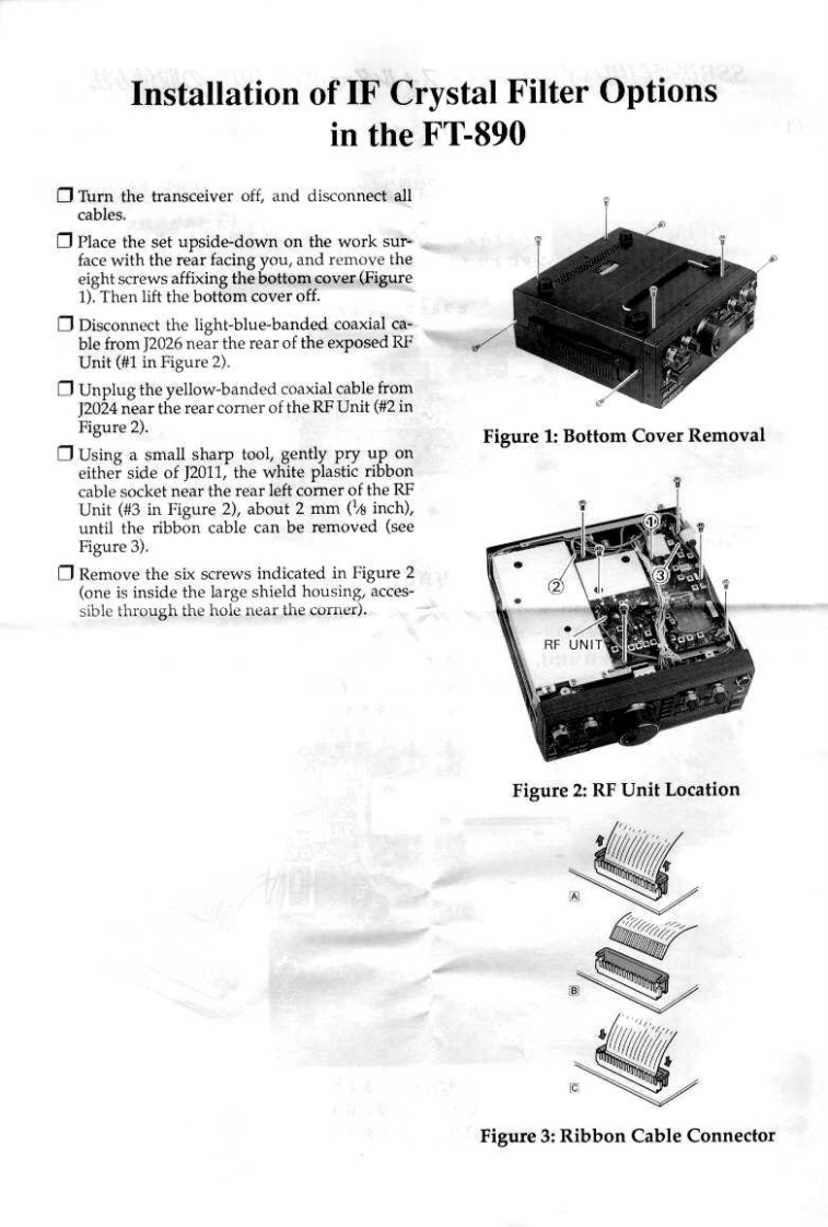 Crystal FilterYF-100/YF-101XF-455K-251-01The 500-Hz YF-100 or 250-Hz XF-455K-251-01 crystal filter may be installedin the FT-890 for CW narrow reception,and the YF-101 2.6-kHz crystal filtermay be installed for improved SSB and AM narrow receiver selectivity.The pro-cedure involves removing the bottom cover,and requires a low-wattage solder-ing iron.Proper performance with the crystal filters dependson proper install-ation.If you are unsure of the procedures after reading the following,fell freeto ask your Yaesu dealer for help.