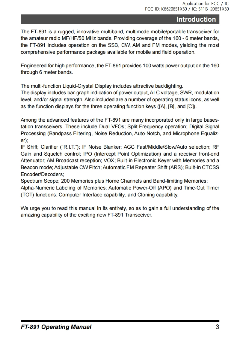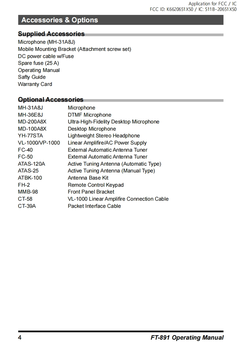 FT-891_操作说明书手册找手册网24天前发布关注私信3.66MB36页039FT-891_操作说明书手册此内容为付费资源,请付费后查看¥19¥21黄金会员免费钻石会员免费登录购买付费资源 第1页 / 共36页 第2页 / 共36页 第3页 / 共36页 第4页 / 共36页 第5页 / 共36页 第6页 / 共36页 第7页 / 共36页 第8页 / 共36页 第9页 / 共36页 第10页 / 共36页 试读已结束,还剩26页,您可下载完整版后进行离线阅读 THE END八重洲 文本预览 Application for FCC ICFCC ID:K6620651X50/1C:511B-20651X50YAESUThe radioFT-891Operating ManualHF/50 MHz TRANSCEIVER凸7o网 查看更多 收起部分 喜欢就支持一下吧收藏