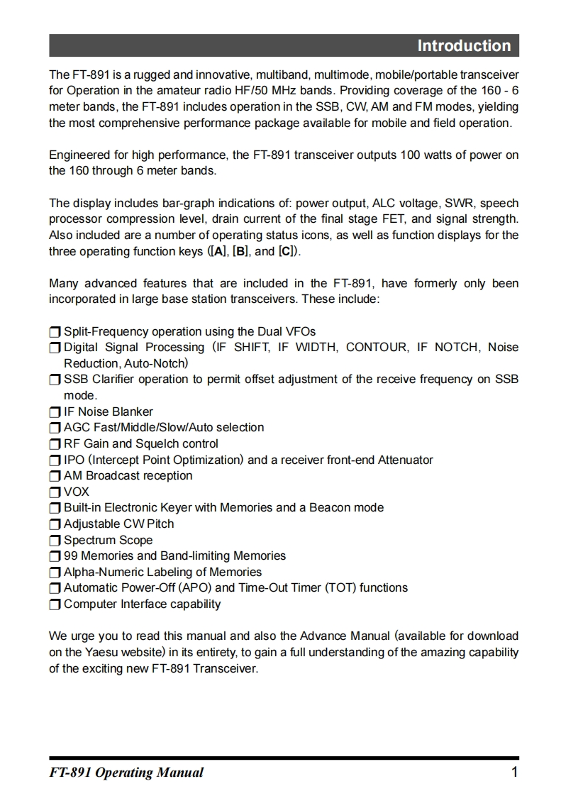 FT-891_操作说明书手册_ENG_EH065H201找手册网24天前发布关注私信19.71MB62页042FT-891_操作说明书手册_ENG_EH065H201此内容为付费资源,请付费后查看¥19¥21黄金会员免费钻石会员免费登录购买付费资源 第1页 / 共62页 第2页 / 共62页 第3页 / 共62页 第4页 / 共62页 第5页 / 共62页 第6页 / 共62页 第7页 / 共62页 第8页 / 共62页 第9页 / 共62页 第10页 / 共62页 试读已结束,还剩52页,您可下载完整版后进行离线阅读 THE END八重洲 文本预览 YA西SUThe radioFT-891Operating ManualHF/50MHz TRANSCEIVER盟AUSBGUsB21.日☑0.0@0F可网AM 查看更多 收起部分 喜欢就支持一下吧收藏