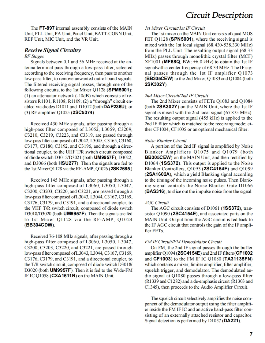 YAESUVERTEX STANDARD CO.,LTD.4-8-8 Nakameguo,Meguro-Ku,Tokyo 153-8644,JapanHF/VHF/UHFVERTEX STANDARDUS Headquarters10900 Walker Street,Cypress,CA 90630,U.SA.ALL MODE TransceiverInternational Division8350 N.W.52nd Terrace,Suile 201,Miami,FL 33166,U.S.AYAESU EUROPE B.V.FT-897P.O.Box 75525,1118 ZN Schiphol,The NetherlandsYAESU UK LTD.Unit 12,Sun Valley Business Park,Winnal CloseTechnical SupplementWinchester,Hampshire,S023 OLB,U.K.VERTEX STANDARD HK LTD.Unit 5,20/F.,Seaview Centre,139-141 Hoi Bun Road,Kwun Tong.Kowloon,Hong Kong@2002 VERTEX STANDARD CO.,LTD.Printed in Japan..175.01Downloaded by▣Amateur Radio Directory▣www.hamdirectory.infoIntroductionThis manual provides technical information necessary for servicing the FT-897 HF/VHF/UHF ALL MODE Trans-ceiver.Servicing this equipment requires expertise in handling surface-mount chip components.Attempts by non-qualifiedpersons to service this equipment may result in permanent damage not covered by the warranty,and may be illegal insome countries.Two PCB layout diagrams are provided for each double-sided circuit board in the Transceiver.Each side of is referredto by the type of the majority of components installed on that side ("leaded"or "chip-only").In most cases one side hasonly chip components,and the other has either a mixture of both chip and leaded components(trimmers,coils,electrolyt-ic capacitors,ICs,etc.),or leaded components only.While we believe the technical information in this manual to be correct,VERTEX STANDARD assumes no liabilityfor damage that may occur as a result of typographical or other errors that may be present.Your cooperation in pointingout any inconsistencies in the technical information would be appreciated.ContentsSpecifications.…2Board Unit(Schematics,Layouts Parts)Exploded View Miscellaneous Parts......4MAIN Unit.21BlockCircuit DescriptionPANEL Unit....…73MIC Unit ........81VR Unit.......82BATT-CONN Unit.83REF Unit.........84