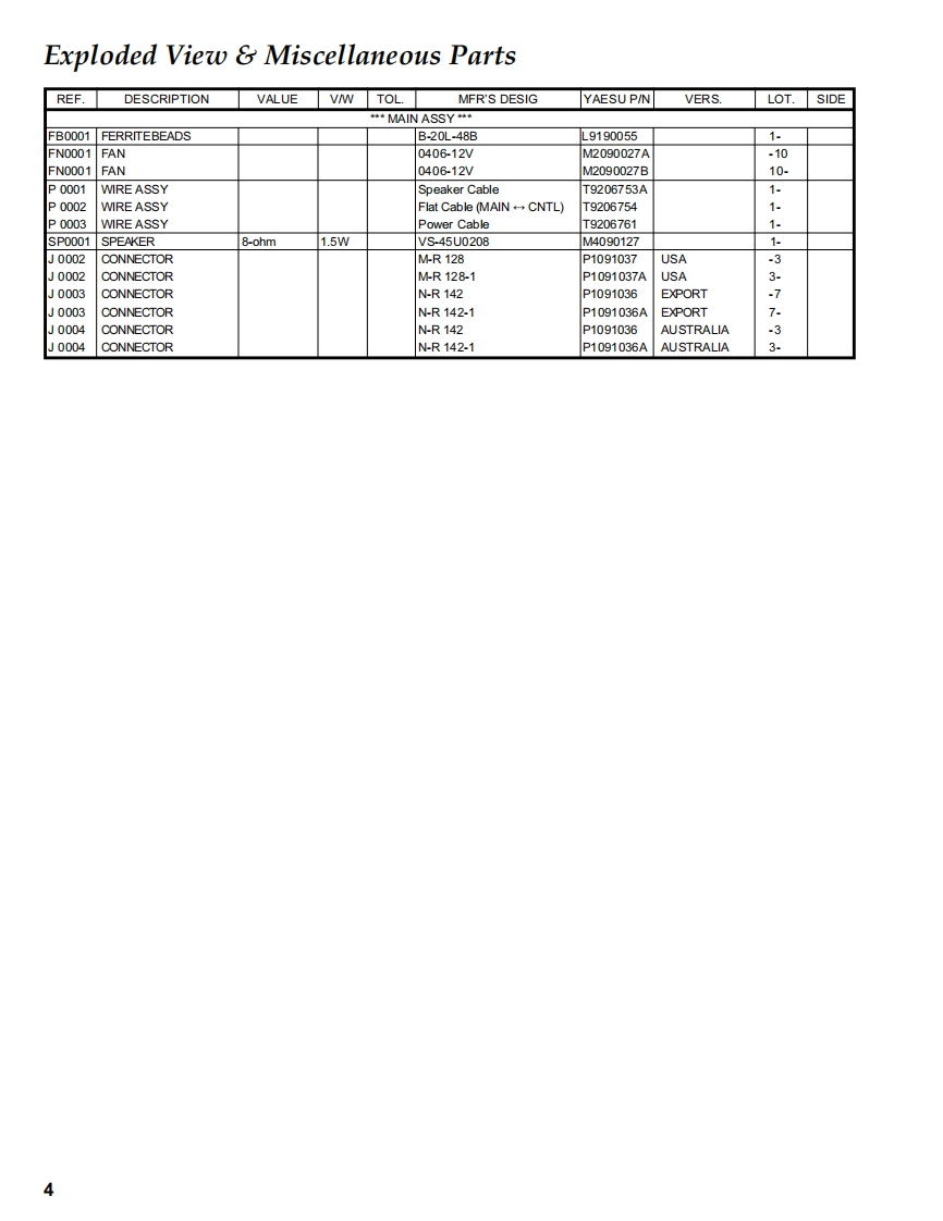 144/430MHzVERTEX STANDARD CO.,LTD.4-8-8 Nakameguro,Meguro-Ku,Tokyo 153-8644,JapanMobile TransceiverVERTEX STANDARDUS HeadquartersFT-90R10900 Walker Street,Cypress,CA 90630,U.S.AYAESU EUROPE B.V.P.O.Box 75525,1118 ZN Schiphol.The NetherlandsYAESU UK LTD.Technical SupplementUnit 12,Sun Valley Business Park,Winnall CloseWinchester,Hampshire,S023 0LB,U.K.VERTEX STANDARD HK LTD.@2004 VERTEX STANDARD CO.,LTD.Printed in Japan.Unit 5,20/F.,Seaview Centre,139-141 Hoi Bun Road,Kwun Tong,Kowloon,Hong KongIntroductionThis manual provides technical information necessaryfor servicing the Yaesu FT-90R VHF/UHF Dual Band FMMobile Transceiver.It does not include information oninstallation and operation,which are described in the FT-90R Operating Manual provided with the transceiver,orof the majority of components installed on that side.Inon accessories which are described in their manuals.most cases one side has only chip components,and theThe FT-90R is carefully designed to allow the knowl-other has either a mixture of both chip and lead compo-edgeable operator to make nearly all adjustments requirednents(trimmers,coils,electrolytic capacitors,packagedfor various station conditions,modes and operator pref-ICs,etc.),or lead components only.erences simply from the controls on the panels,withoutWhile we believe the technical information in this man-opening the case of the transceiver.The FT-90R Operat-ual is correct,Yaesu assumes no liability for damage thating Manual describes these adjustments,plus certain in-may occur as a result of typographical or other errors thatternal settings.may be present.Your cooperation in pointing out any in-Servicing this equipment requiresexpertise inhandlingconsistencies in the technical information would be ap-surface mount chip components.Attempts by unqualifiedpreciated.Yaesu Musen reserves the right to make changespersons to service this equipment may result in perma-in this transceiver and the alignment procedures,in thenent damage not covered by warranty.For the major cir-interest of technological improvement,without notifica-cuit boards,each side of the board is identified by the typetion of owners.ContentsSpecifications......2Exploded View Miscellaneous Parts....3Block Diagram .........5Circuit Description…7Alignment….10Interconnection Diagram....…14Board Unit (Schematics,Layouts Parts)MAINUnit….15CNTL Unit……29Panel Unit.VCO Unit…45Connector Unit.49