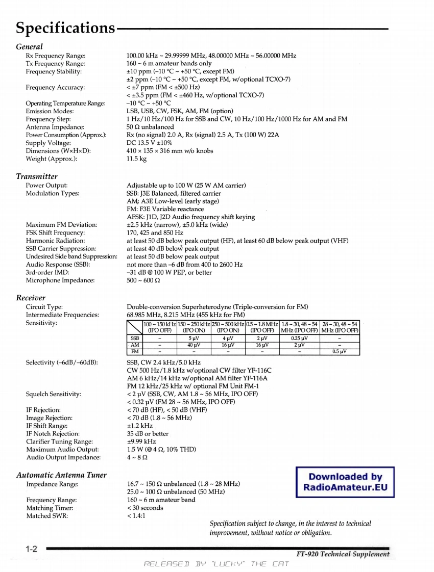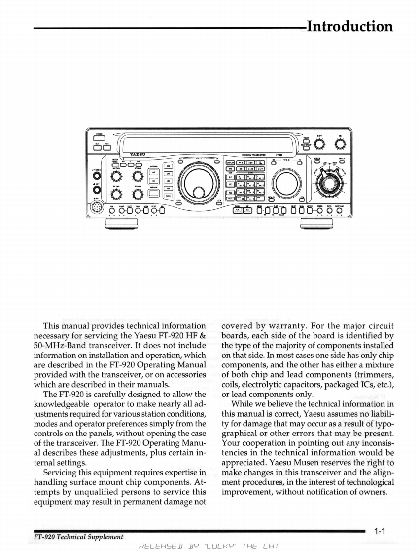 YAESUFT-920HF 50-MHz-BandTransceiverTechnical SupplementYAESU MUSEN CO.,LTD.1-20-2 Shimomaruko,Ota-Ku,Tokyo 146,JapanYAESU U.S.A.17210 Edwards Rd.,Cerritos,CA 90703,U.S.A.YAESU INTERNATIONAL DIVISION,(Caribbean,Mexico,Central So.America)7270 NW 12th St.,Suite 320,Miami,FL 33126,U.S.AYAESU EUROPE B.V.Snipweg 3,1118DN Schiphol,The NetherlandsYAESU UK LTD.Unit 2,Maple Grove Business Centre,Lawrence Rd.,Hounslow,Middlesex,TW4 6DR,U.K.⊙血0000660δ65YAESU GERMANY GmbHAm Kronberger Hang 2,D-65824 Schwalbach,GermanyYAESU HK LTD.Downloaded by11th Floor Tsim Sha Tsui Centre,66 Mody Rd.,Tsim Sha Tsui East,Kowloon,Hong KongRadioAmateur.EURELERSEI BY LUCKY THE CRT