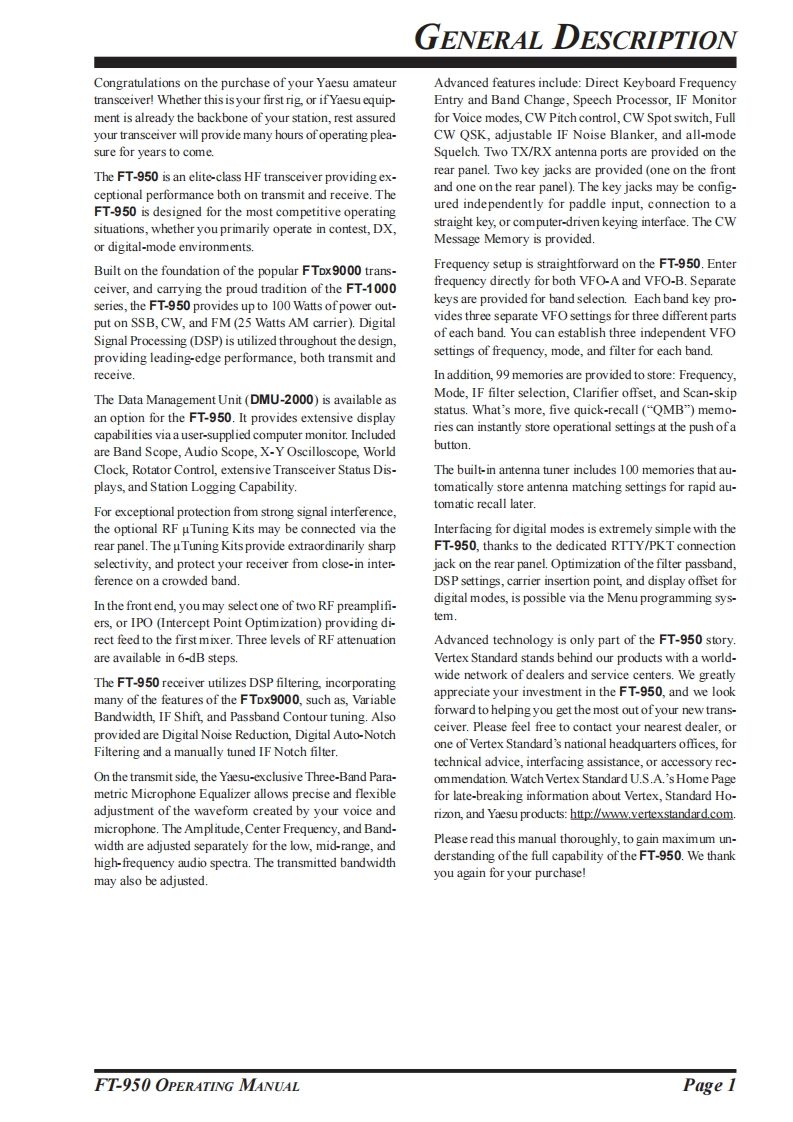 YAESUHF/50 MHz TRANSCEIVERFT-950OPERATINGMANUALT5·2:巴8-49500网引得■四VERTEX STANDARD CO.,LTD.4-8-8 Nakameguro,Meguro-Ku.Tokyo 153-8644.JapanVERTEX STANDARDUS Headquarters10900 Walker Street.Cypress.CA 90630.U.S.AYAESU EUROPE B.V.P.O.Box 75525,1118 ZN Schiphol,The NetherlandsYAESU UK LTD.Unit 12,Sun Valley Business Park,Winnall CloseWinchester.Hampshire.SO23 OLB.U.K.VERTEX STANDARD HK LTD.Unit 5,20/F.,Seaview Centre,139-141 Hoi Bun Road,Kwun Tong,Kowloon,Hong KongVERTEX STANDARD(AUSTRALIA)PTY.,LTD.Normanby Business Park,Unit 14/45 Normanby RoadNotting Hill 3168,Victoria,Australia