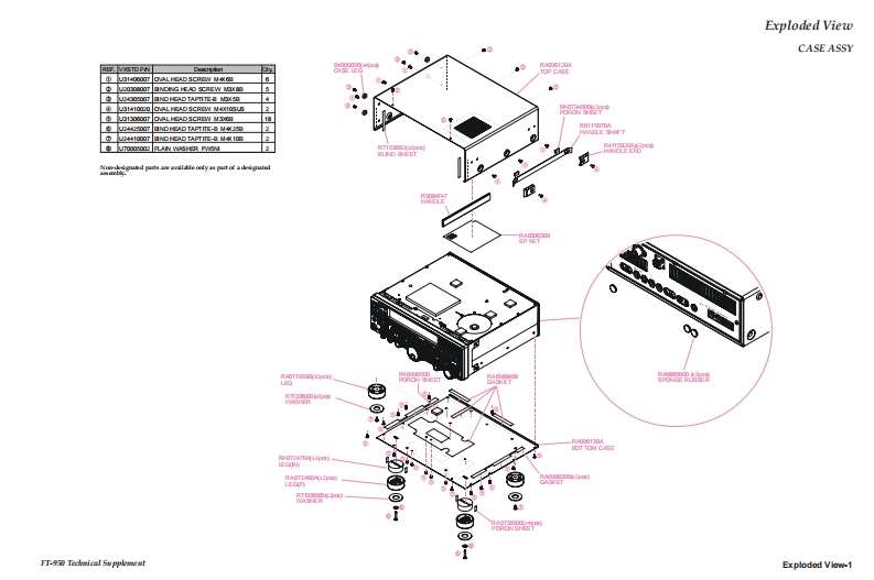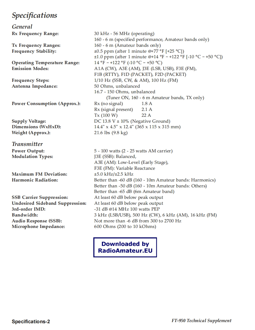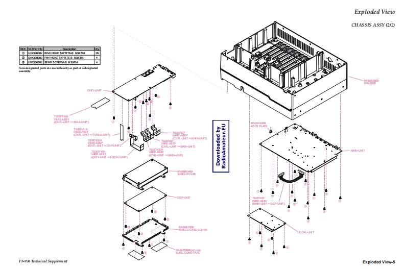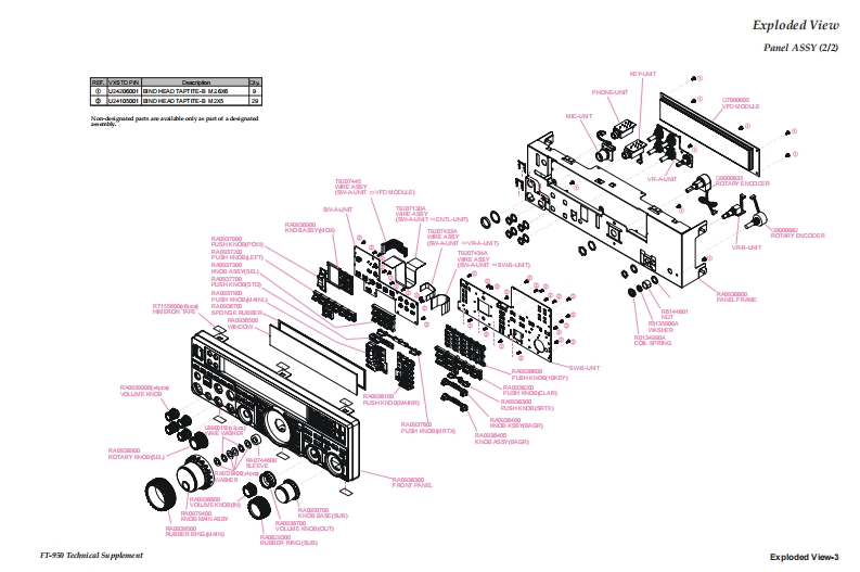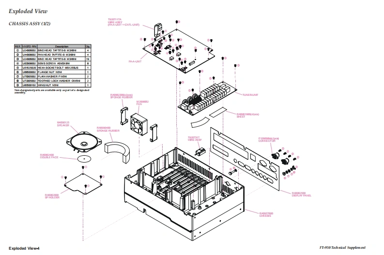 VERTEX STANDARD CO.,LTD.YAESU4-8-8 Nakameguro,Meguro-Ku,Tokyo 153-8644,JapanVERTEXSTANDARDUS Hea1090Waet CypresCA U..AFT.950YAESU EUROPE B.V.P.O.Box 75525,1118 ZN Schiphol,The NetherlandsYAESU UK LTD.Technical supplementme8nYg8g38ǜCloseVERTEXSTANDARDHK LTD.Unit 5,20/F.,Seaview Centre,139-141 Hoi Bun Road,Kwun Tong,Kowloon,Hong KongO2007 VERTEX STANDARD CO.,LTDVERTEX STANDARD(AUSTRALIA)PTY.,LTD.EHO31H90ANormanby Business Park,Unit 14/45 Normanby RoadNotting Hill 3168,Victoria,AustraliaContents49500IntroductionSpecificationsExploded ViewBlock DiagramConnection DiagramWIRE ASSY ListIntroductionAlignmentThis manual provides technical information neces-Board Unit (Schematics,Layouts Parts)sary for servicing the FT-950 HF/50 MHz Trans-MAIN Unitceiver.CNTL UnitServicing this equipment requires expertise in han-LOCAL Unitdling surface-mount chip components.Attempts bynon-qualified persons to service this equipmentPA-A Unitmay result in permanent damage not covered byTUNER Unitthe warranty,and may be illegal in some countries.DSP UnitTwo PCB layout diagrams are provided for eachSW-A Unitdouble-sided circuit board in the Transceiver.EachSW-B Unitside of is referred to by the type of the majority ofcomponents installed on that side("leaded"or"chip-VR-A Unitonly").In most cases one side has only chip com-VR-B Unitponents,and the other has either a mixture of bothPHONE Unitchip and leaded components(trimmers,coils,elec-MIC Unittrolytic capacitors,ICs,etc.),or leaded componentsKEY Unitonly.While we believe the technical information in thisDVS-6 Unit (Option)manual to be correct,VERTEX STANDARD as-sumes no liability for damage that may occur as aresult of typographical or other errors that may beDownloaded bypresent.Your cooperation in pointing out any in-RadioAmateur.EUconsistencies in the technical information would beappreciated.Important NoteThis transceiver was assembled using Pb (lead)free solder,based on the RoHS specification.Only lead-free solder(Alloy Composition:Sn-3.0Ag-0.5Cu)should be used for repairs performed on this apparatus.The solderstated above utilizes the alloy composition required for compliance with the lead-free specification,and any solder with theabove alloy composition may be used.